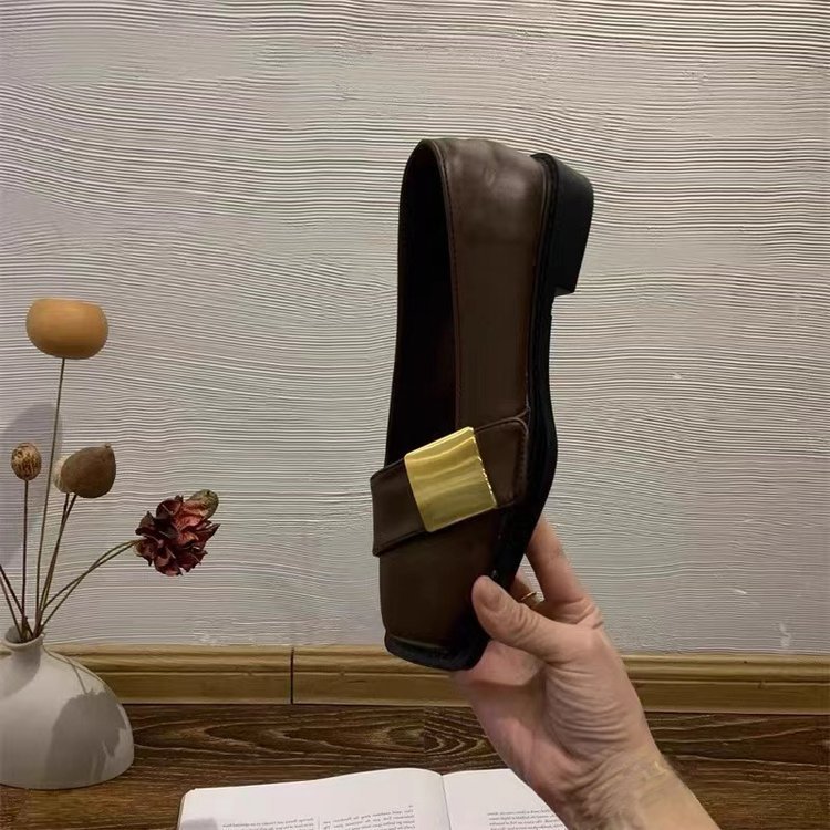 2024 봄과 가을 새로운 금속 버클 스퀘어 헤드 플랫 신발 세련된 플랫 힐 소프트 하단 얕은 입 신발 여성용 신발