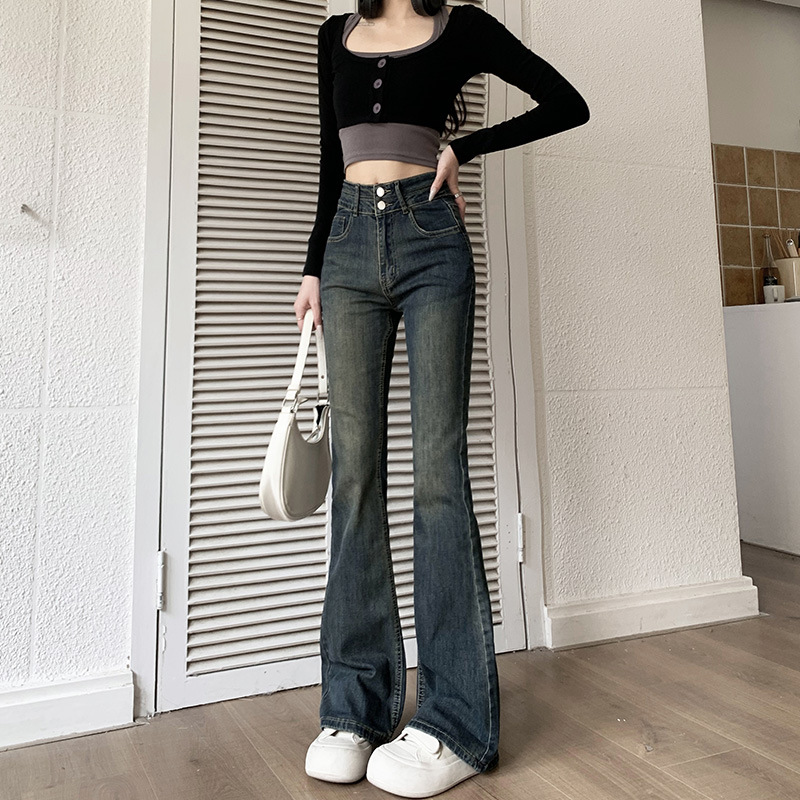여성을위한 시멘트 그레이 부츠컷 청바지 2024 새로운 스타일 작은 슬림 슬림 레트로 하이 웨이스트 플레어 바지 가을스토어 가기