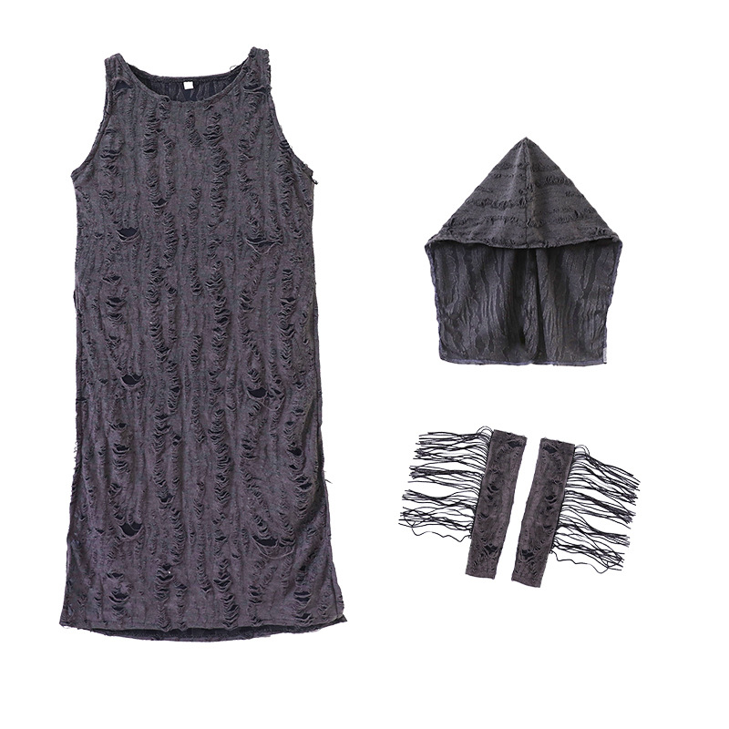 • 원피스 A554 다크 그레이 후드 폐기물 원피스 D01 술 소매
