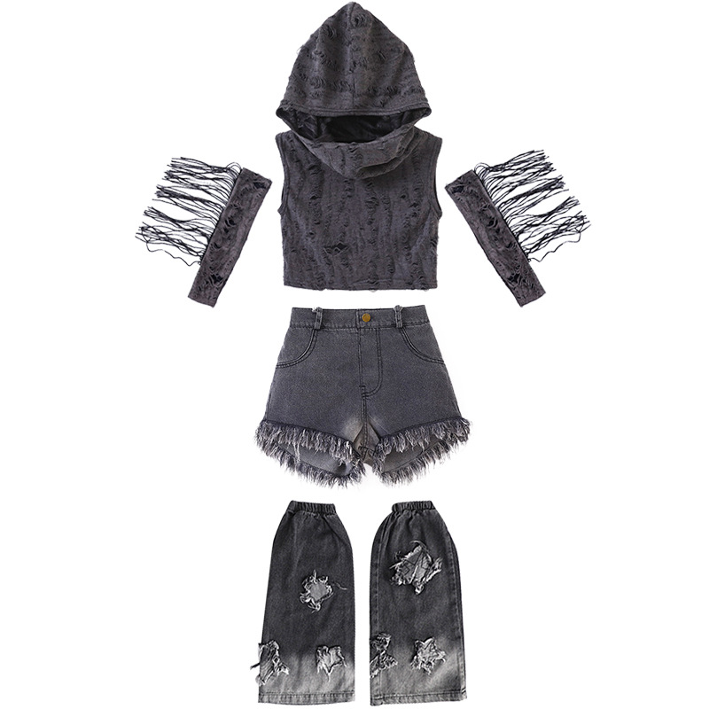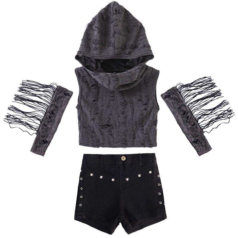 • A554 다크 그레이 후드 폐기물 원피스 B308 검은 반바지 D01 술 소매