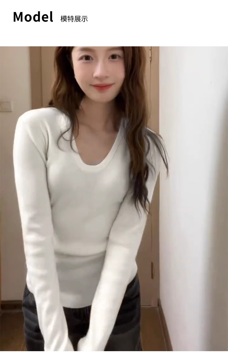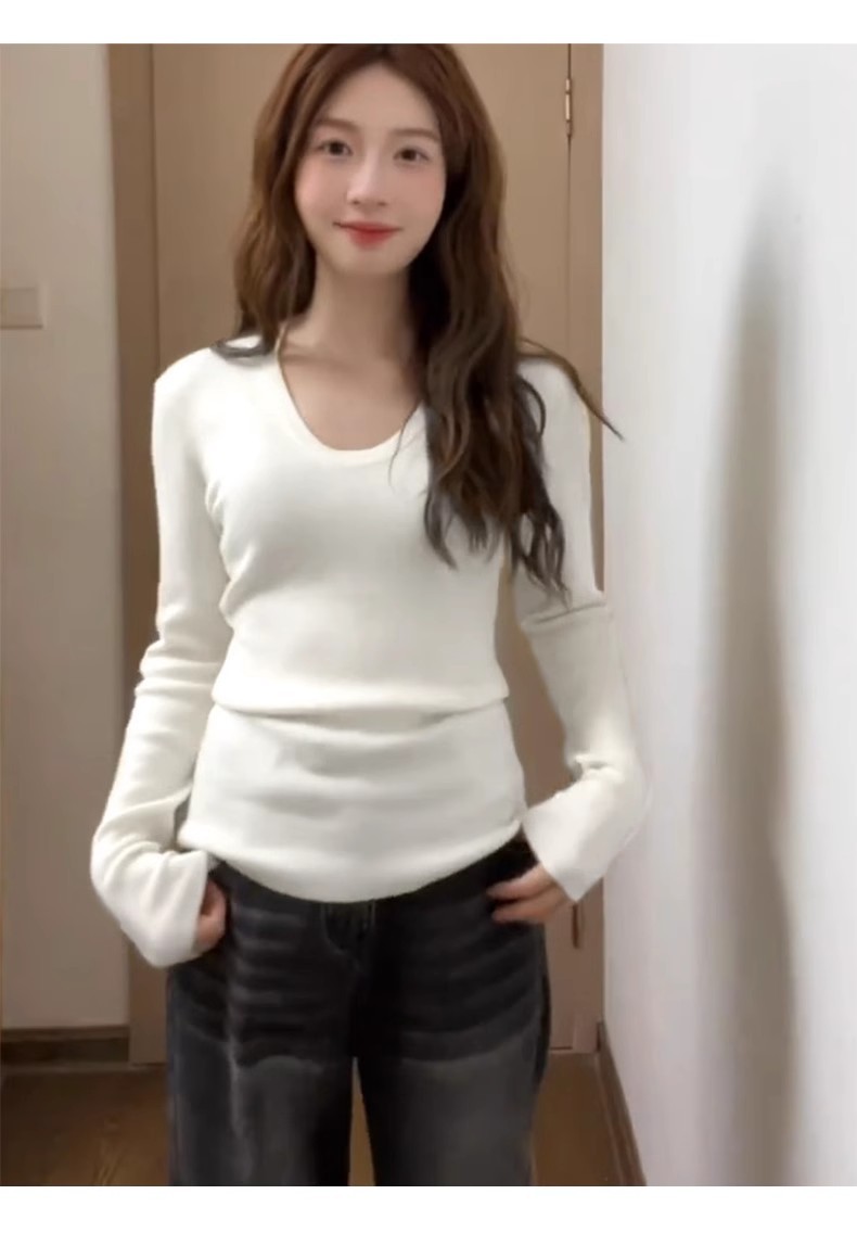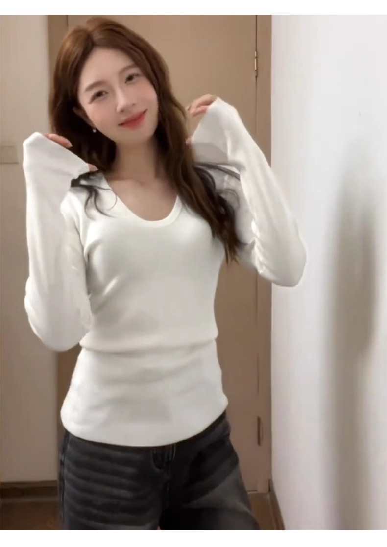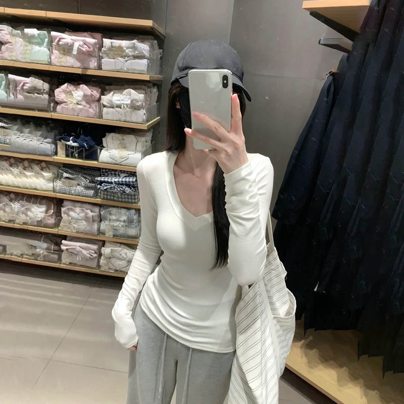 긴팔 티셔츠가있는 여성용 흰색 바닥 셔츠 2025 겨울 벨벳 슬림 피트 오른쪽 어깨 탑 라운드 넥 바닥 셔츠스토어 가기