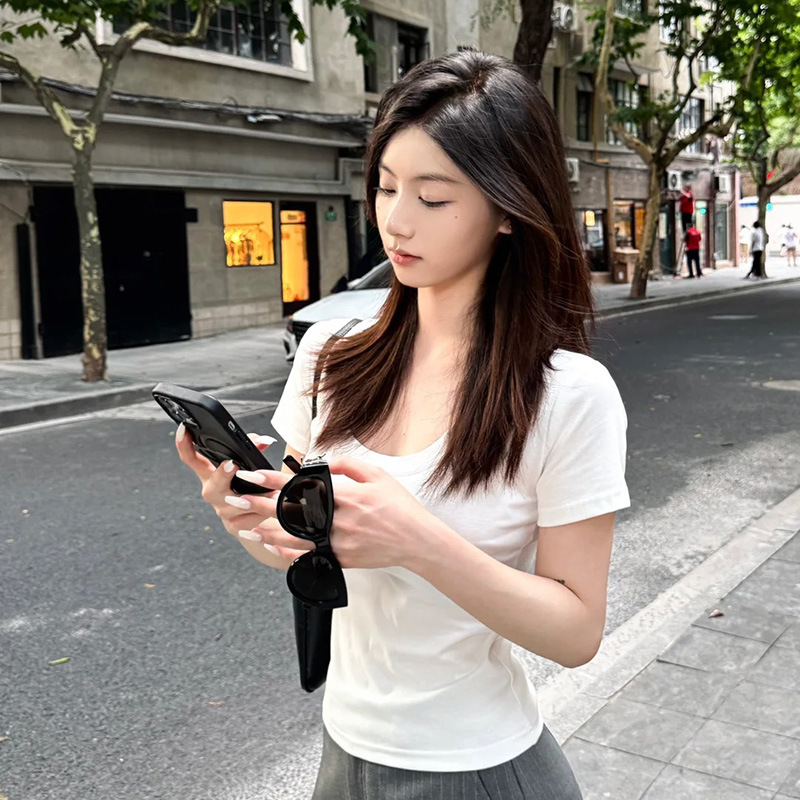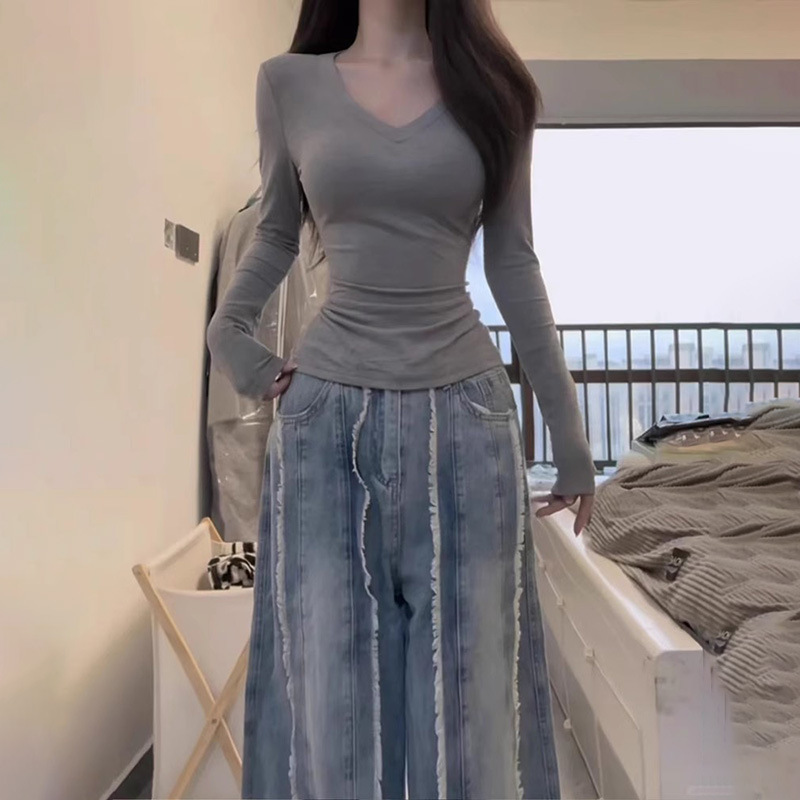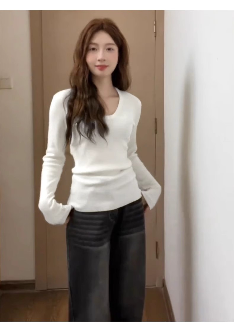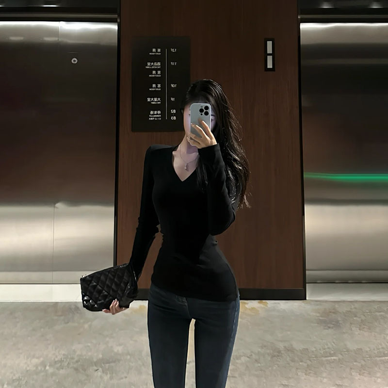 긴팔 티셔츠가있는 여성용 흰색 바닥 셔츠 2025 겨울 벨벳 슬림 피트 오른쪽 어깨 탑 라운드 넥 바닥 셔츠스토어 가기