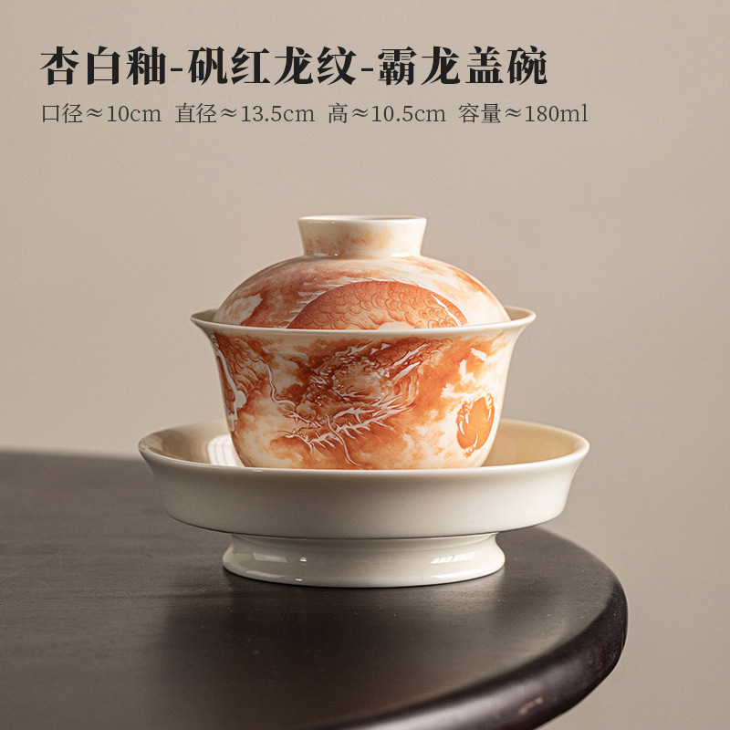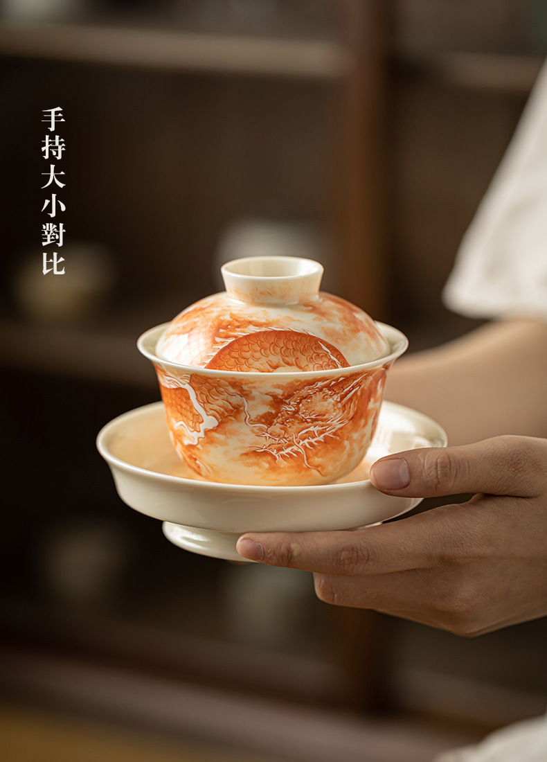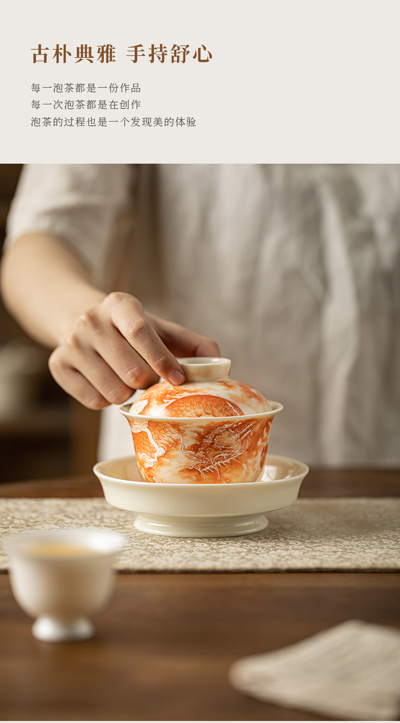 하오 란 살구색 화이트 유약 드래곤 패턴 3 캡 보울 티 컵 뚜껑 세라믹 쿵푸 티 세트 싱글 안티 스케일 티 볼
