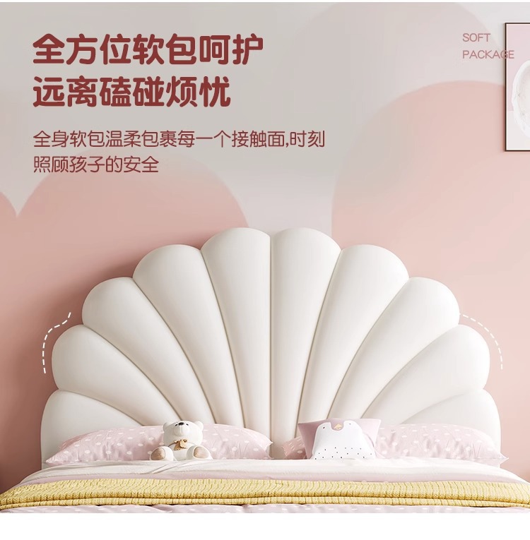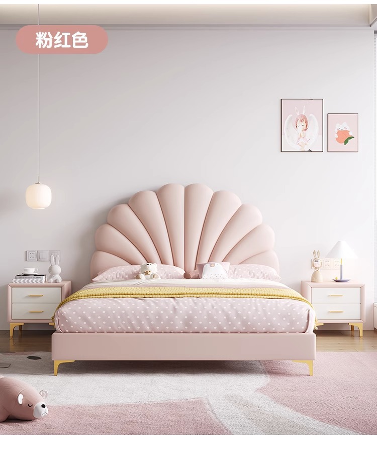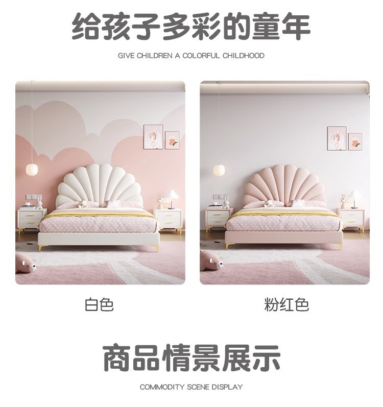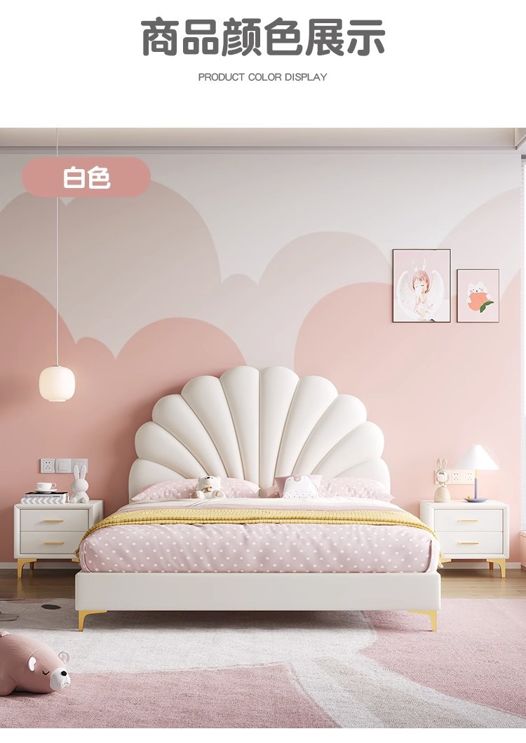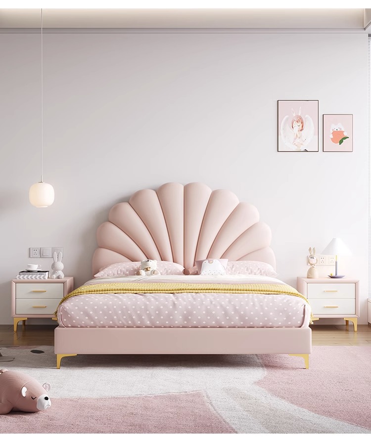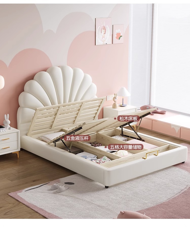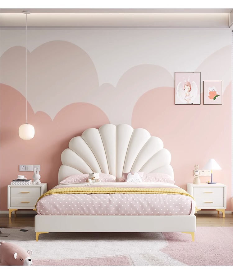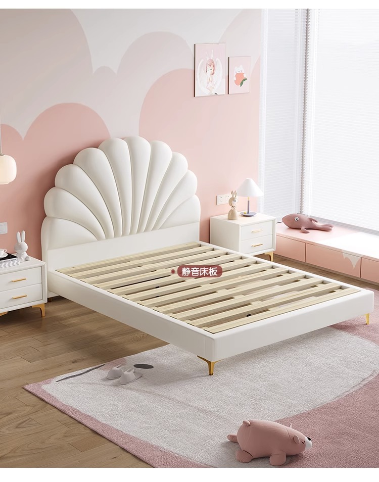 단단한 나무 어린이 방 침대 소녀 공주 방 간단한 현대 침실 부드러운 가죽 아트 크림 침대 스타일 꽃잎 더블 침대