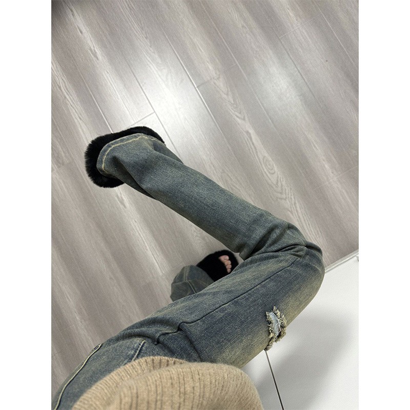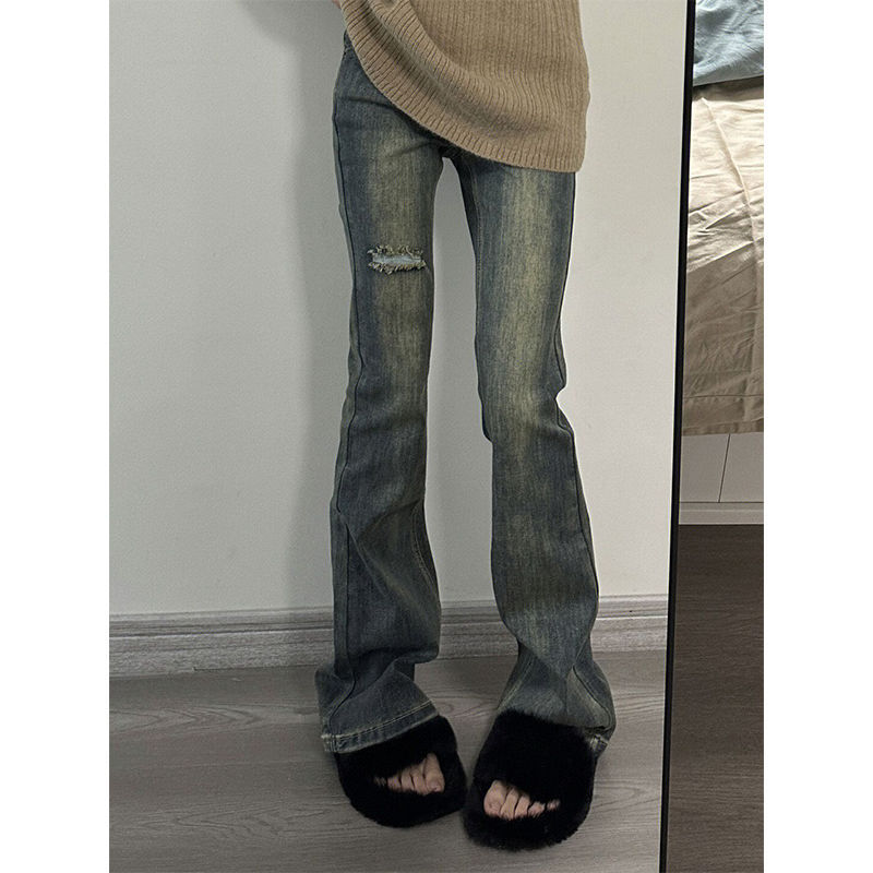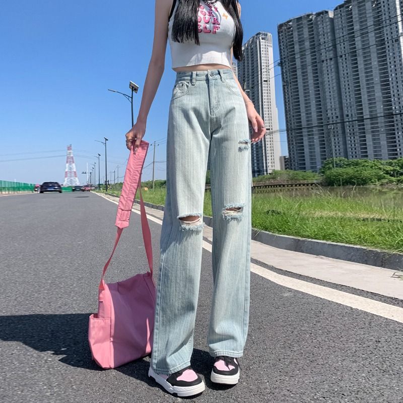 키가 큰 줄 175 레트로 블루 찢어진 마이크로 블러 진 여성용 스파이스 걸스 하이 웨이스트 슬림 룩 스트레이트 트럼펫 바지