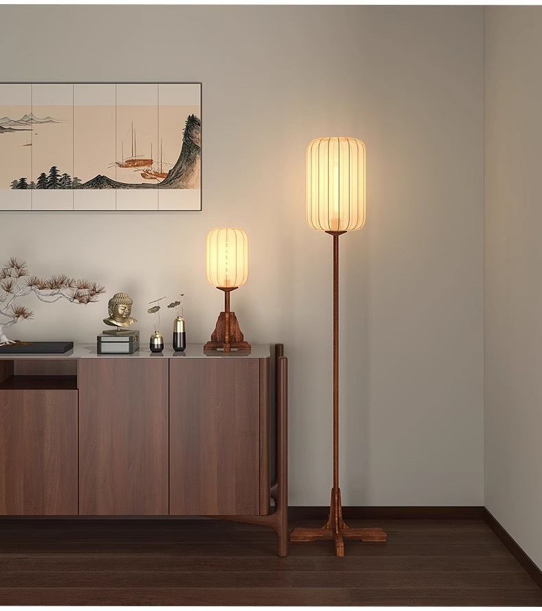 새로운 중국 바닥 램프 선티 룸 홈스테이 골동품 스터디 룸 침실 램프 빈티지 솔리드 우드 패브릭 테이블 램프