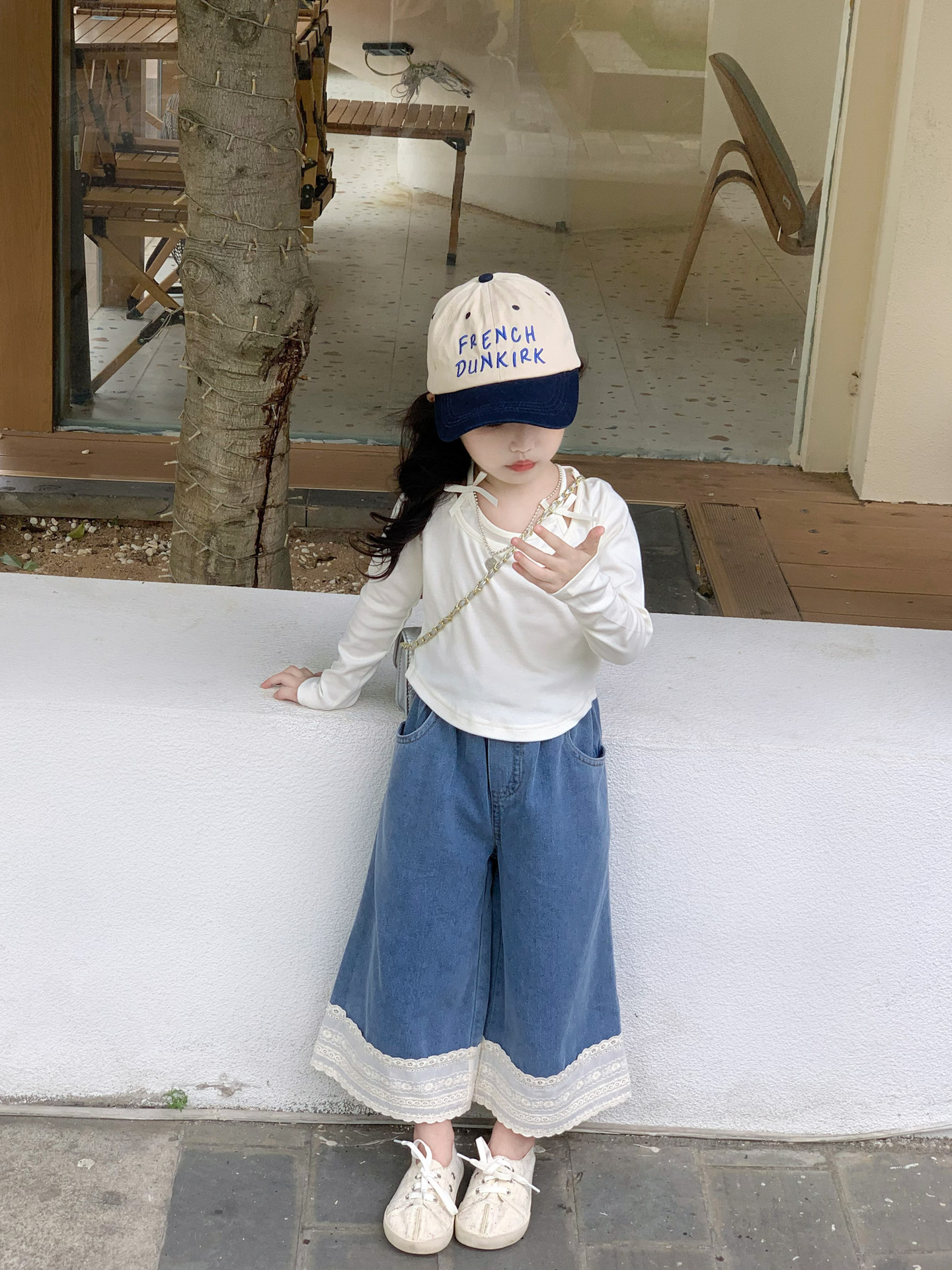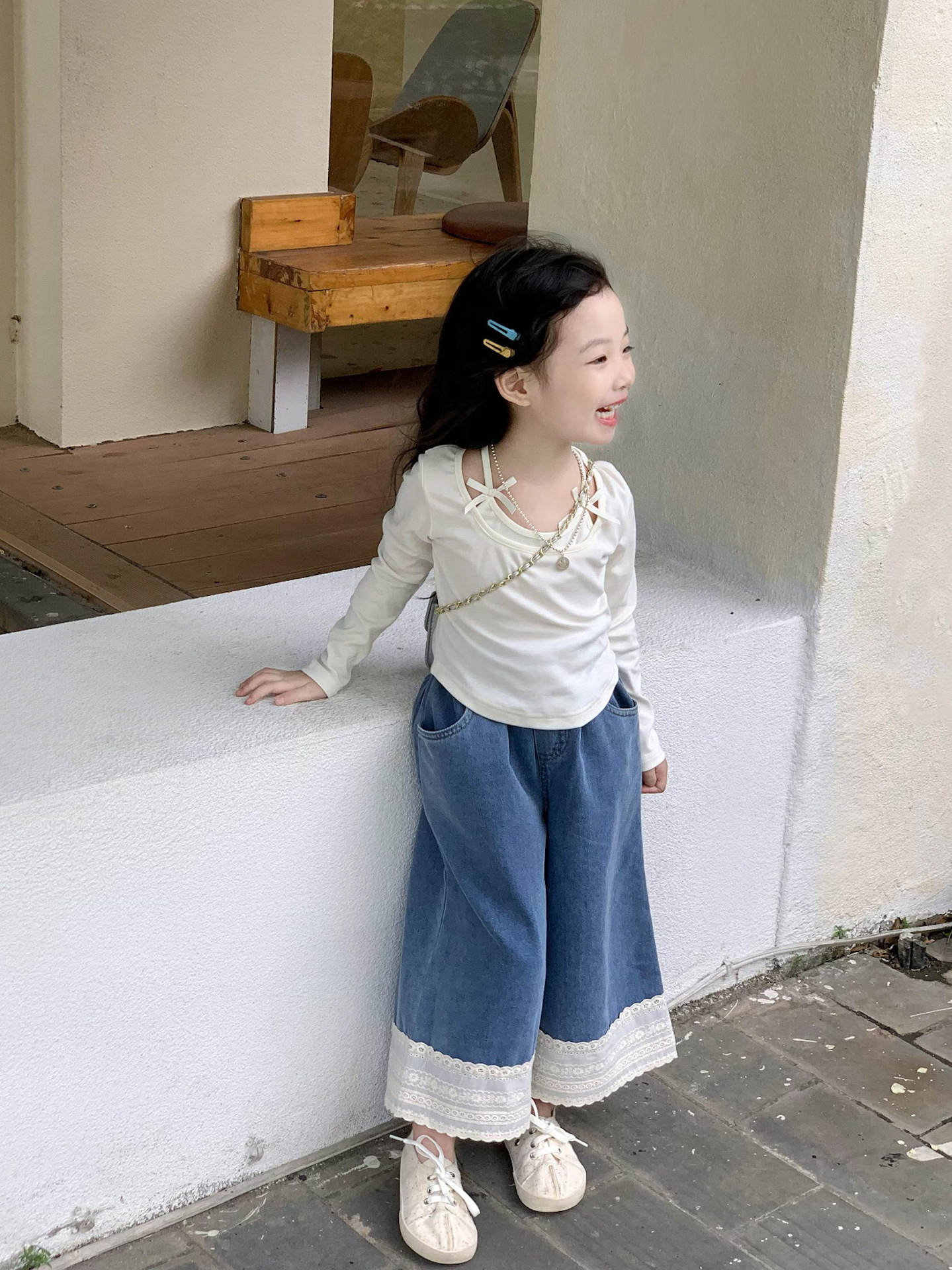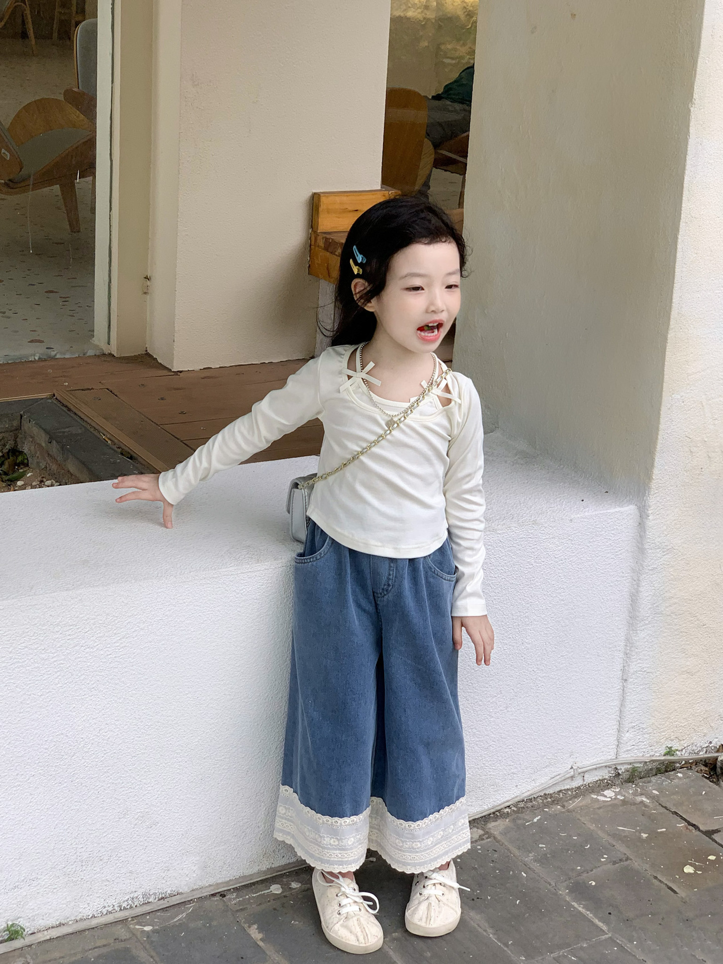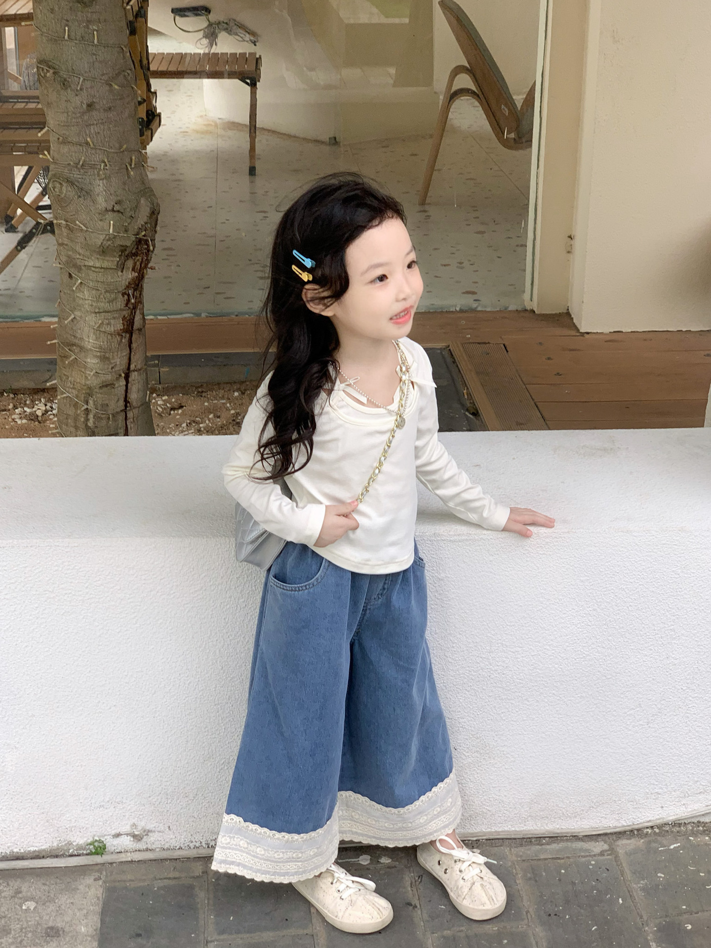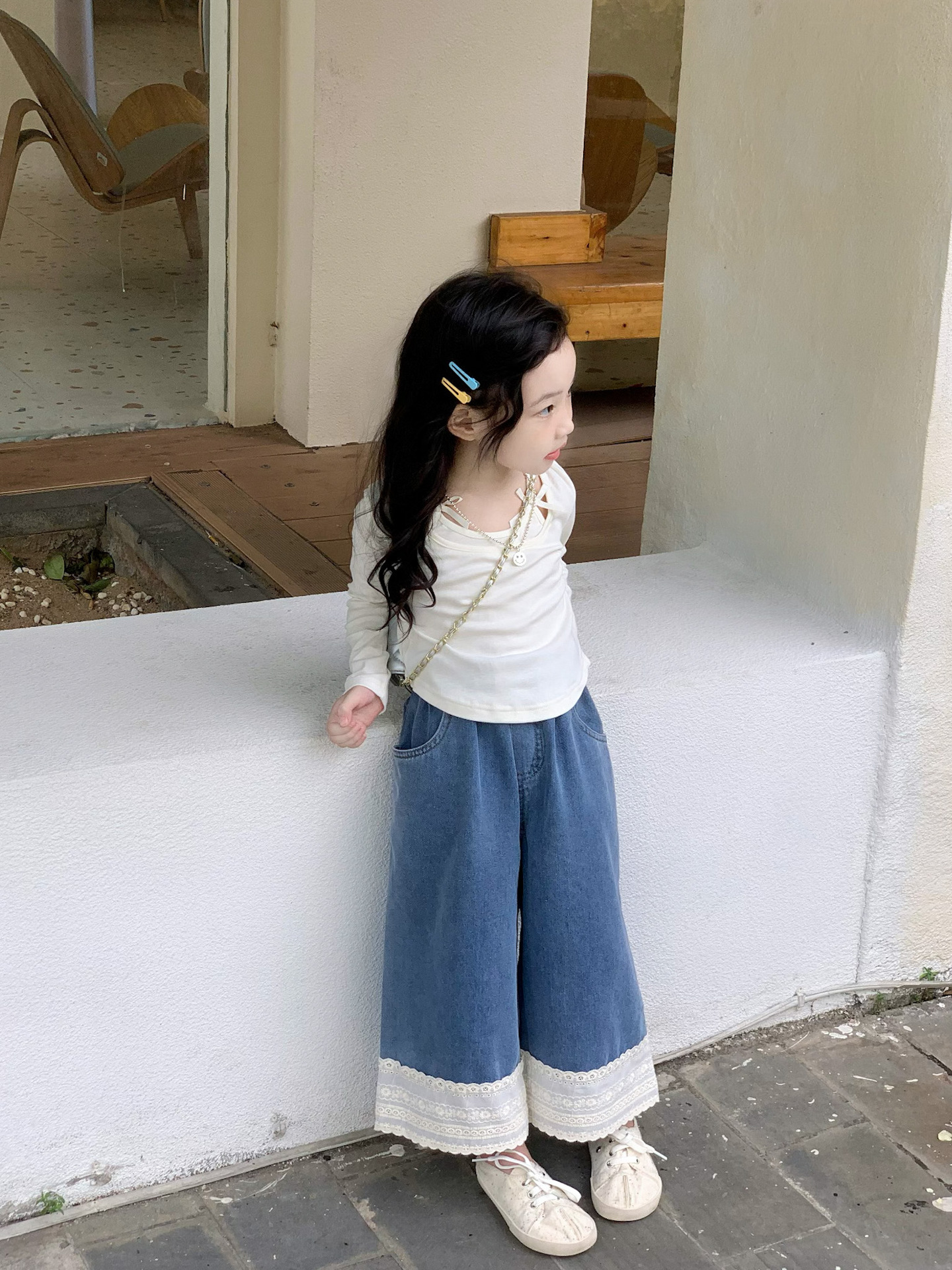 소녀 청바지 2024 가을 새로운 어린이 한국 스타일 레이스 데님 바지 어린이 넓은 다리 트렌디 바지스토어 가기