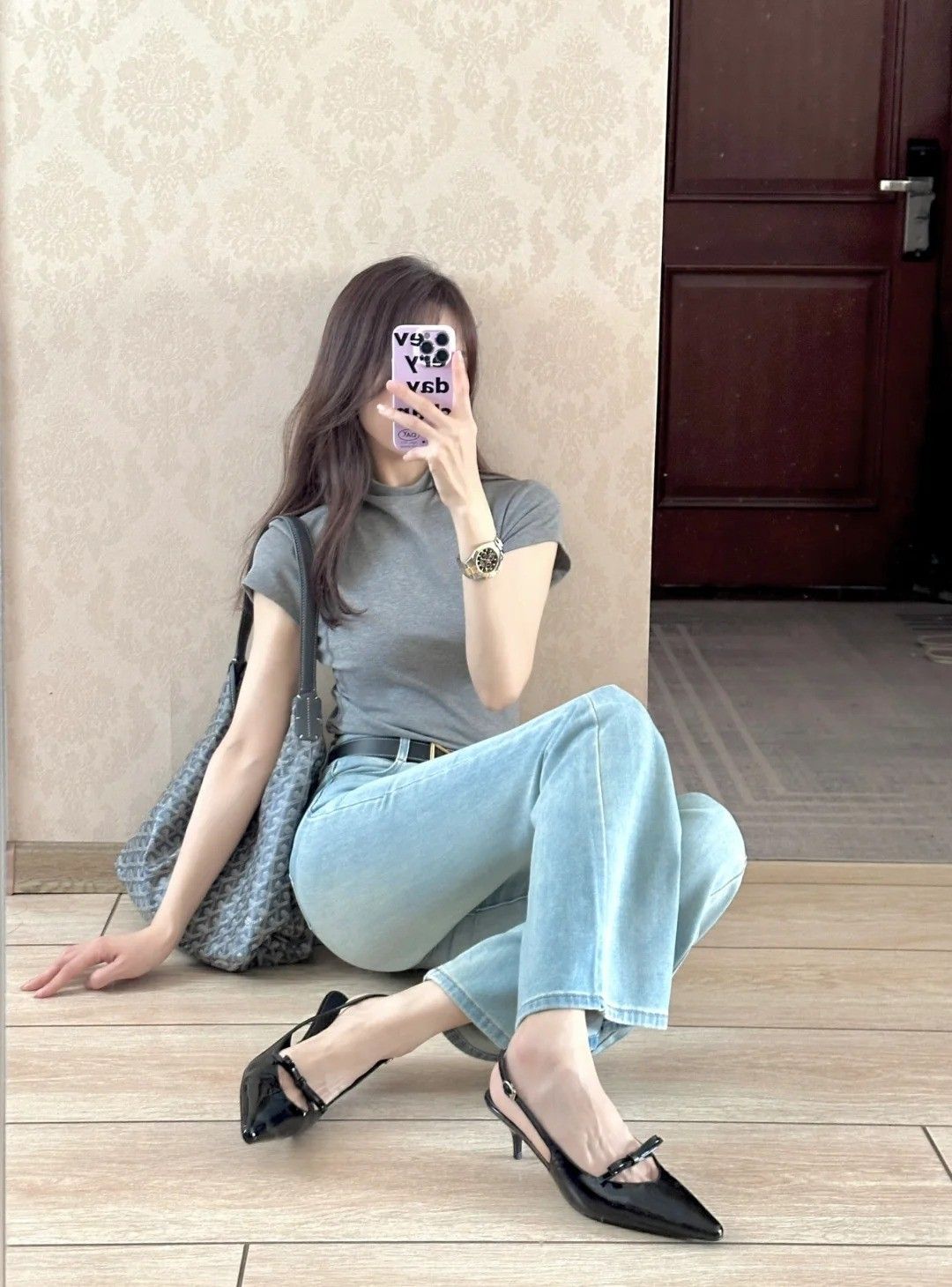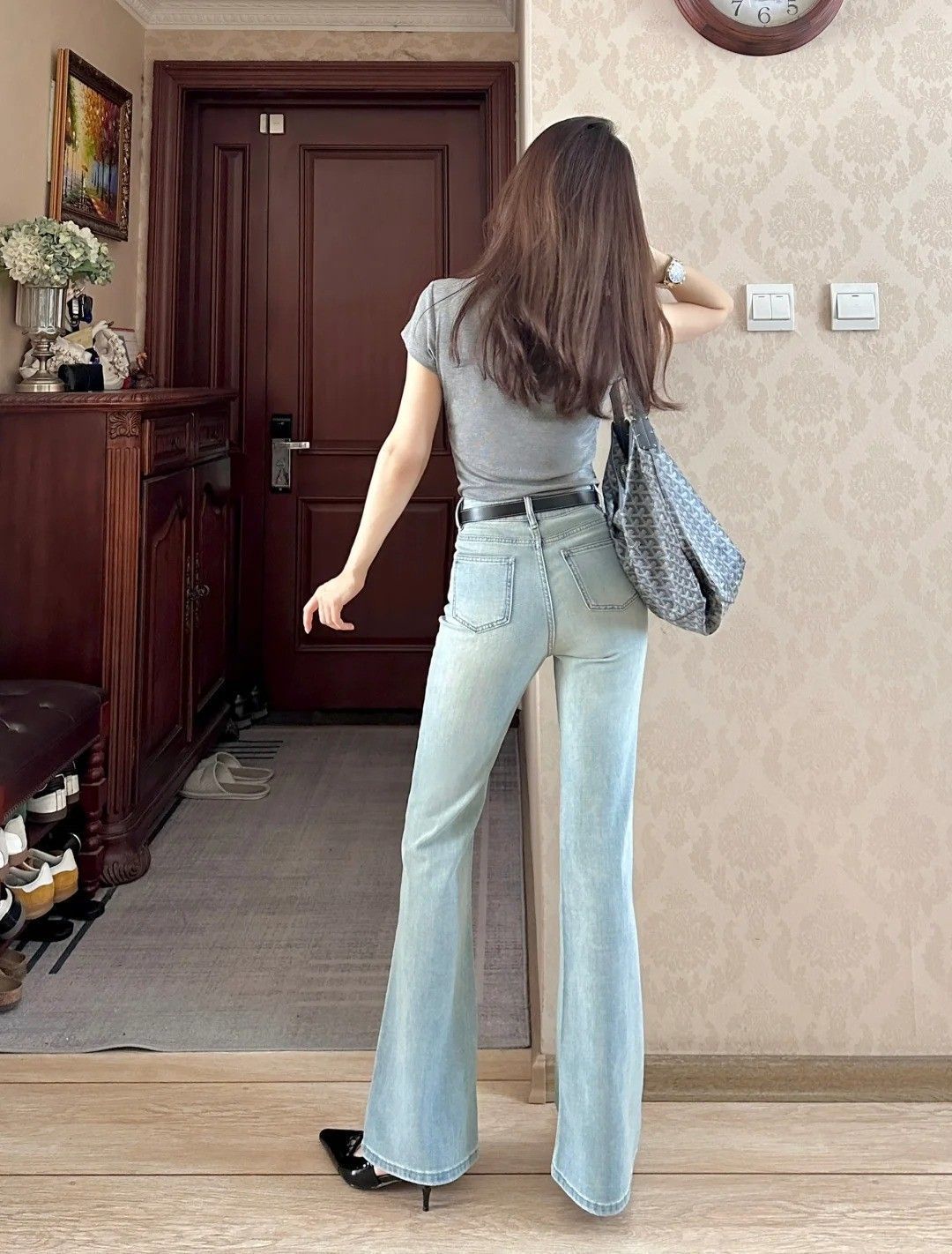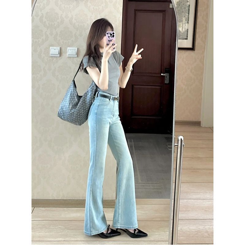 라이트 블루 마이크로 블리드 청바지 높은 허리 슬림 핏 2024 여름 새로운 스트레치 슬림 핏 마이크로 플레어 바지스토어 가기