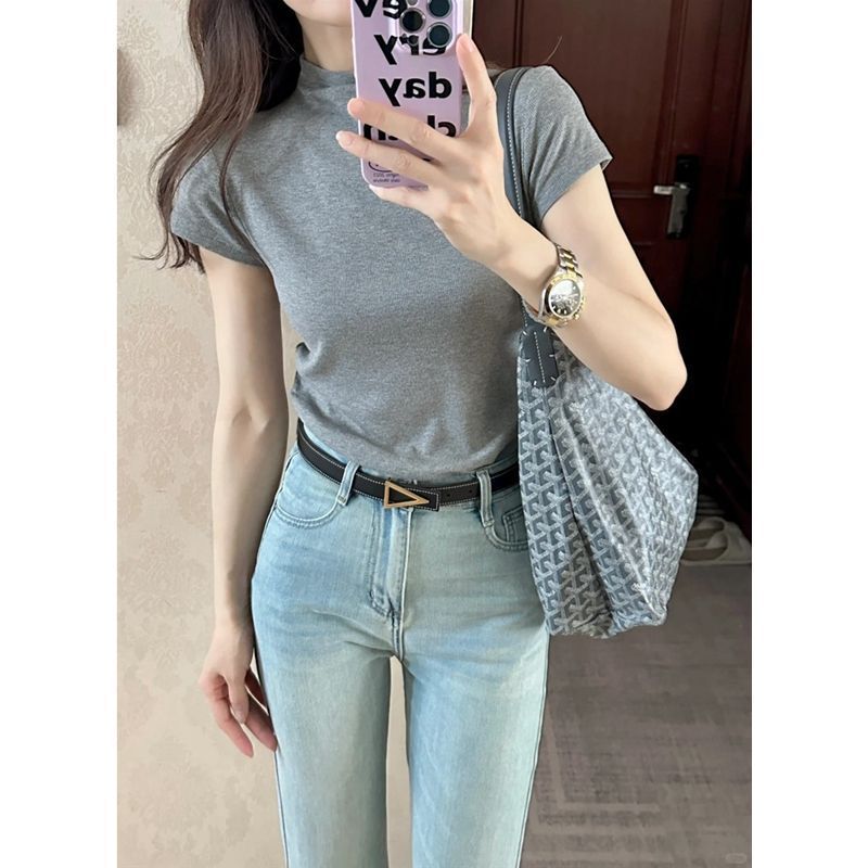 라이트 블루 마이크로 블리드 청바지 높은 허리 슬림 핏 2024 여름 새로운 스트레치 슬림 핏 마이크로 플레어 바지