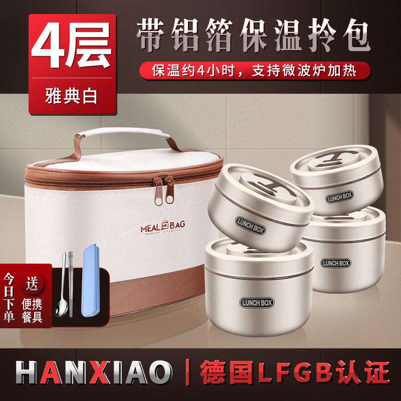 • [304 전자레인지 사용 가능 모델] 엘레강트 화이트 - 대형 600ml 2개 + 소형 440ml 2개 + 무료 식기 + 보온 가방