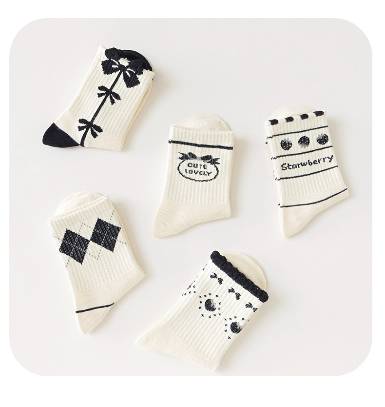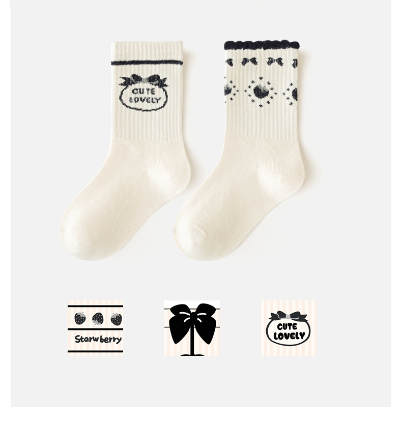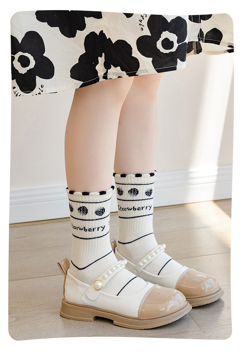 봄과 가을 소녀 양말 딸기 미드 튜브 양말 사계절 어린이 양말 높은 고무 스트랜드 양말은 검은 색과 흰색 어린이 양말