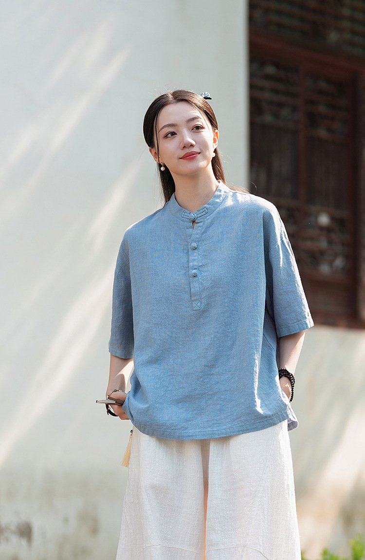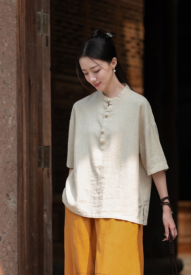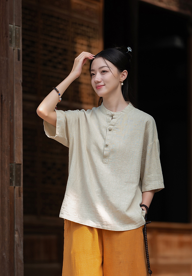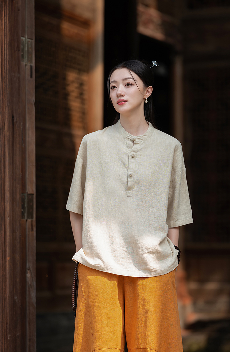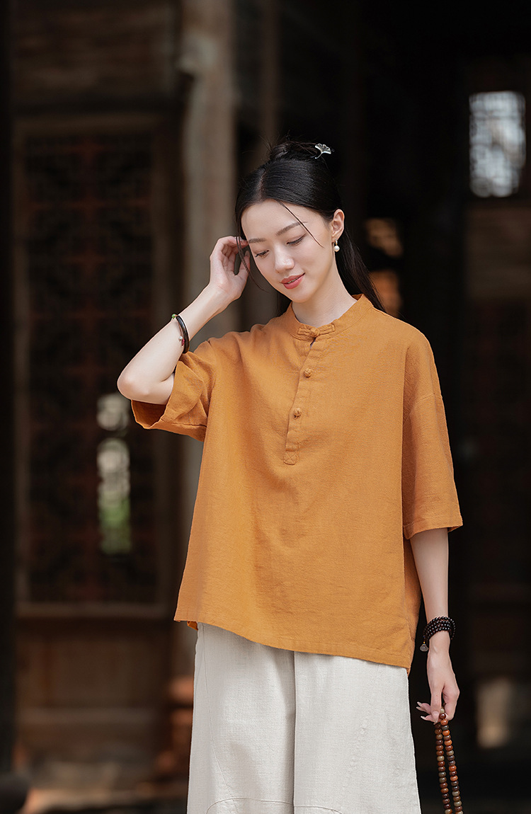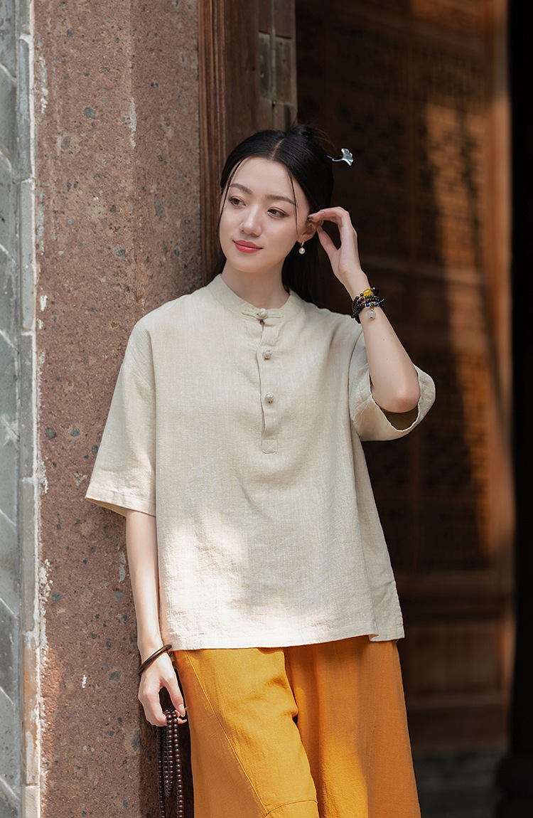 25 오리지널 코튼 및 린넨 여성용 모시 중국 스타일 복고풍 버튼 반팔 탑 여성용 선 스트리트 워시 코튼 및 린넨 셔츠스토어 가기
