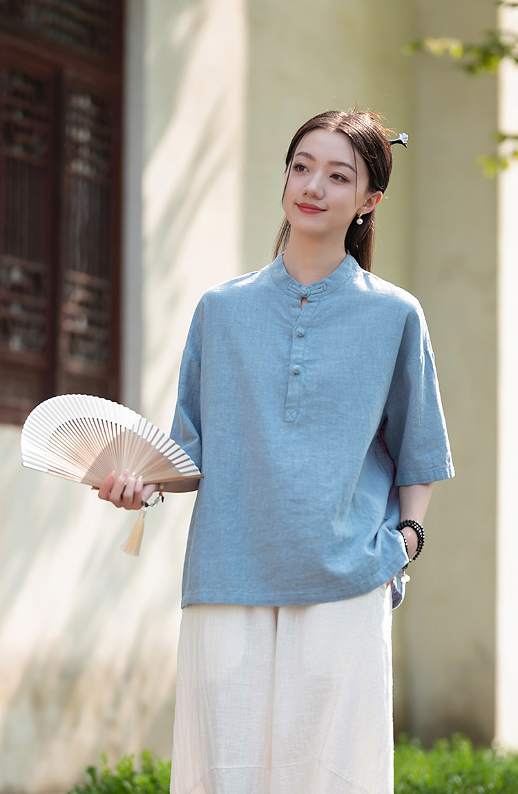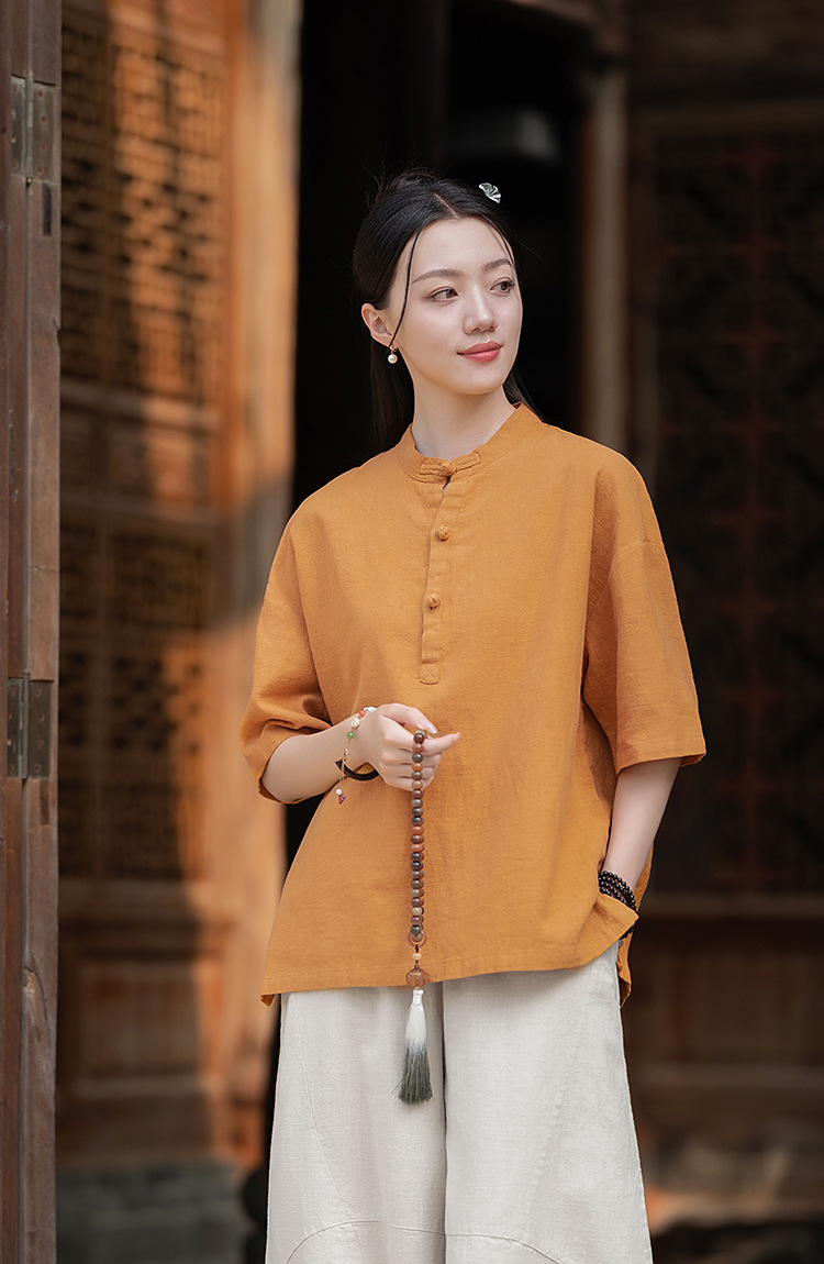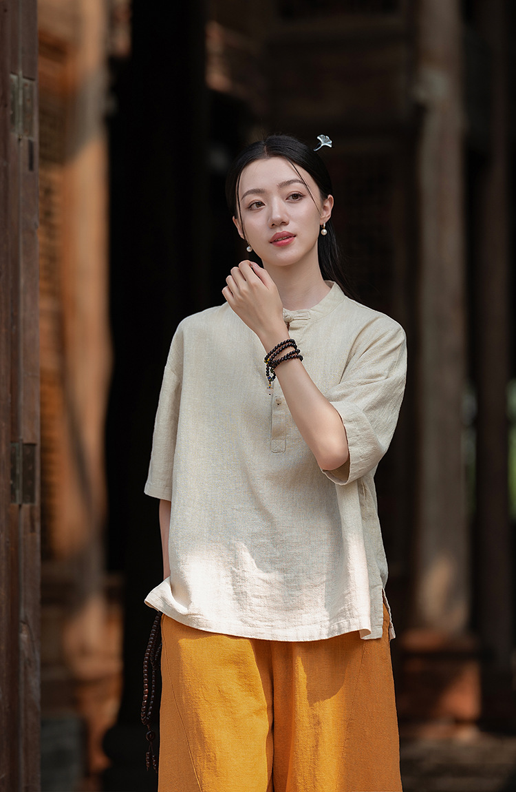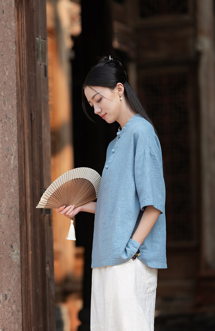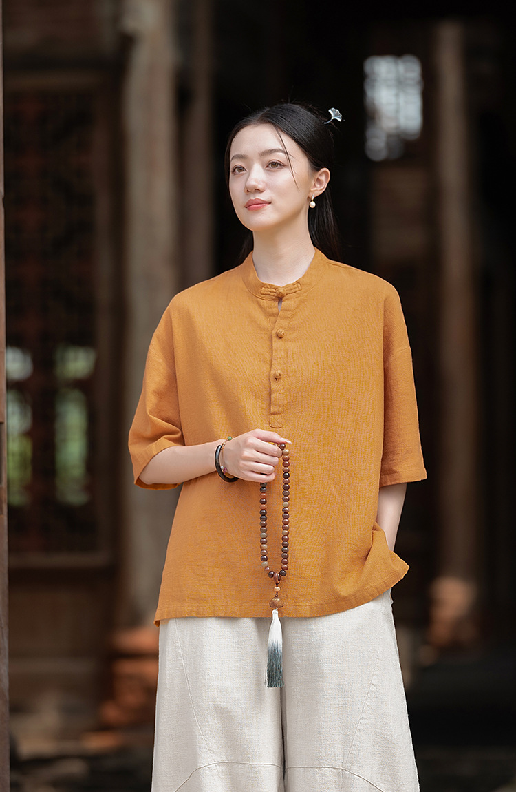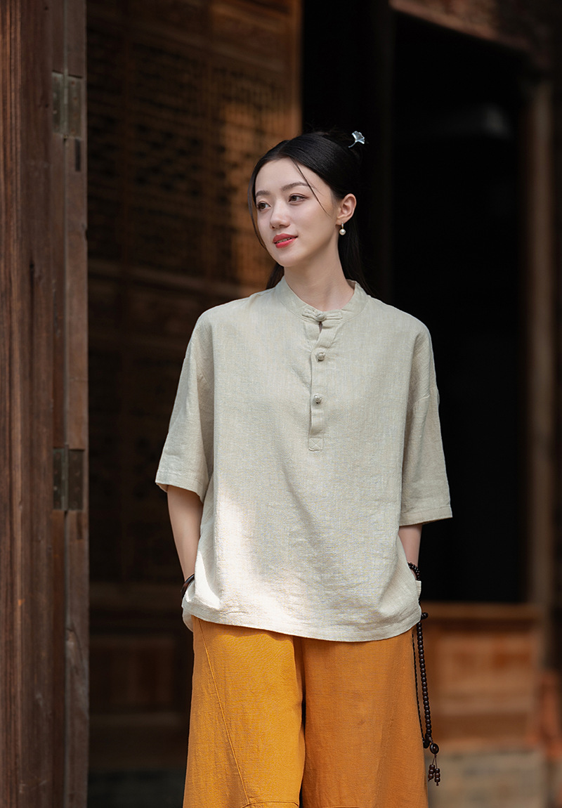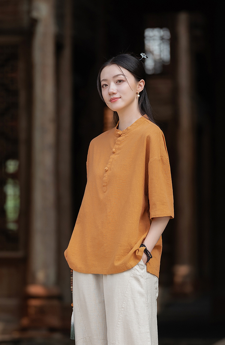 25 오리지널 코튼 및 린넨 여성용 모시 중국 스타일 복고풍 버튼 반팔 탑 여성용 선 스트리트 워시 코튼 및 린넨 셔츠스토어 가기