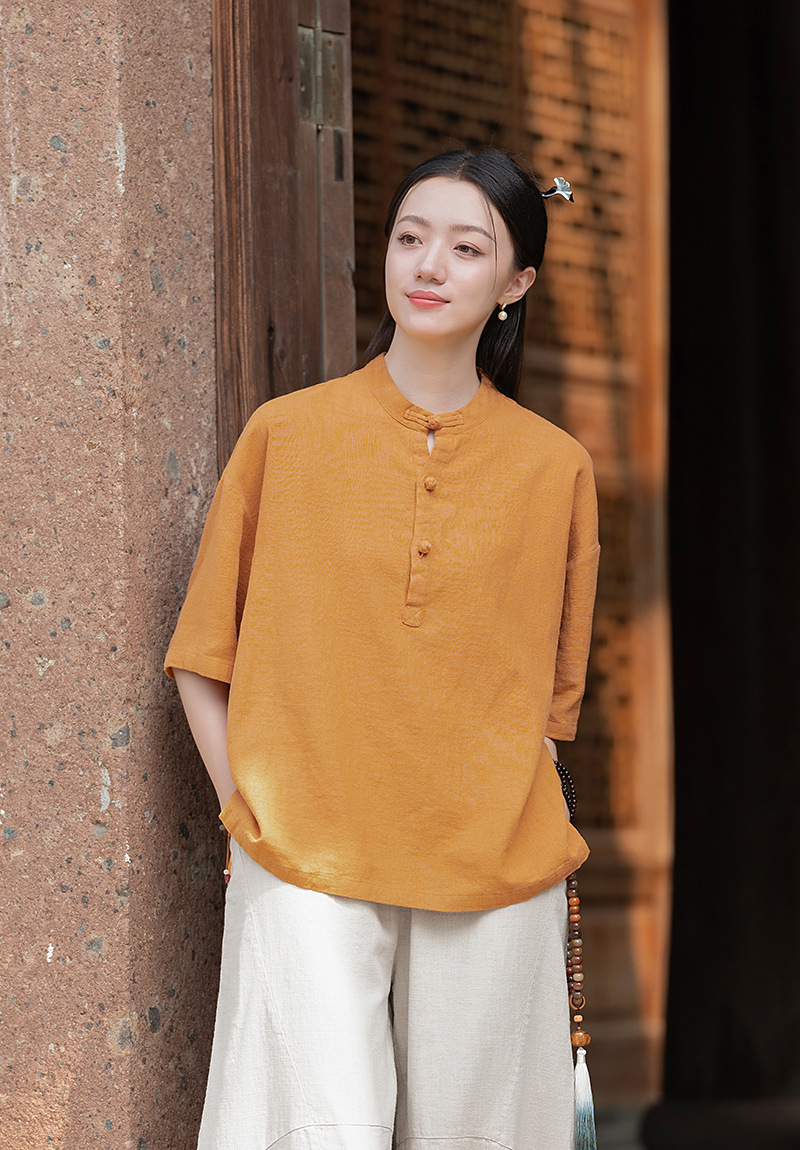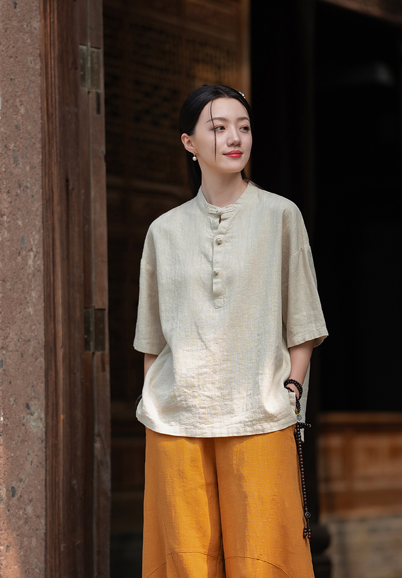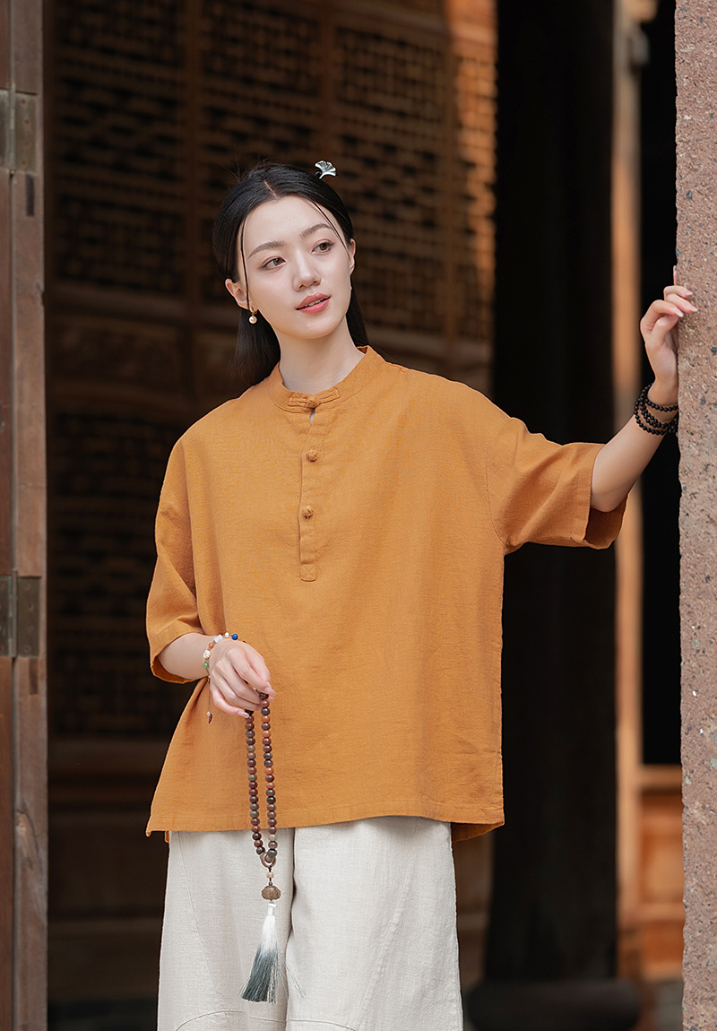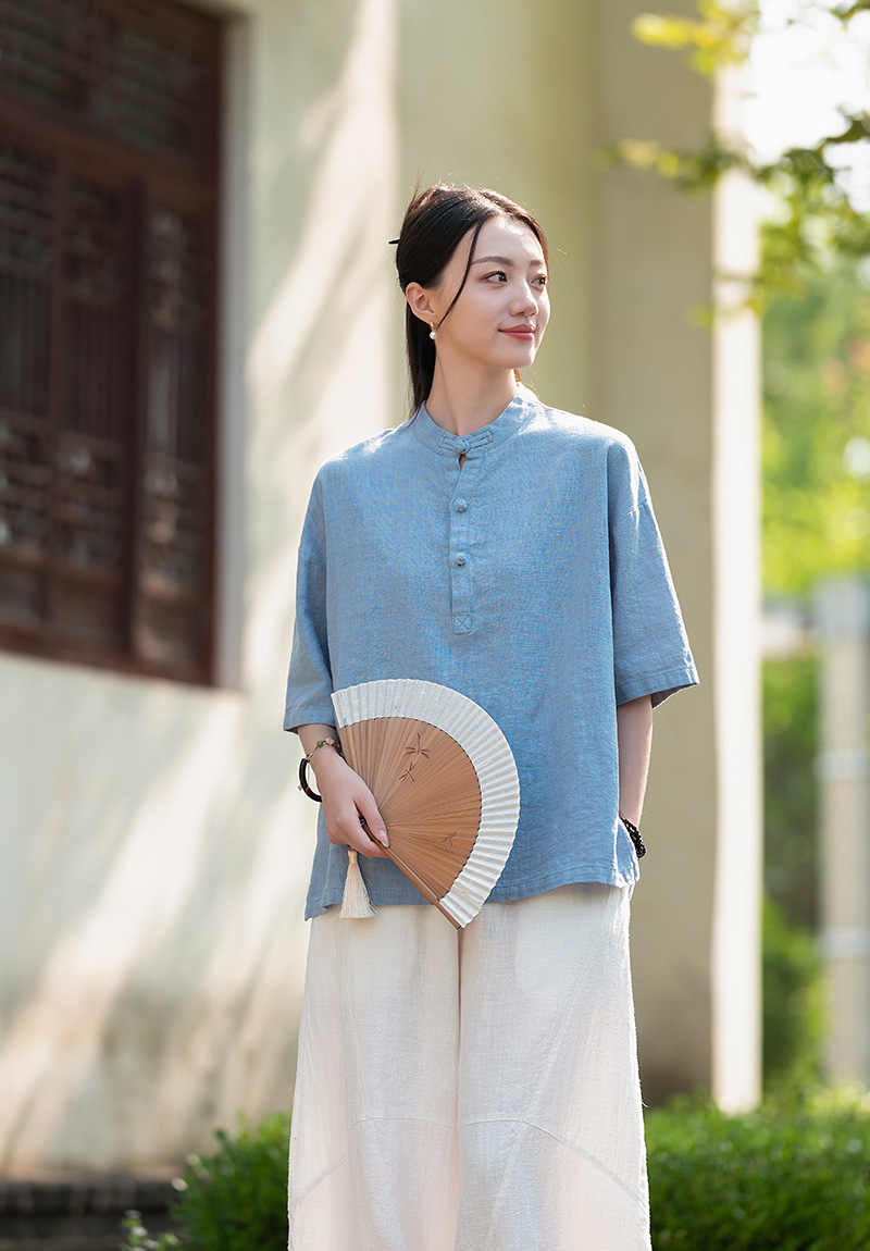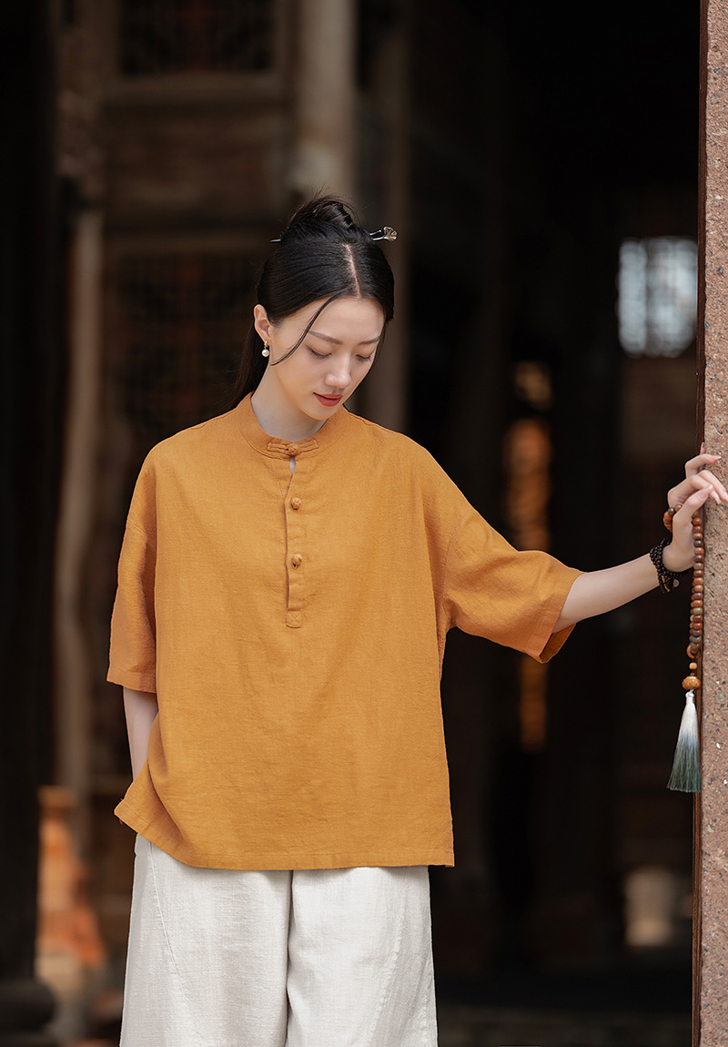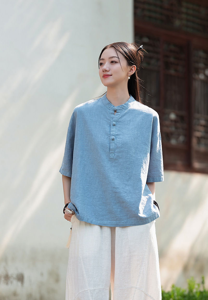 25 오리지널 코튼 및 린넨 여성용 모시 중국 스타일 복고풍 버튼 반팔 탑 여성용 선 스트리트 워시 코튼 및 린넨 셔츠스토어 가기