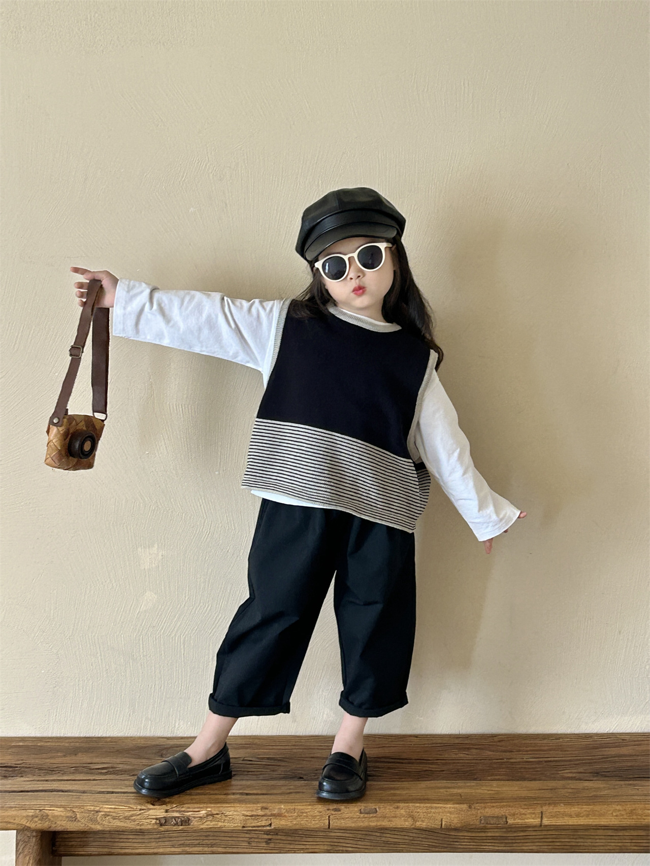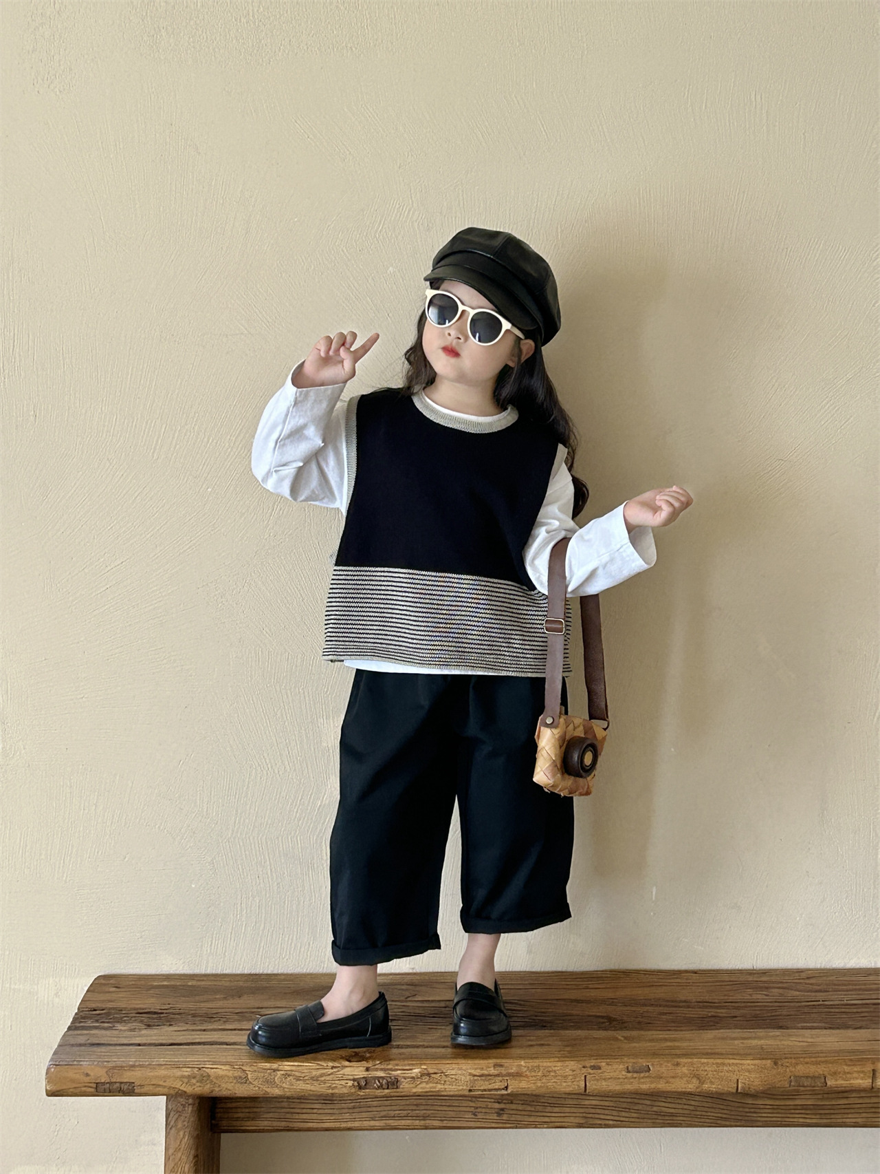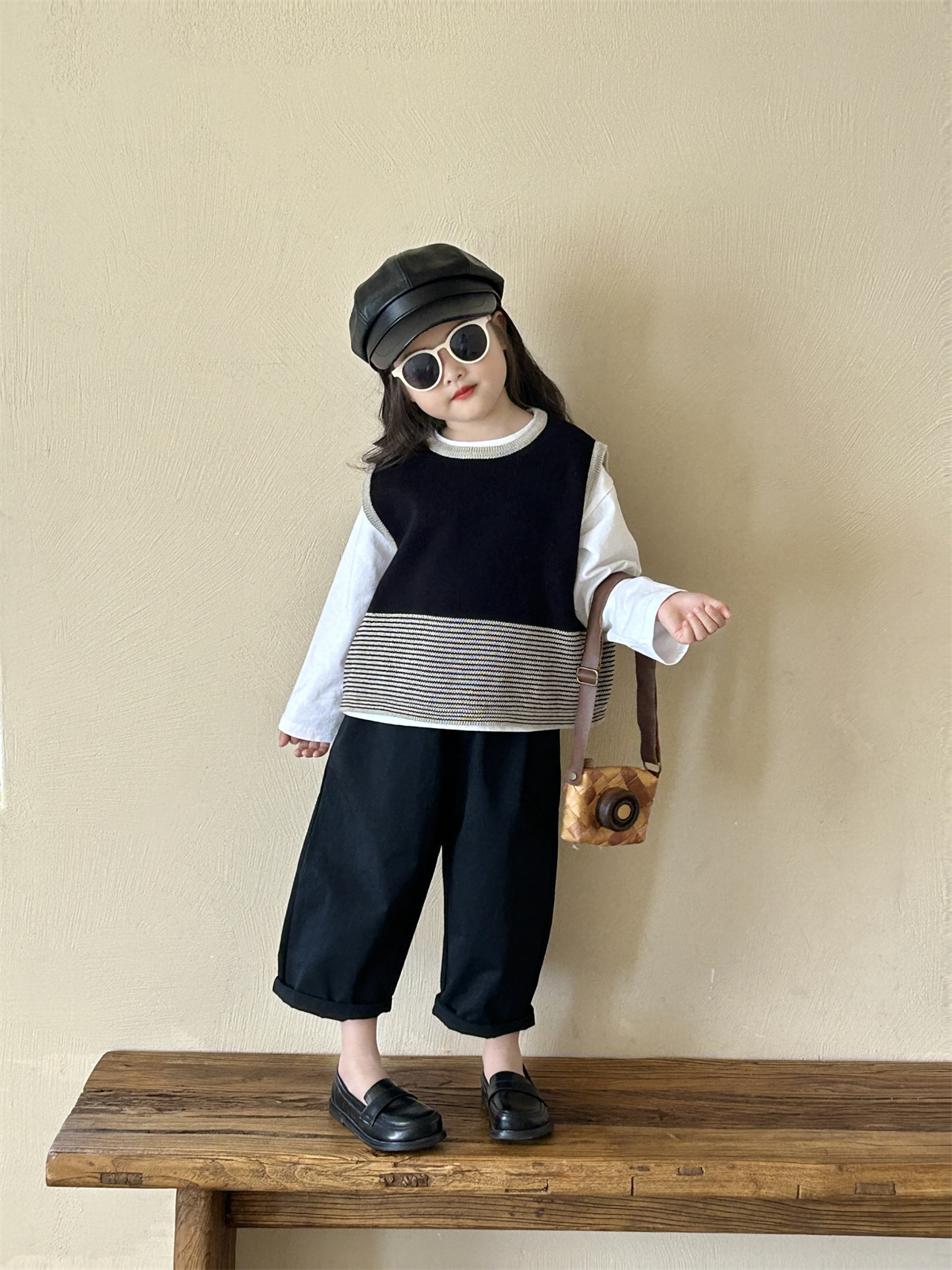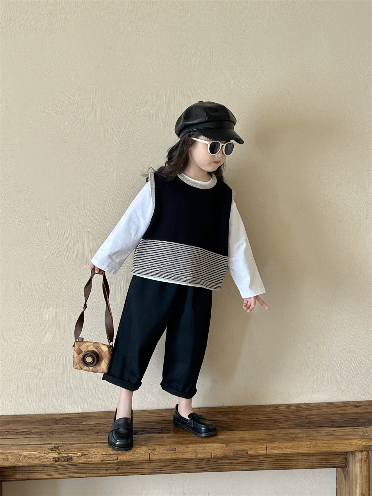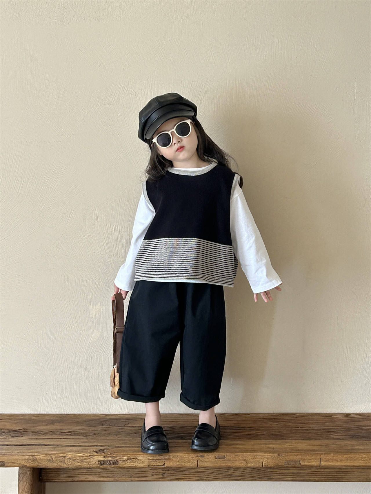 어린이 한국 스타일 스웨터 2025 봄, 가을 새로운 여자 의류 줄무늬 조끼 아기 풀오버 양모 조끼 캐주얼 바지