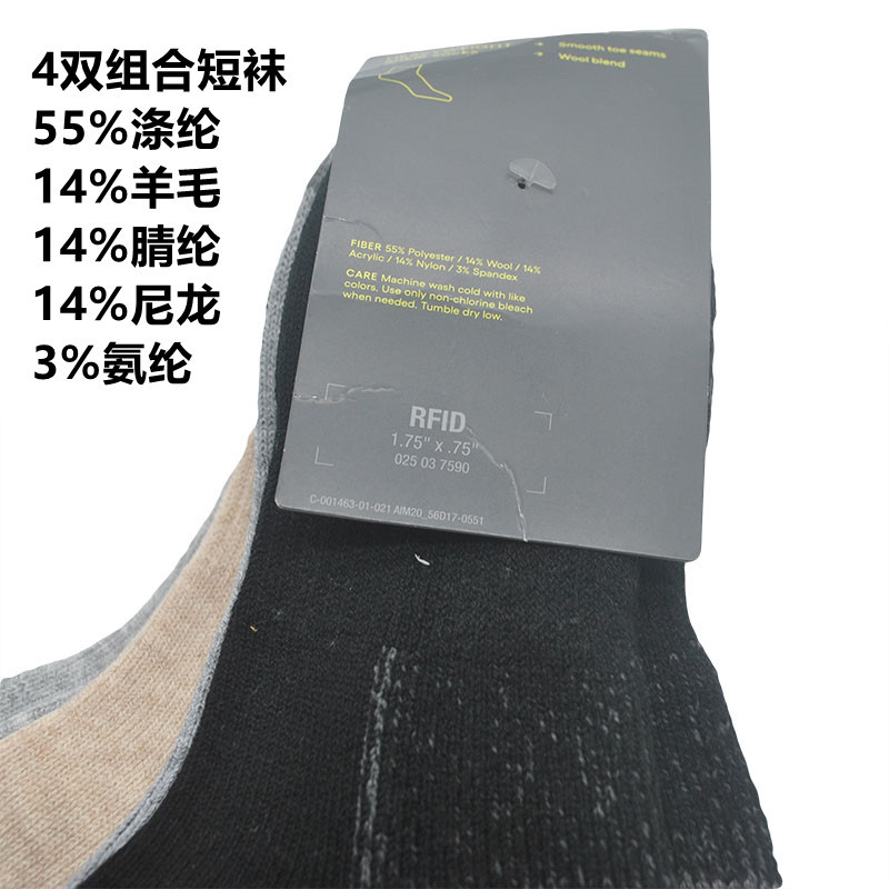4双组合短袜:55%涤纶,14%羊毛,14%腈纶,14%尼龙,3%弹性纤维。