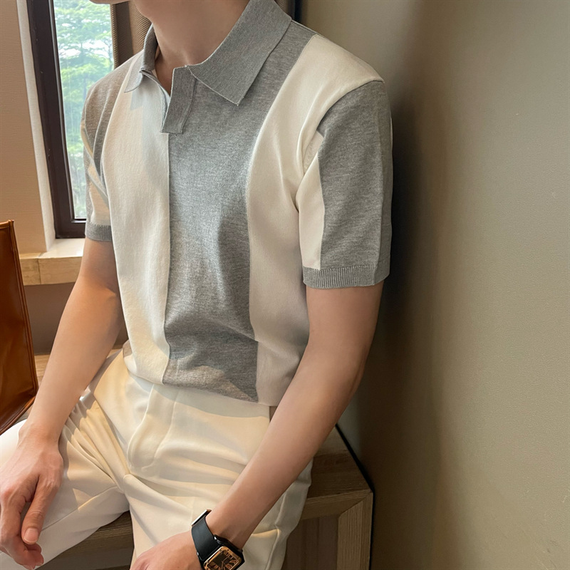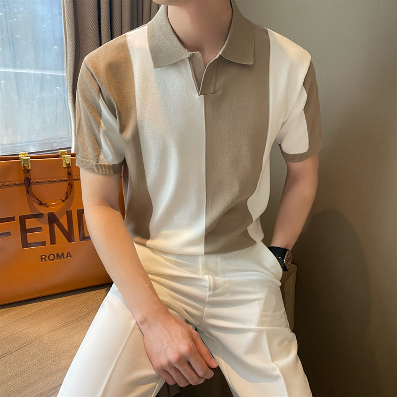 한국 스타일 여름 아이스 실크 짧은 소매 그라디언트 컬러 블록 남성용 폴로 셔츠 캐주얼 스트라이프 콘트라스트 옷깃 유행 통기성 니트