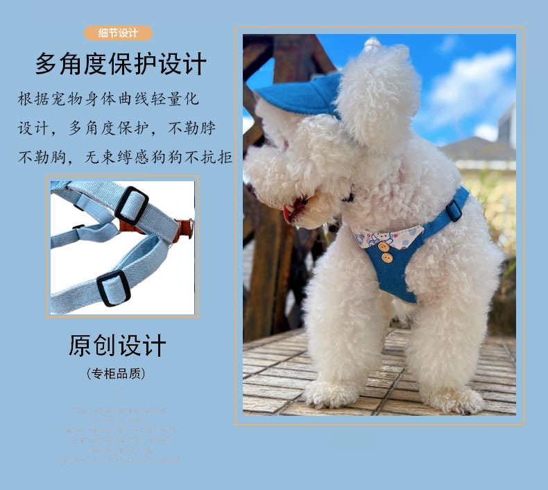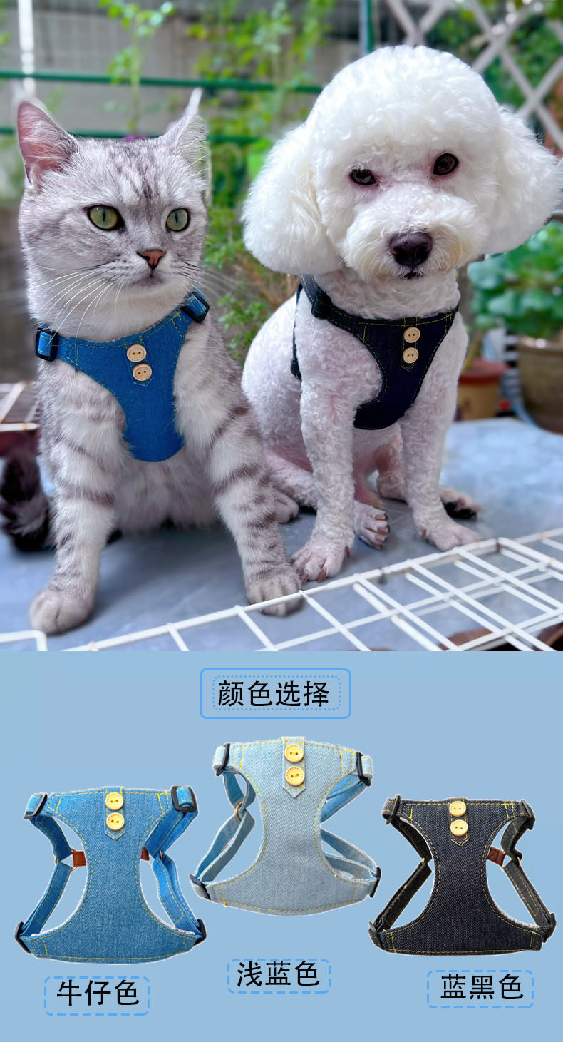 • 더블 버튼 데님 애완동물 하네스 라이트 블루(견인 로프 제외)