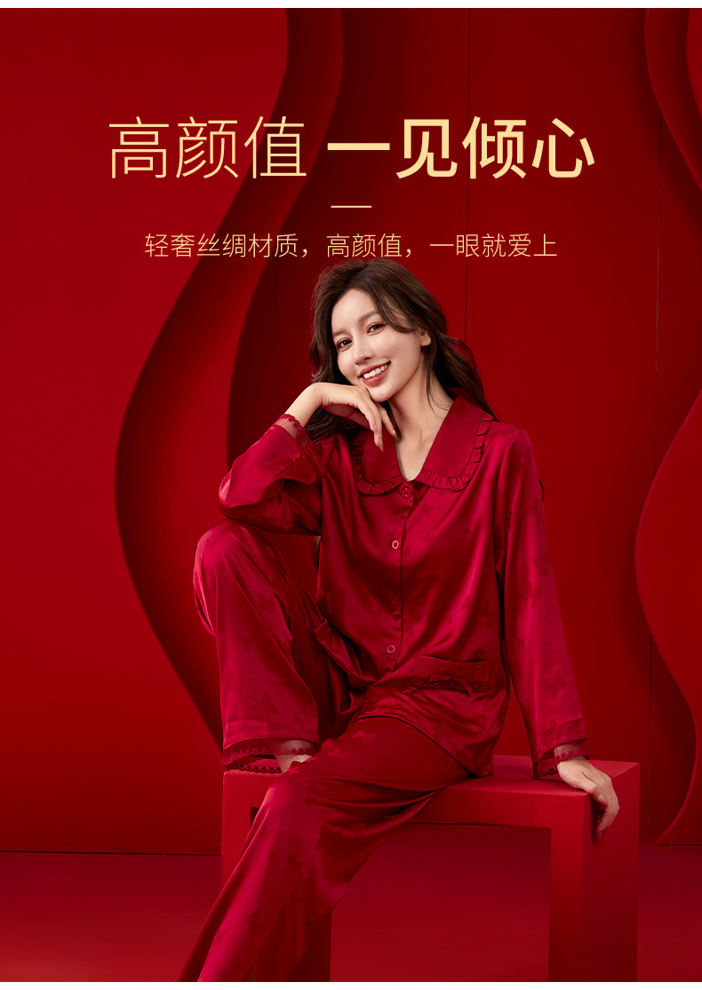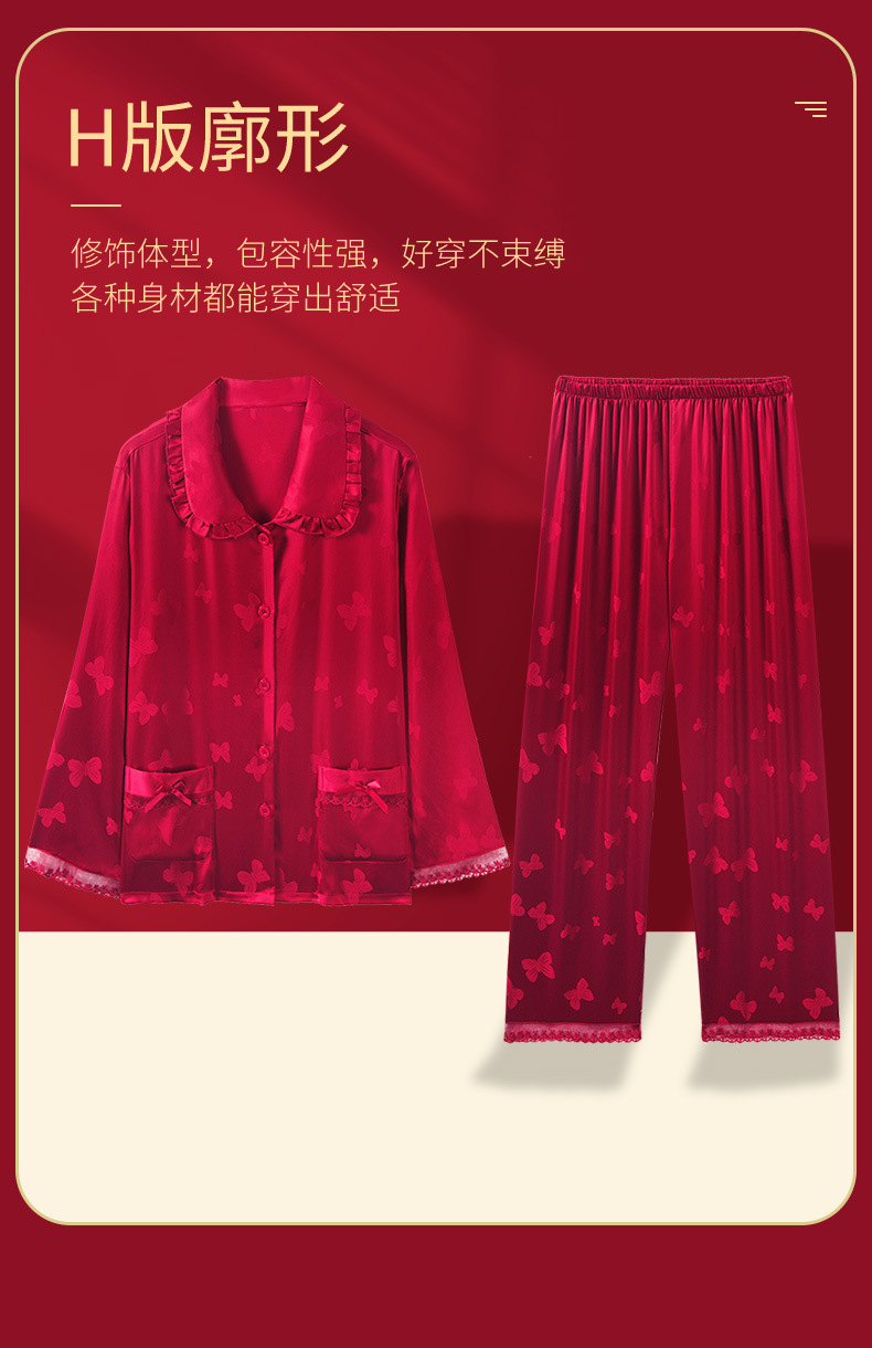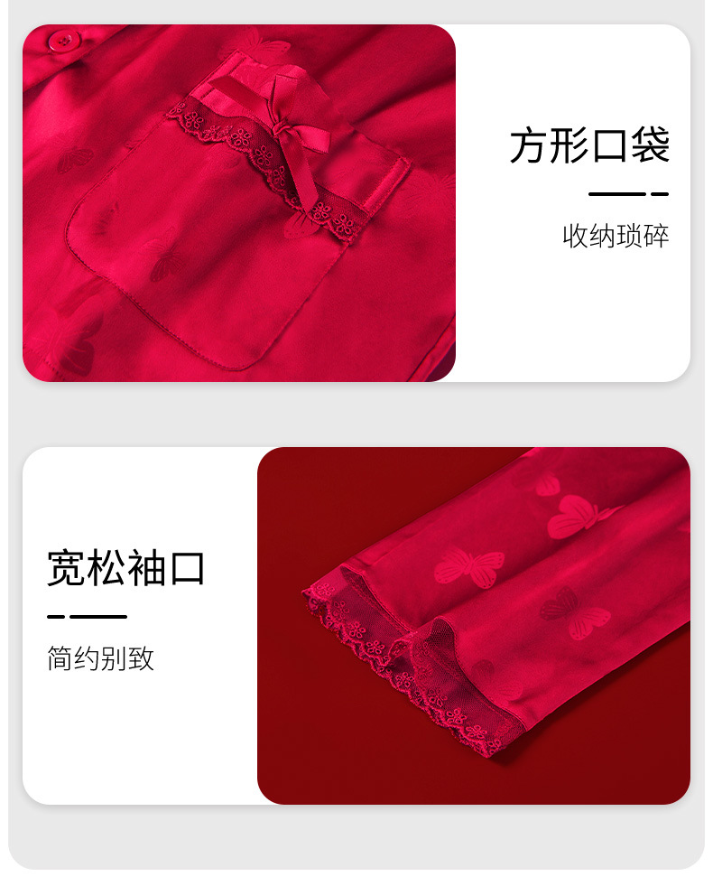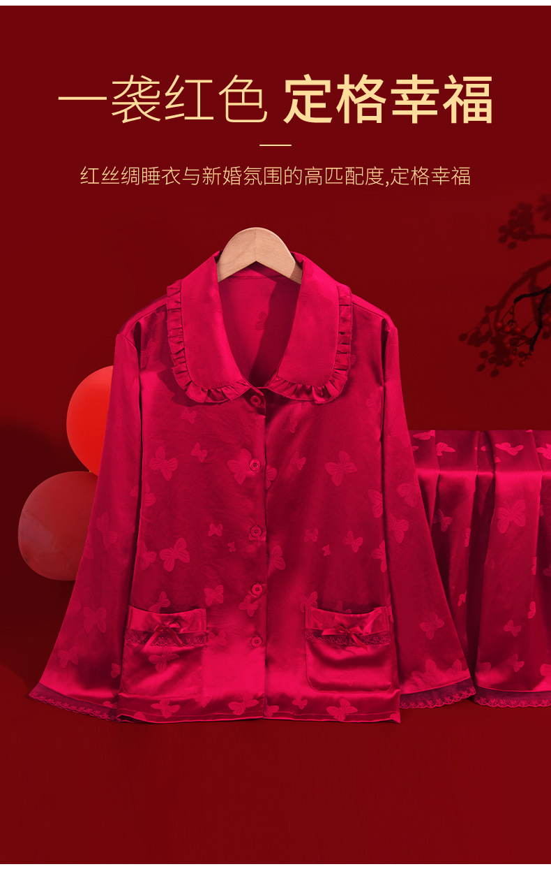 레드 웨딩 파자마 여성 여름 긴팔 홈 의류 여성 세트 축제 붉은 나비 프린트 레이스 칼라 파자마 여성스토어 가기