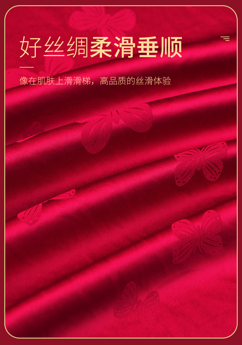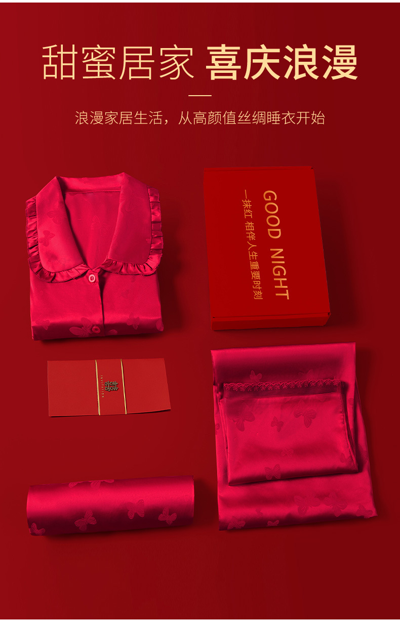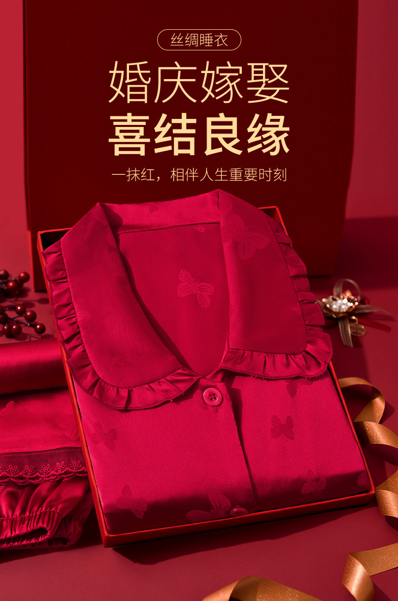 레드 웨딩 파자마 여성 여름 긴팔 홈 의류 여성 세트 축제 붉은 나비 프린트 레이스 칼라 파자마 여성스토어 가기