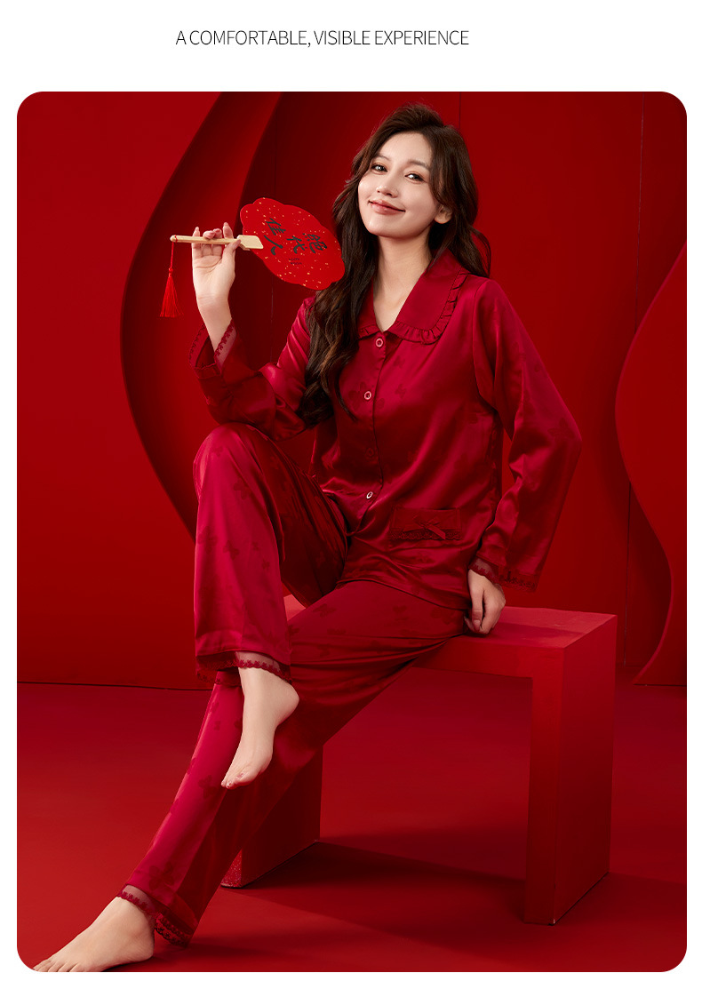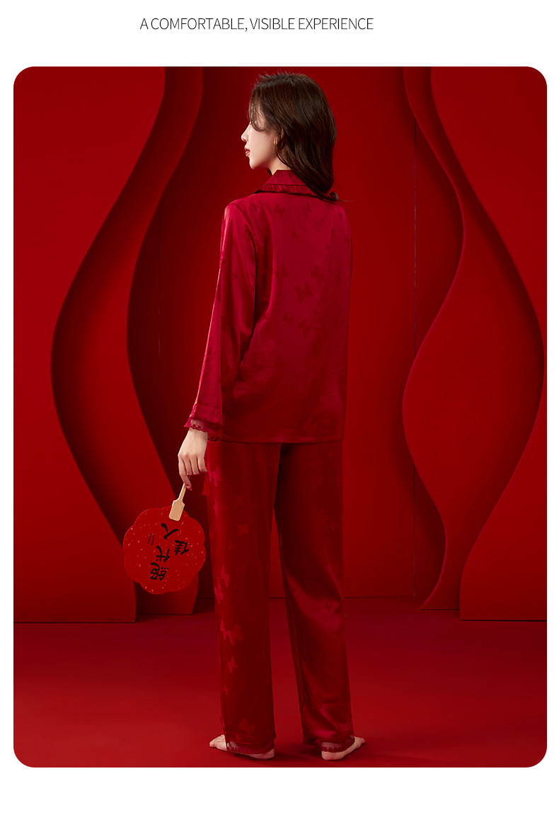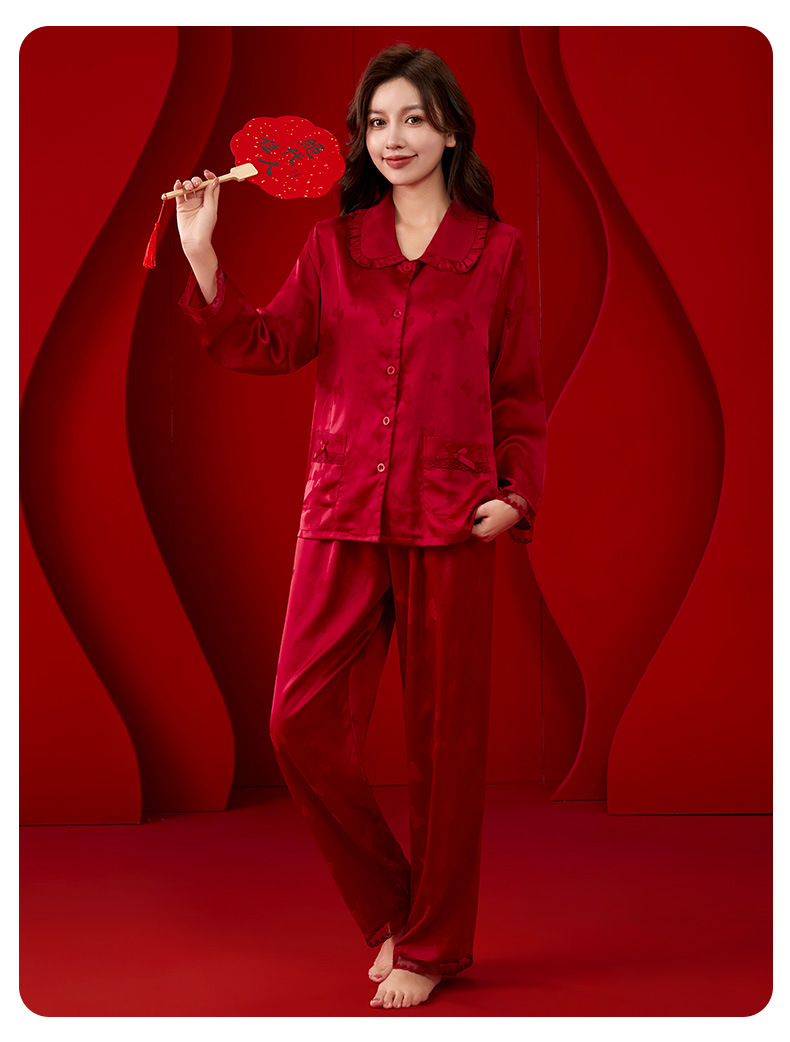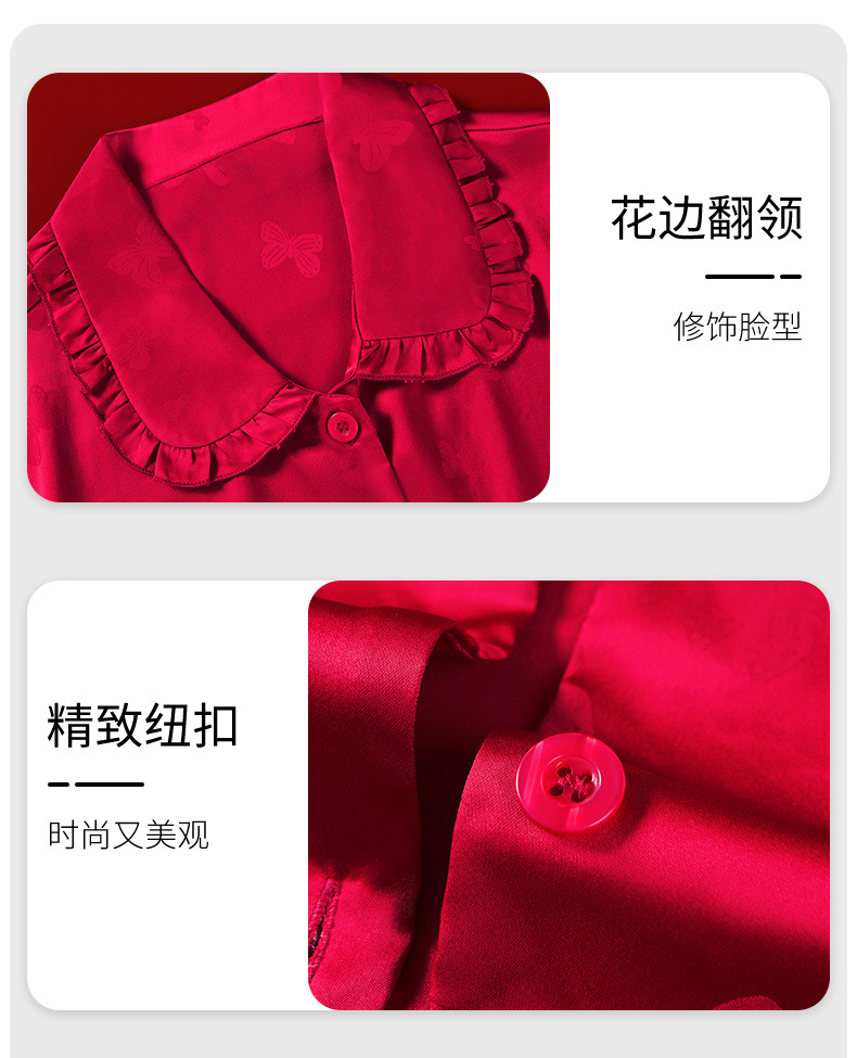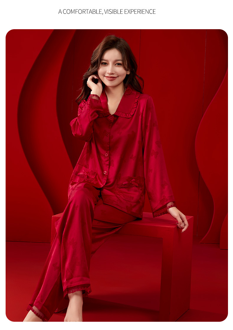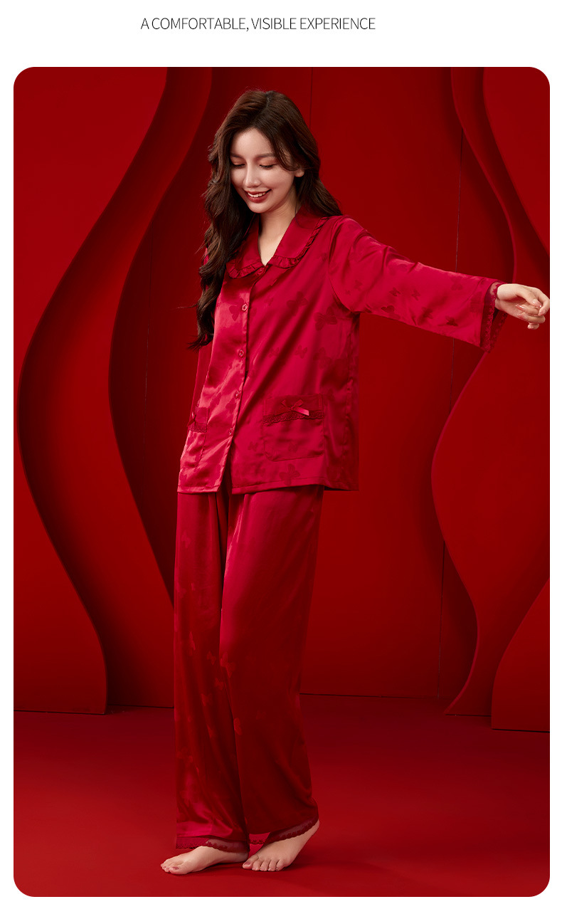 레드 웨딩 파자마 여성 여름 긴팔 홈 의류 여성 세트 축제 붉은 나비 프린트 레이스 칼라 파자마 여성