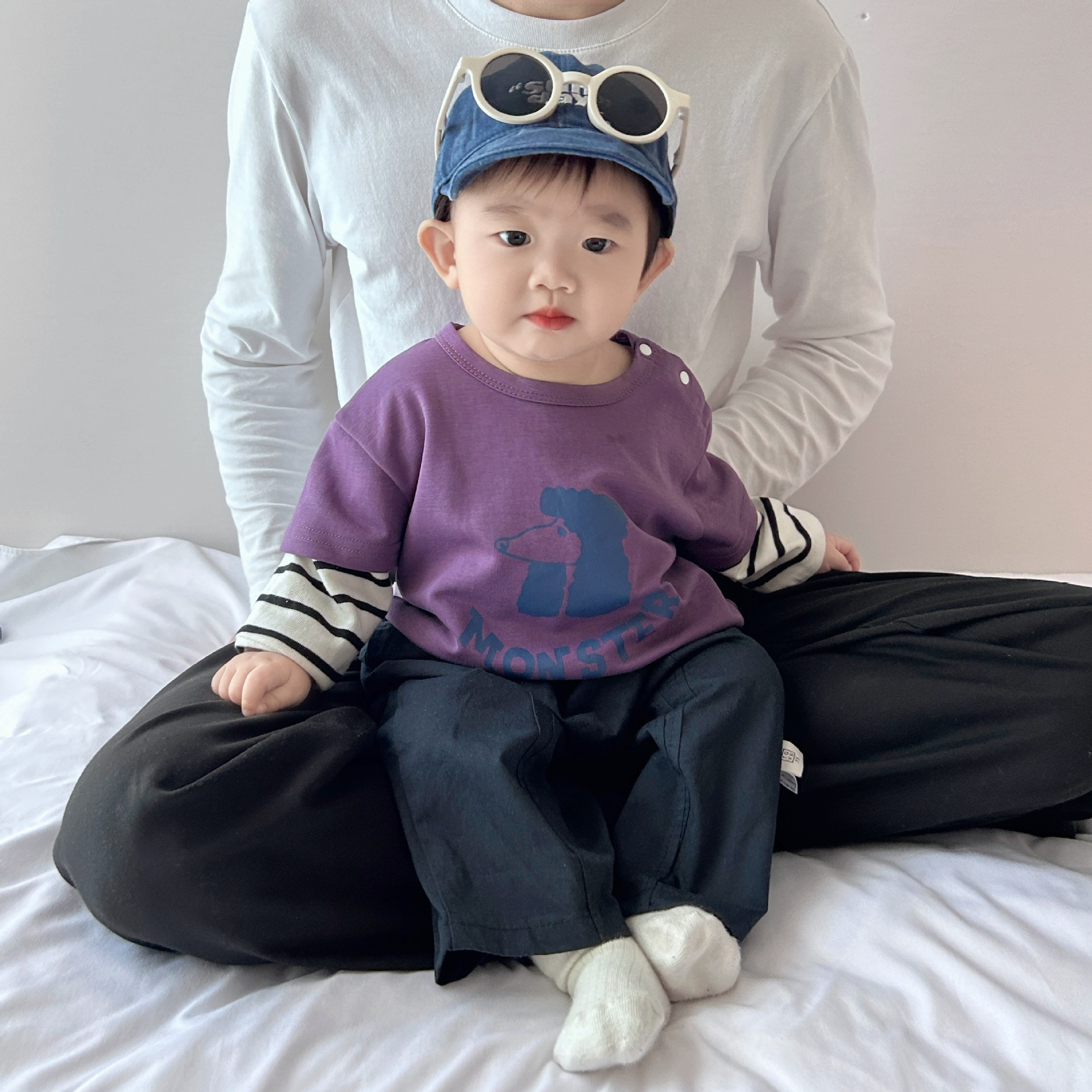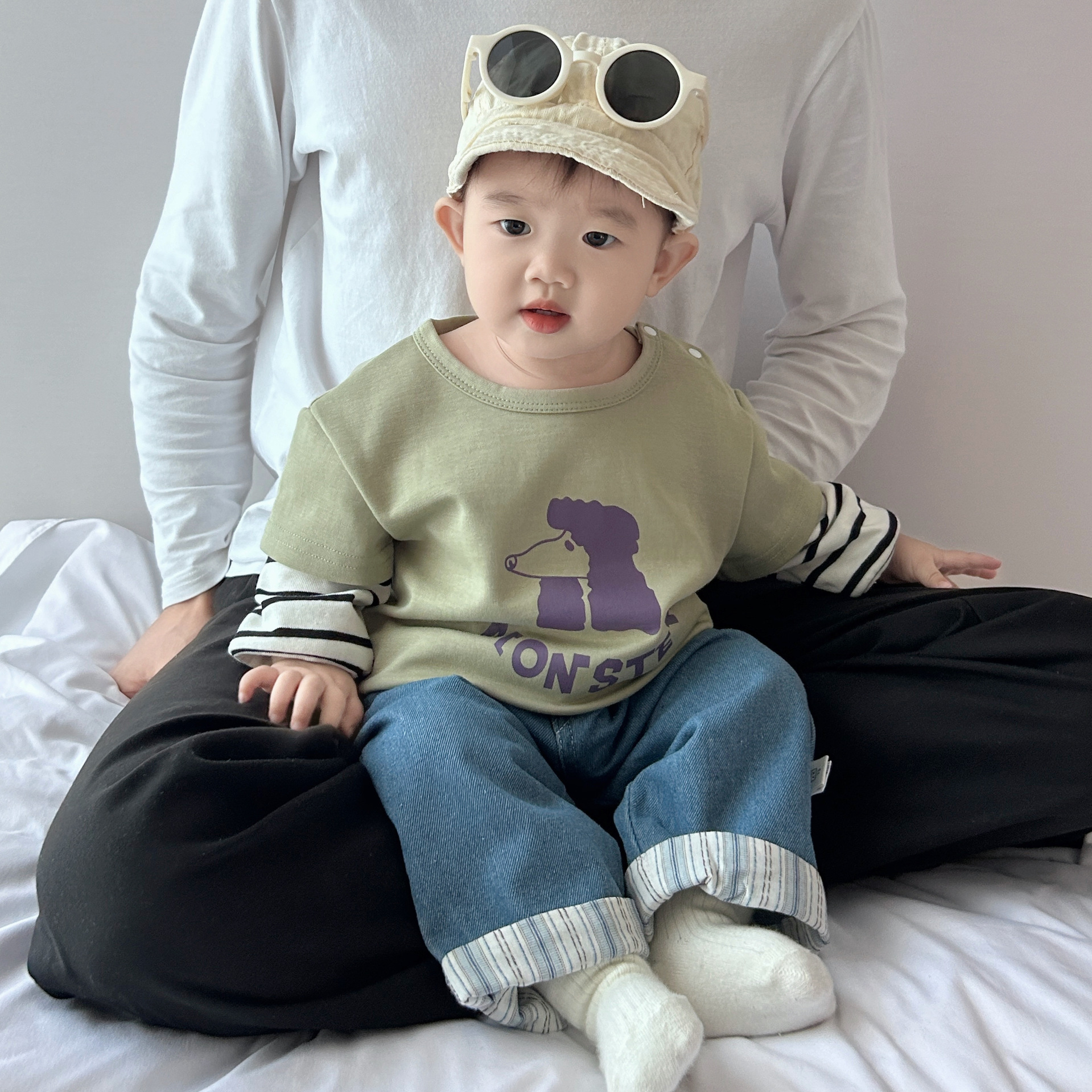 소년 봄, 가을 가짜 투피스 스플 라이스 긴팔 티셔츠 2025 새로운 스타일 아동 스타일 얇은 바닥 라운드 넥 탑 유행스토어 가기