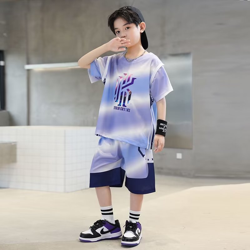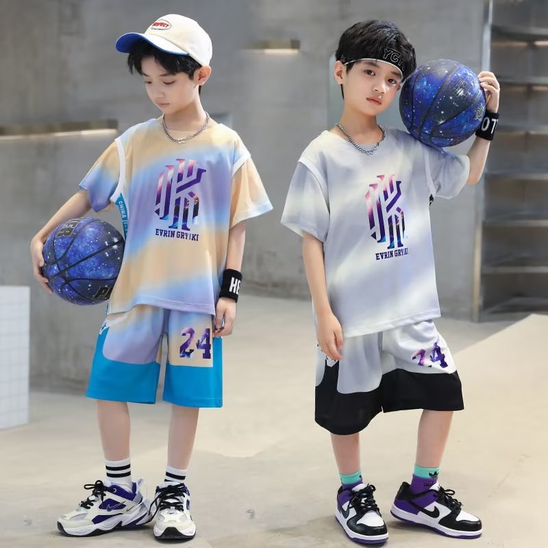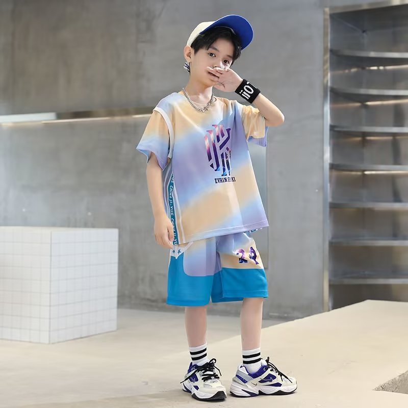 소년 여름 얇은 캐주얼 스포츠 반팔 양복 큰 어린이를위한 여름 옷 2024 새로운 어린이 속건성 투피스 세트스토어 가기