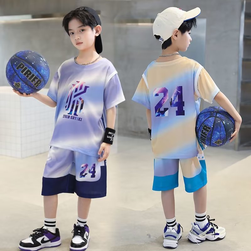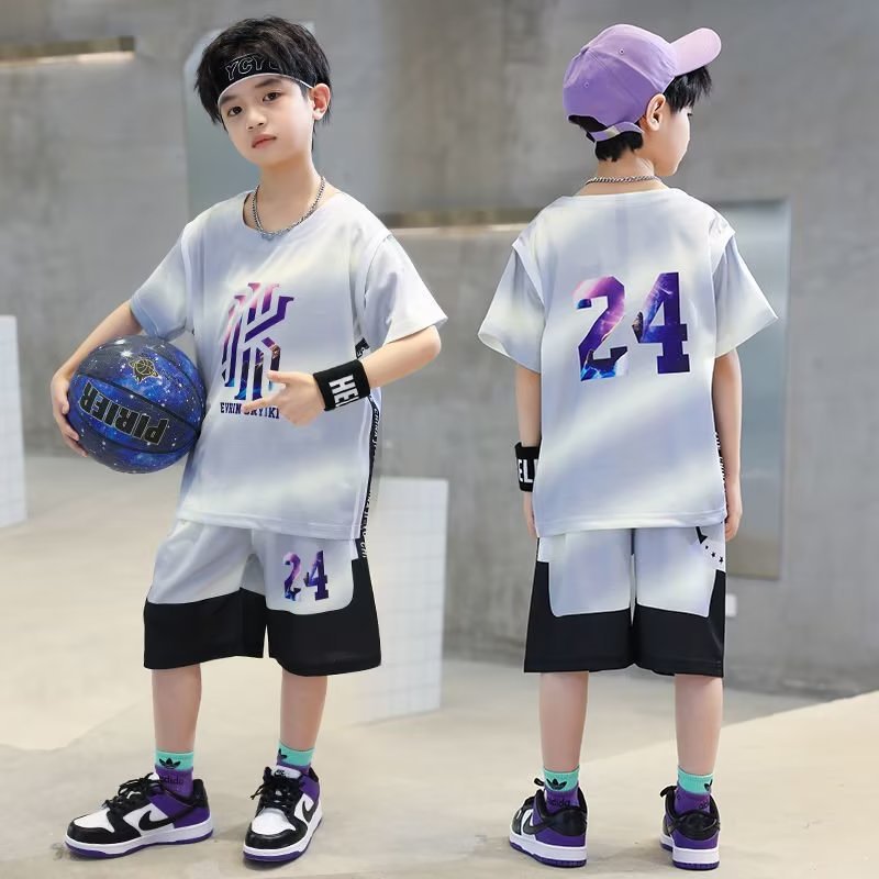 소년 여름 얇은 캐주얼 스포츠 반팔 양복 큰 어린이를위한 여름 옷 2024 새로운 어린이 속건성 투피스 세트