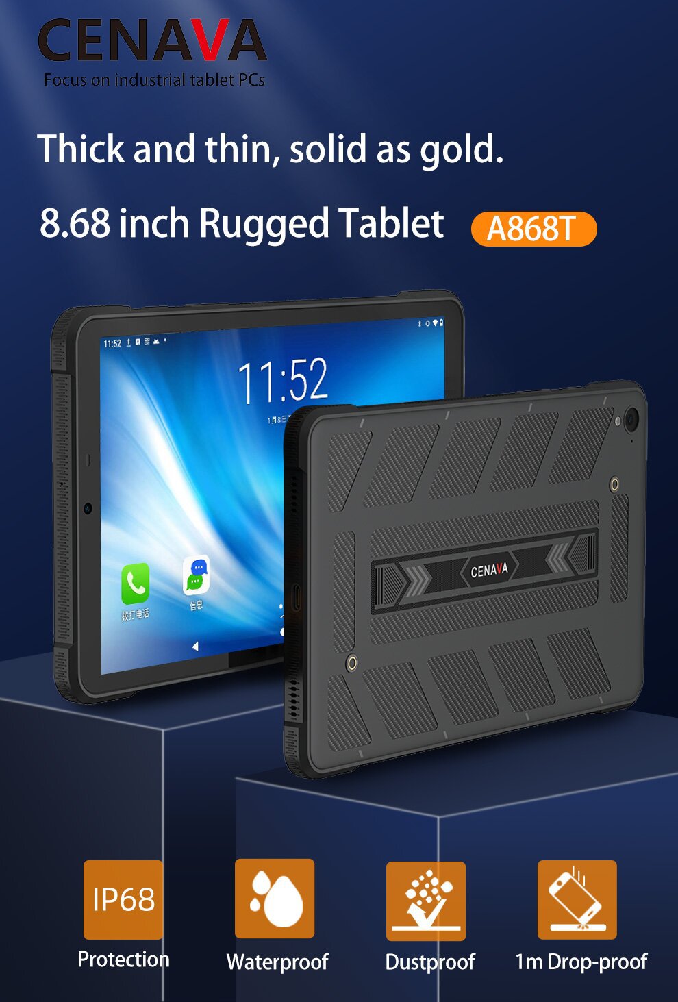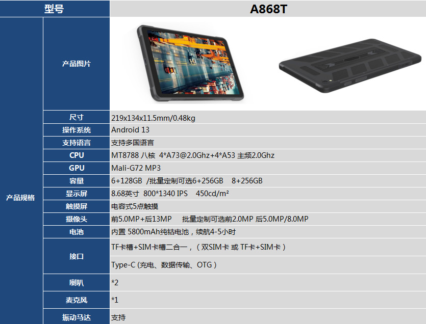 8.68英寸/MT8788三防平板电脑  八核/6G内存/128G/4G网络/WIFI蓝牙GPS/分辨率800*1340/450亮度/安卓13系统/轻三防 产品卖点:市面上唯一款超薄能过IP68,支持人面识别,摄像头支持扫码支付,支持NFC、、、