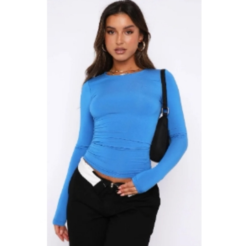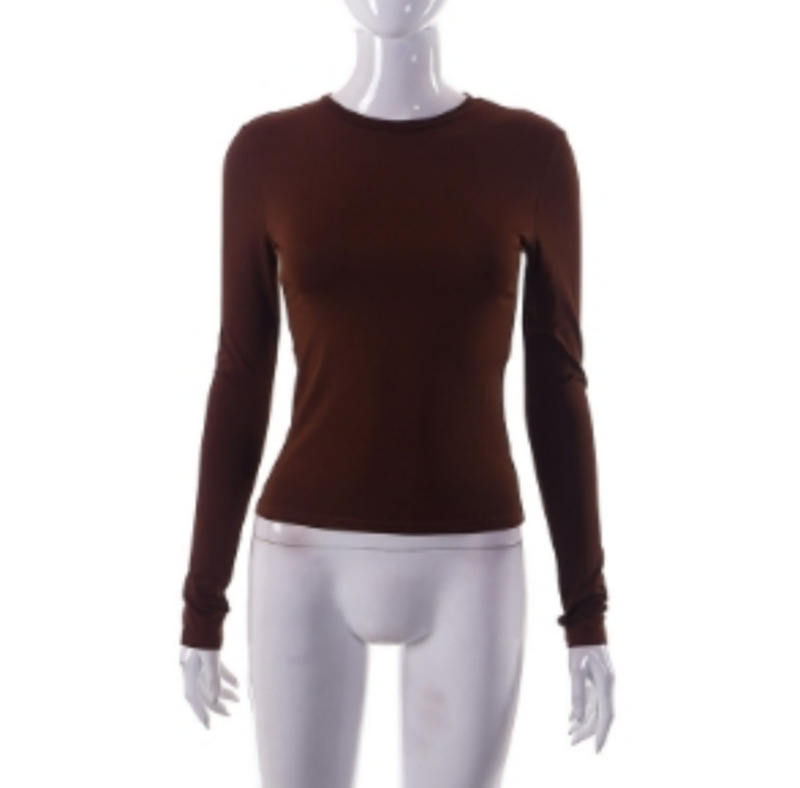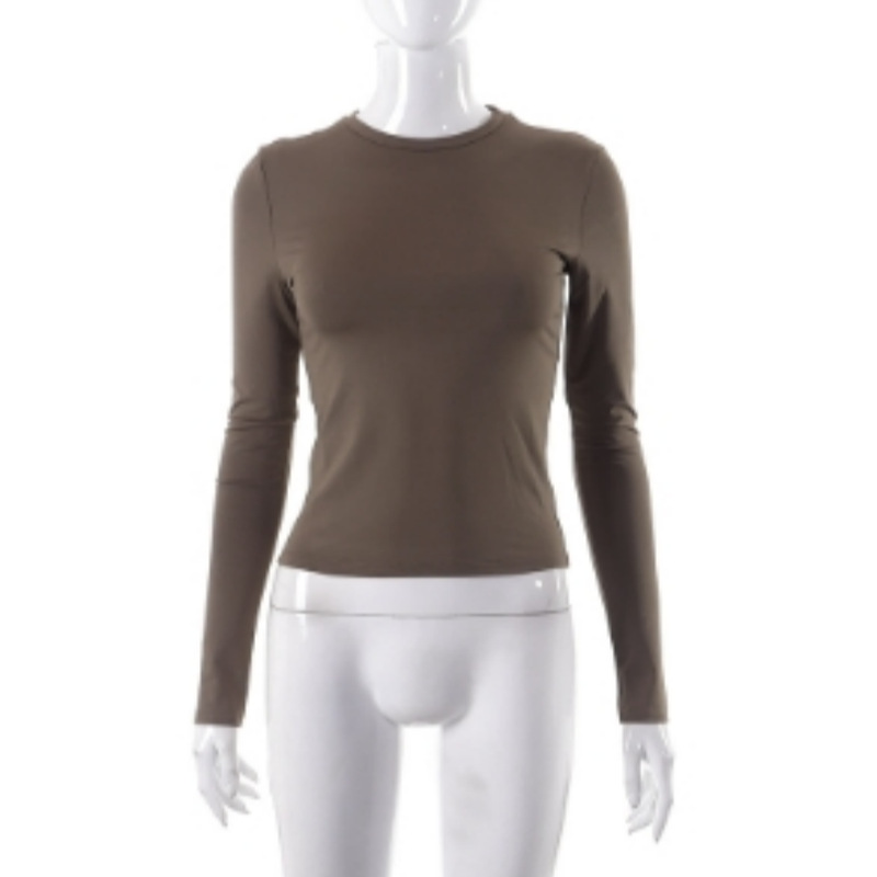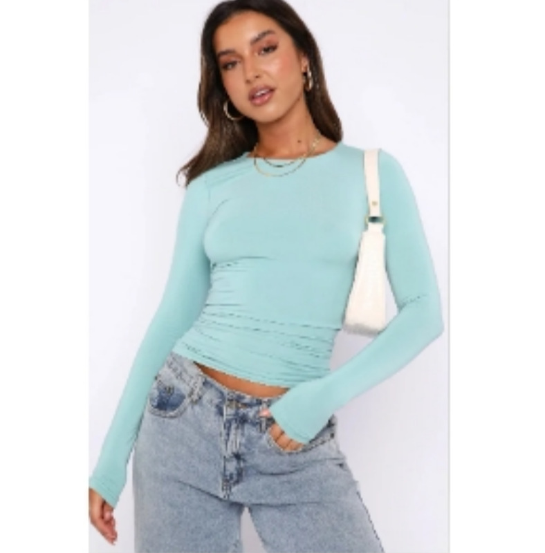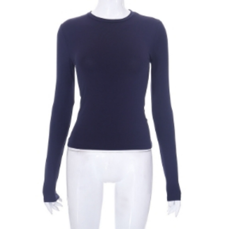 2024 봄/가을 유럽 및 미국 여성 의류 아마존 인기 상품 단색 라운드넥 긴팔 기본 티셔츠 실크 가공스토어 가기