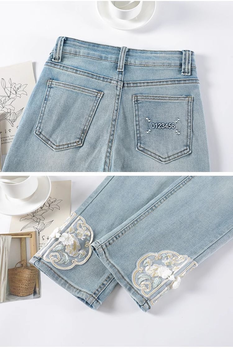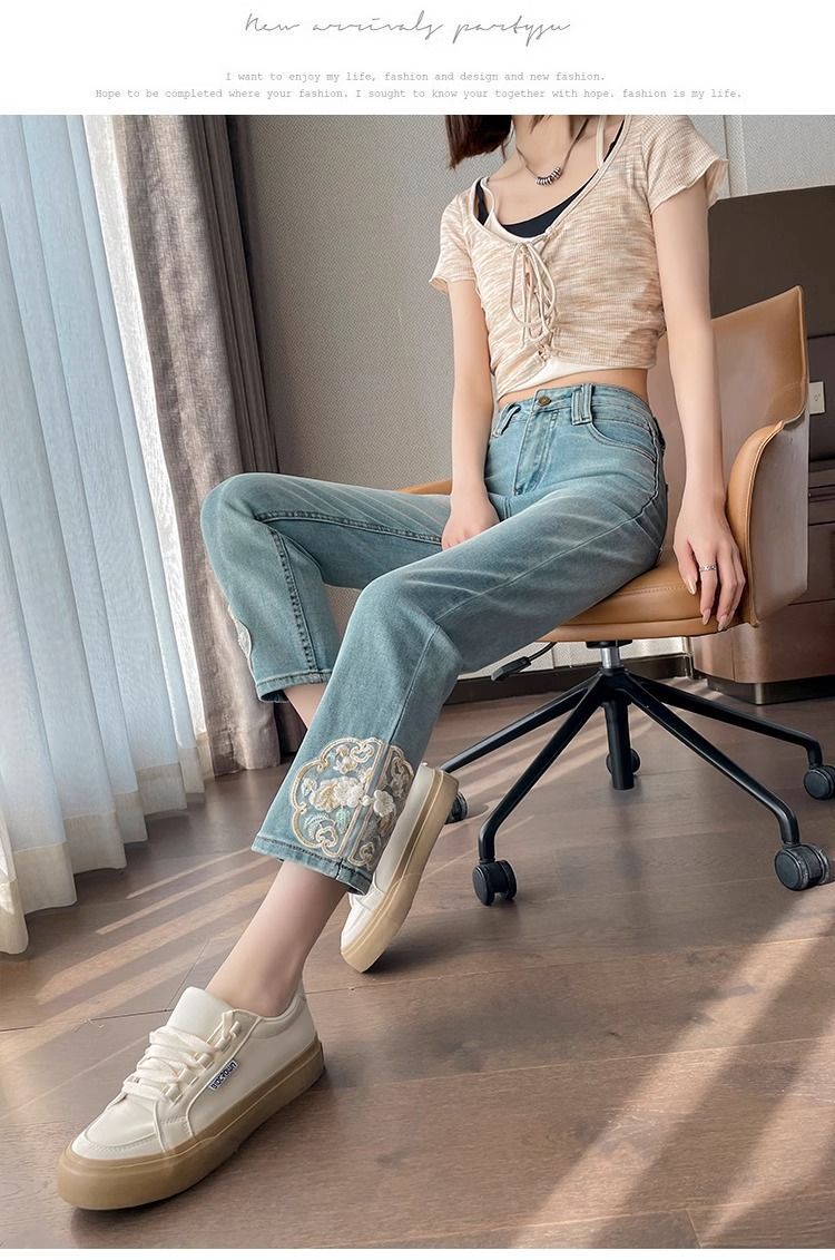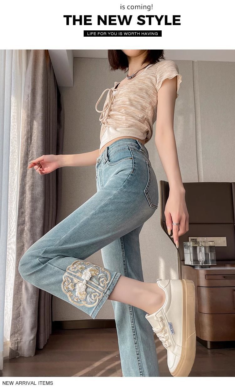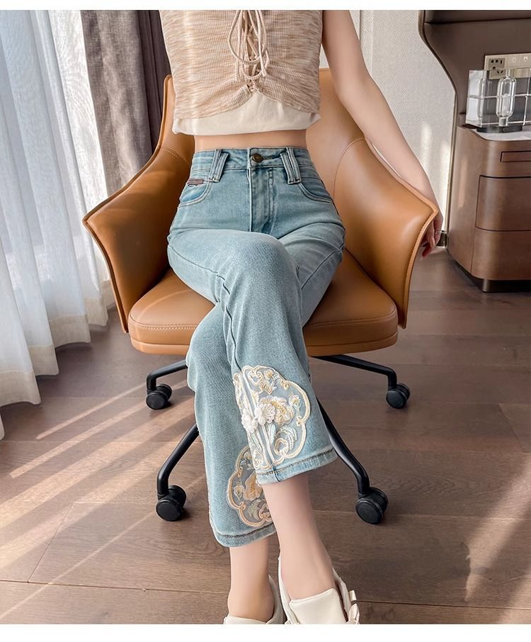 신상 중국풍 데님 팬츠 여성용 봄 가을 2025 신상 작은 사이즈 중국풍 자수 스티치 9부 슬림핏 스트레이트 팬츠스토어 가기