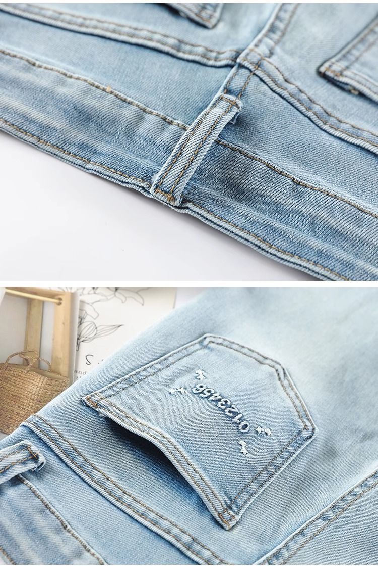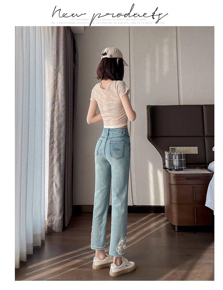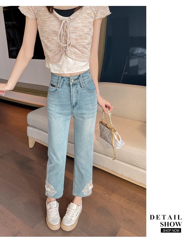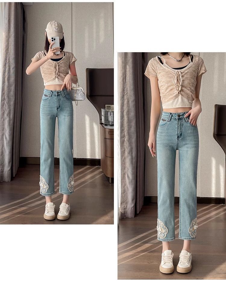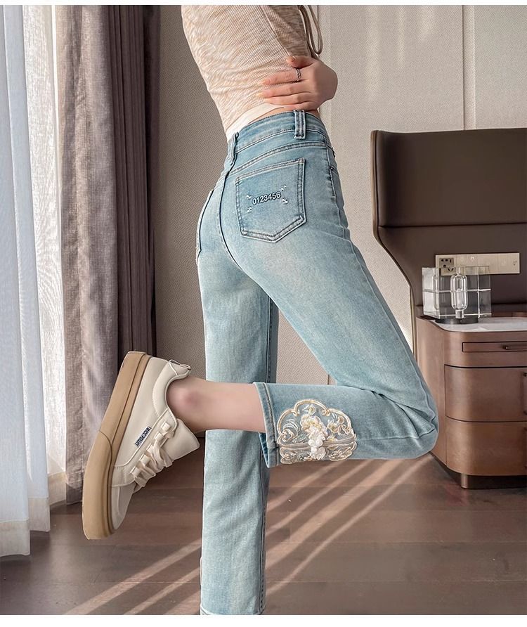 신상 중국풍 데님 팬츠 여성용 봄 가을 2025 신상 작은 사이즈 중국풍 자수 스티치 9부 슬림핏 스트레이트 팬츠스토어 가기
