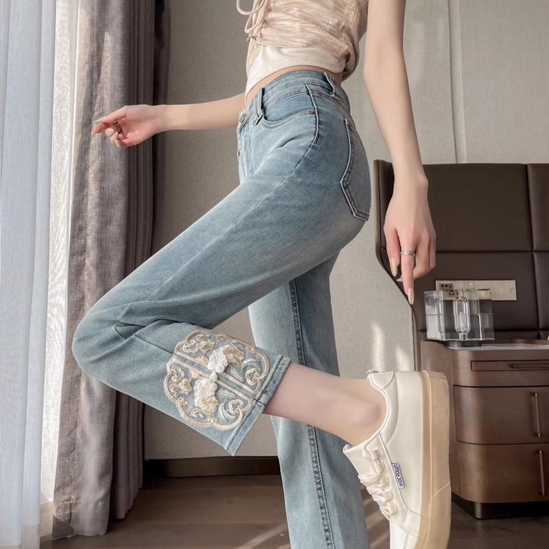 신상 중국풍 데님 팬츠 여성용 봄 가을 2025 신상 작은 사이즈 중국풍 자수 스티치 9부 슬림핏 스트레이트 팬츠