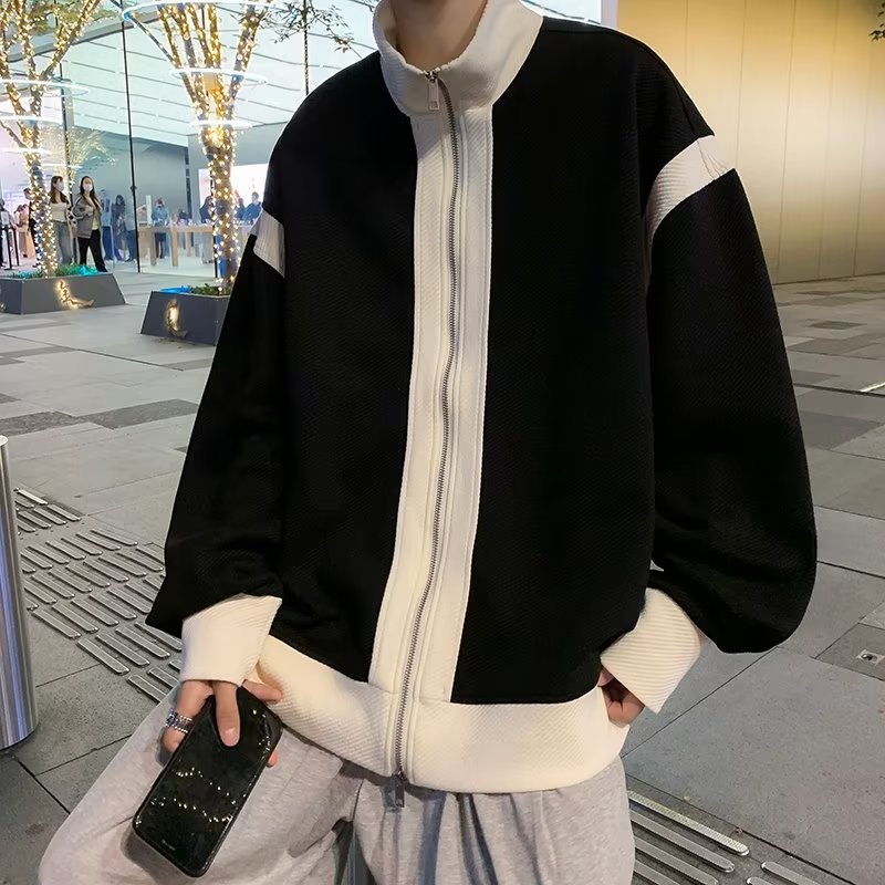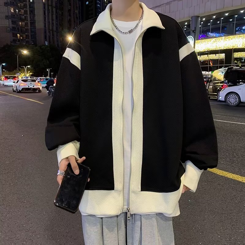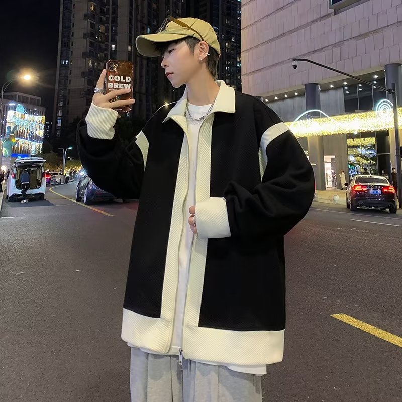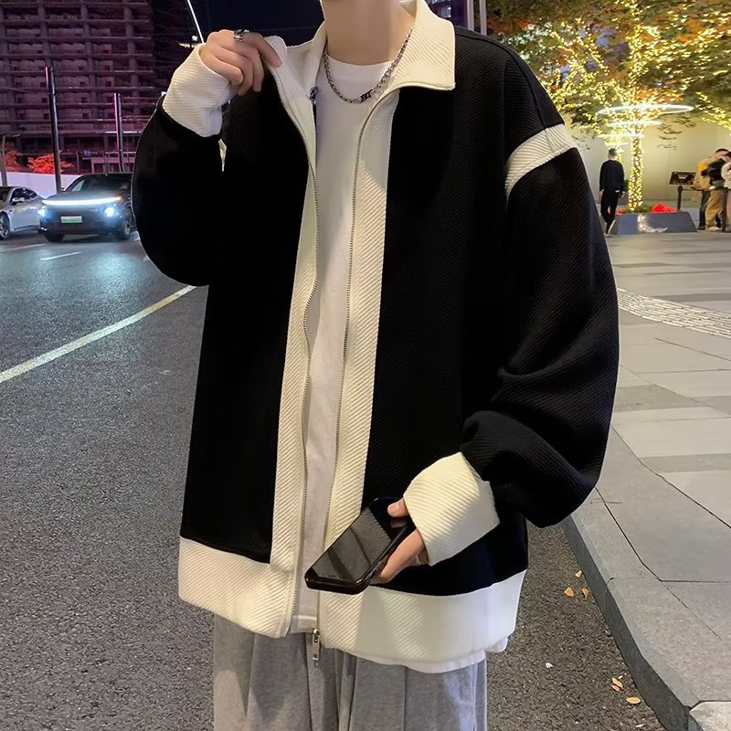더블 지퍼 재킷 코트 남성용 캐주얼 느슨한 Duffy Shuai Chao 브랜드 옷깃 컬러 블록 카디건 봄 가을 겨울 긴팔 니트
