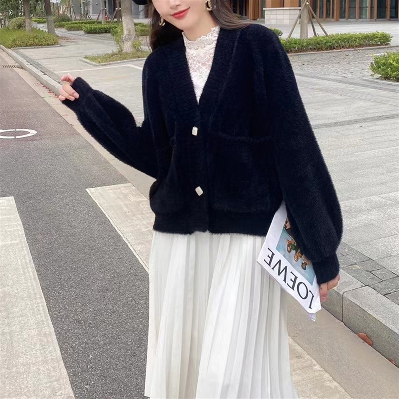 2024 가을과 겨울 새로운 푹신한 모조 밍크 울 니트 카디건 여성용 짧은 착용 긴 소매 서양식 스웨터
