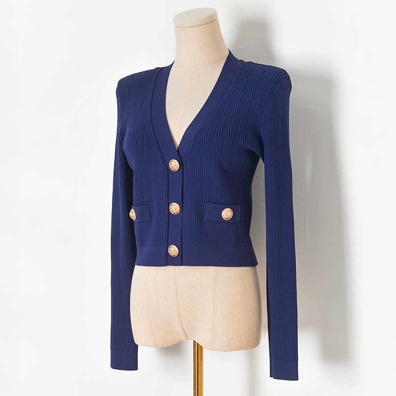 P4153 이른 가을 새 구덩이 스트립 탄성 슬림 금속 버클 V 넥 짧은 니트 스웨터 긴 소매 카디건 여성용