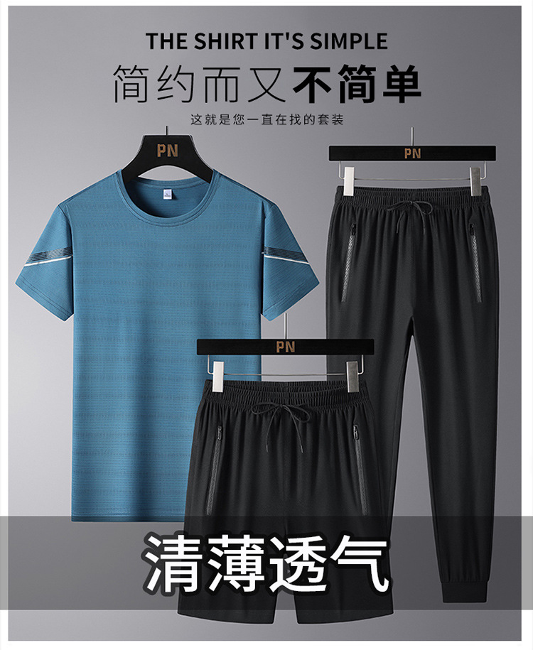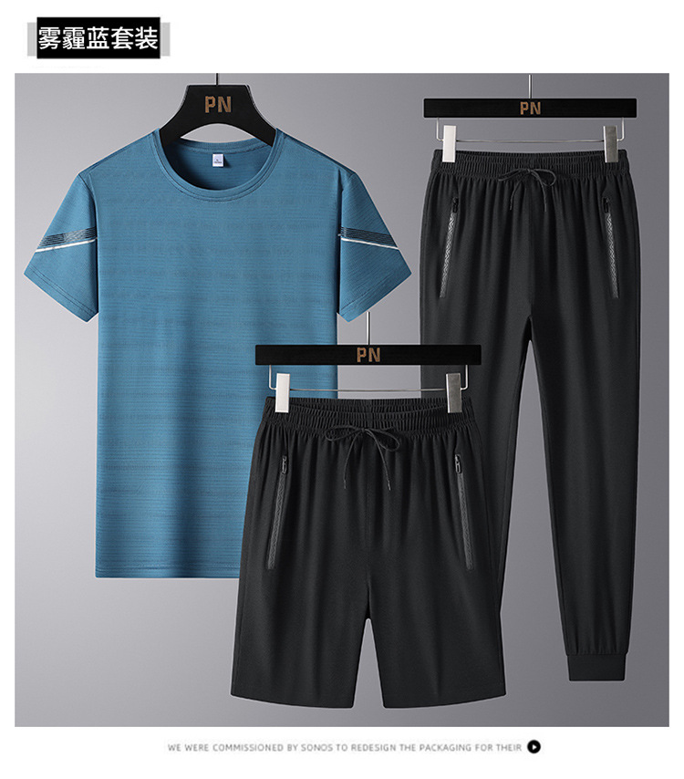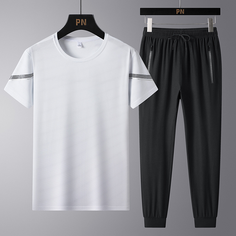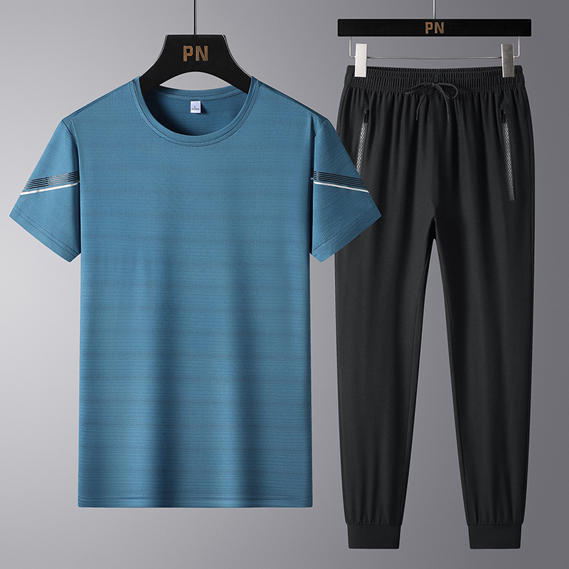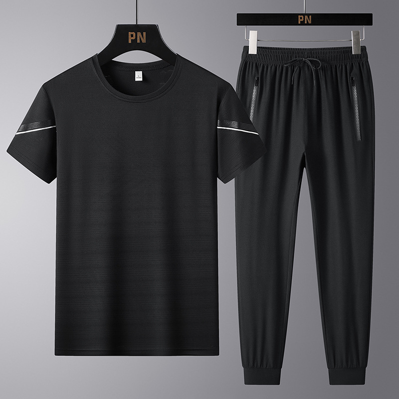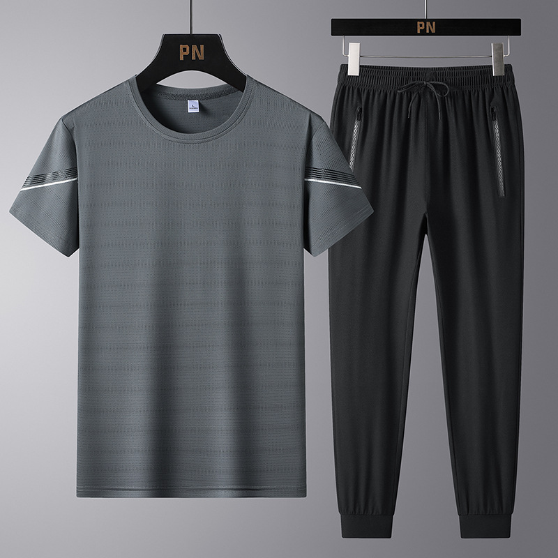 여름 새로운 아이스 실크 스포츠 세트 남자의 느슨한 얇은 빠른 건조 세트 중년 여름을위한 캐주얼 반팔 바지