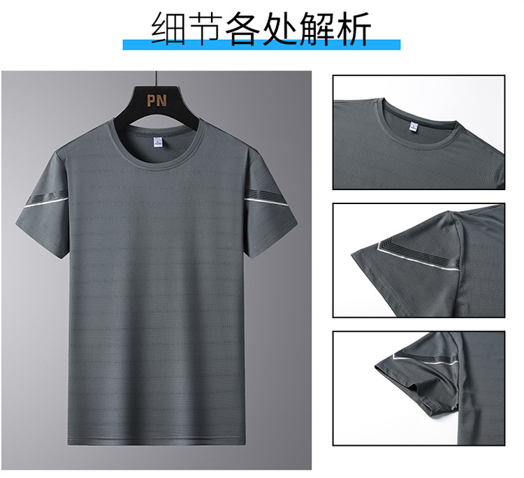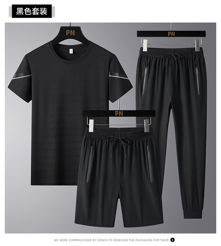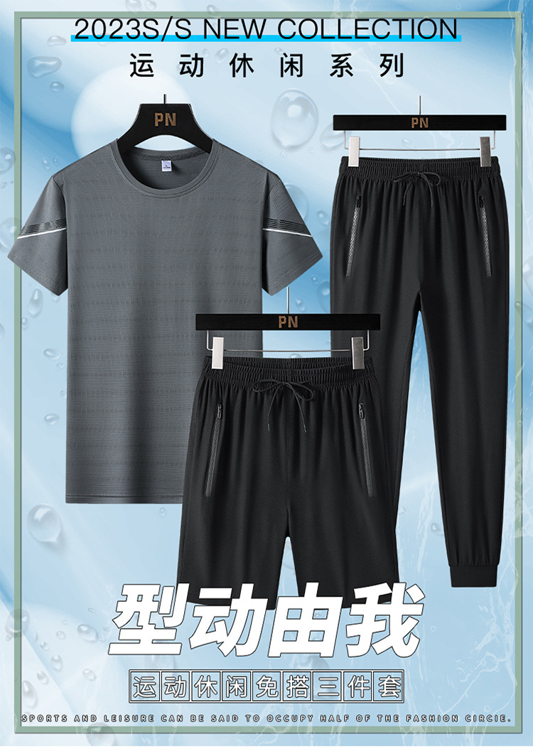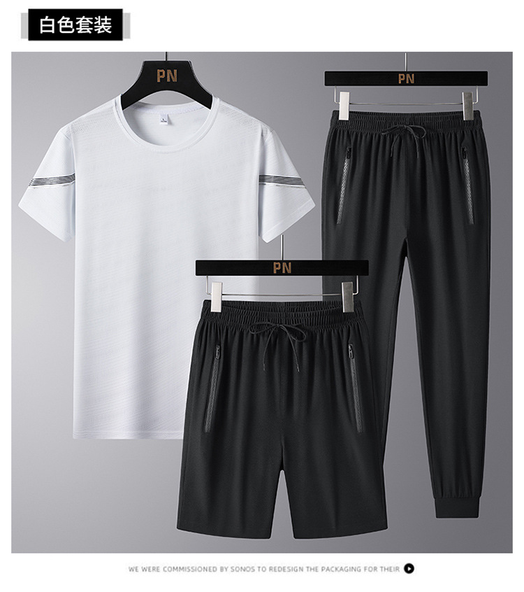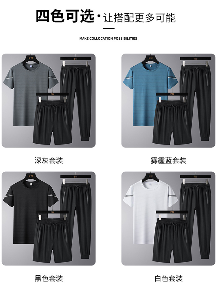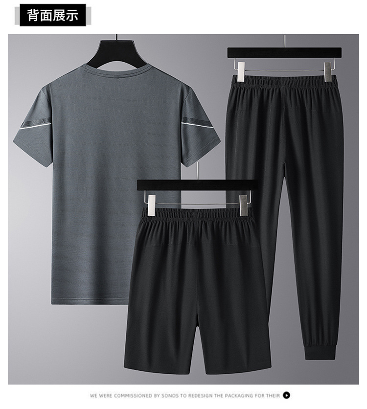 여름 새로운 아이스 실크 스포츠 세트 남자의 느슨한 얇은 빠른 건조 세트 중년 여름을위한 캐주얼 반팔 바지
