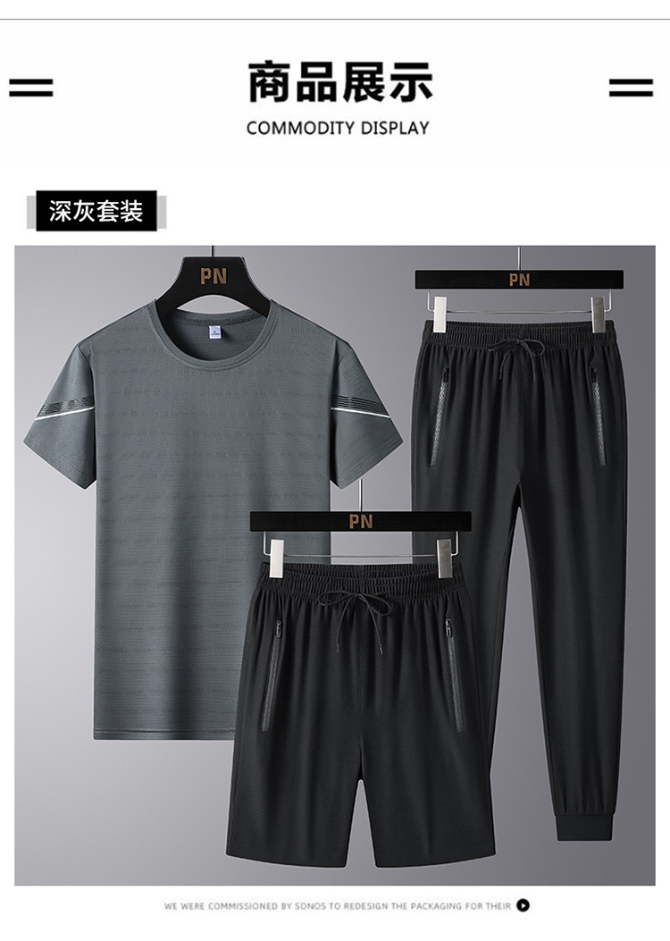 여름 새로운 아이스 실크 스포츠 세트 남자의 느슨한 얇은 빠른 건조 세트 중년 여름을위한 캐주얼 반팔 바지스토어 가기