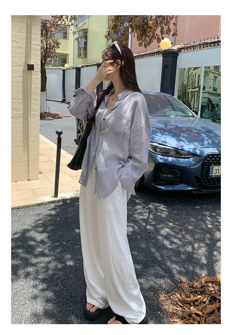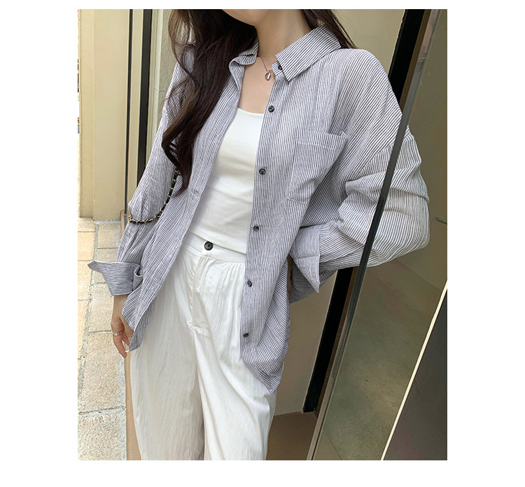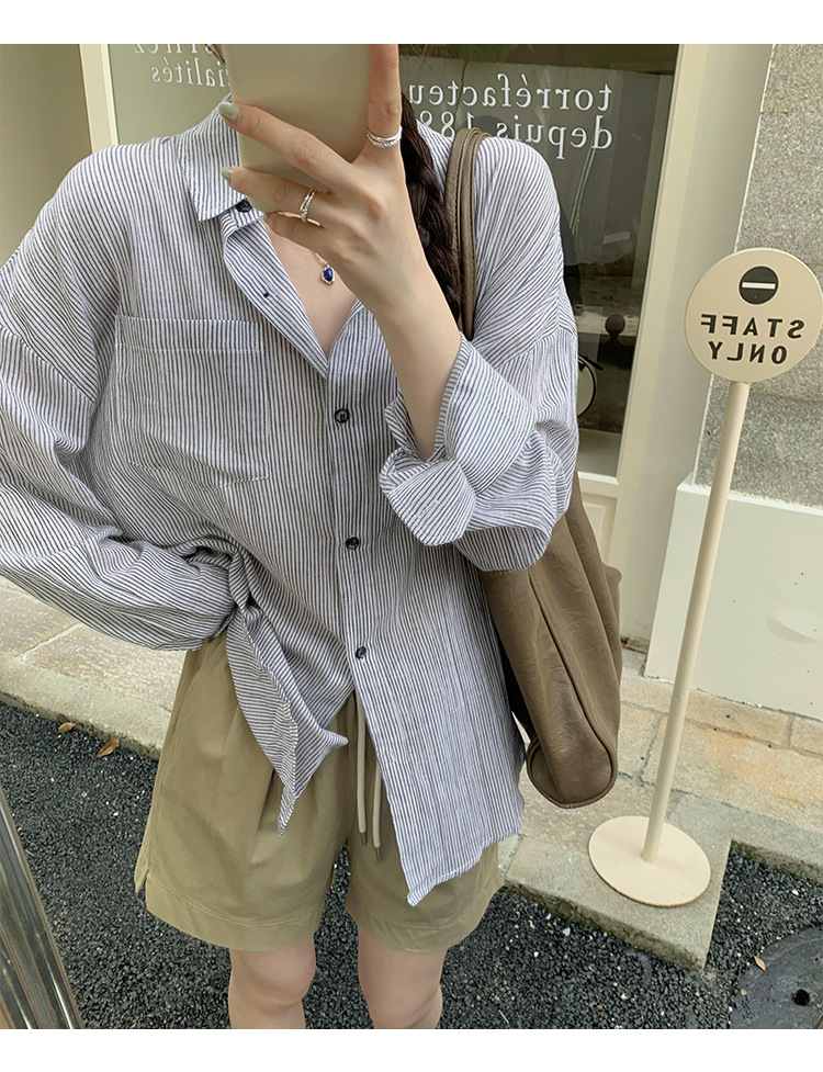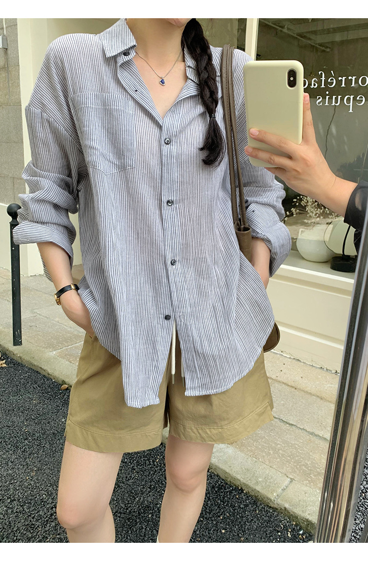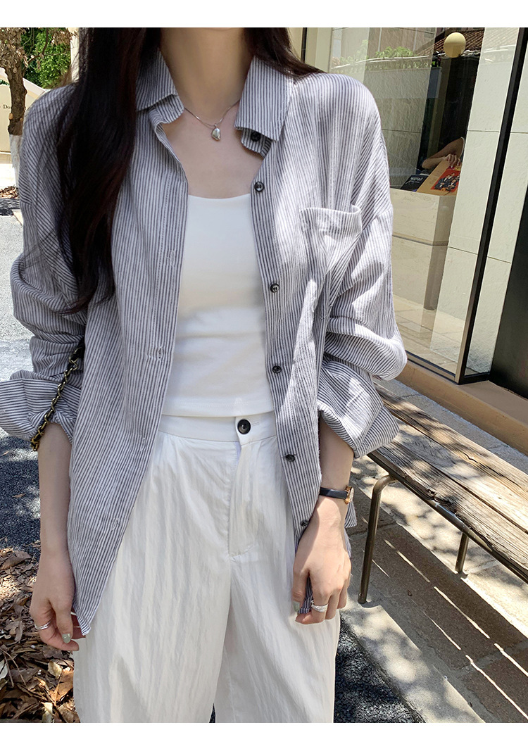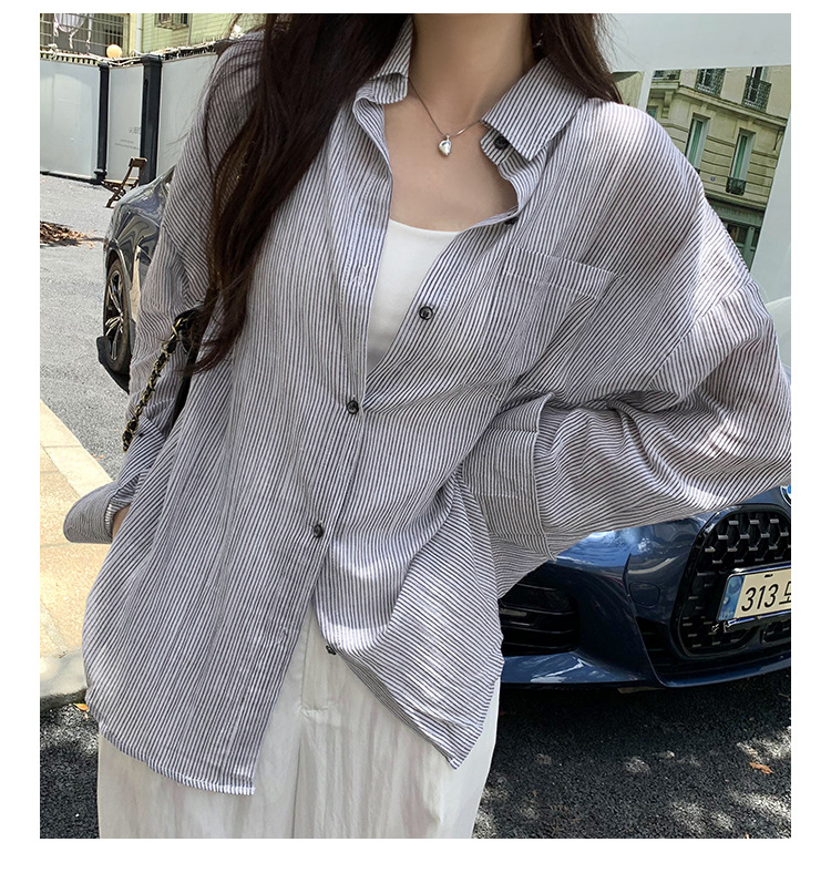 회색 줄무늬 느슨한 게으른 긴팔 셔츠 여자의 2024 봄과 가을 새로운 느슨한 캐주얼 슬림 올 매치 탑스토어 가기