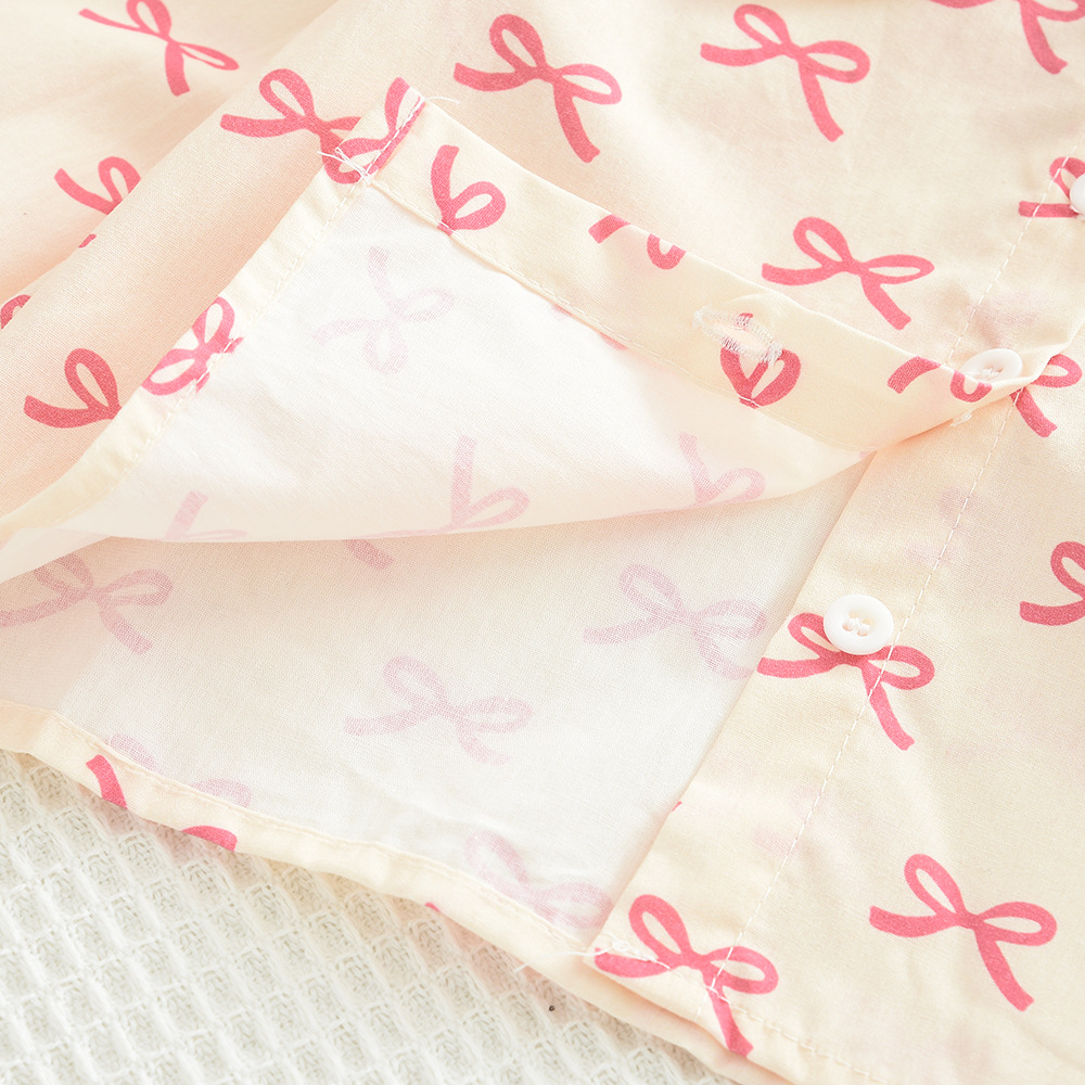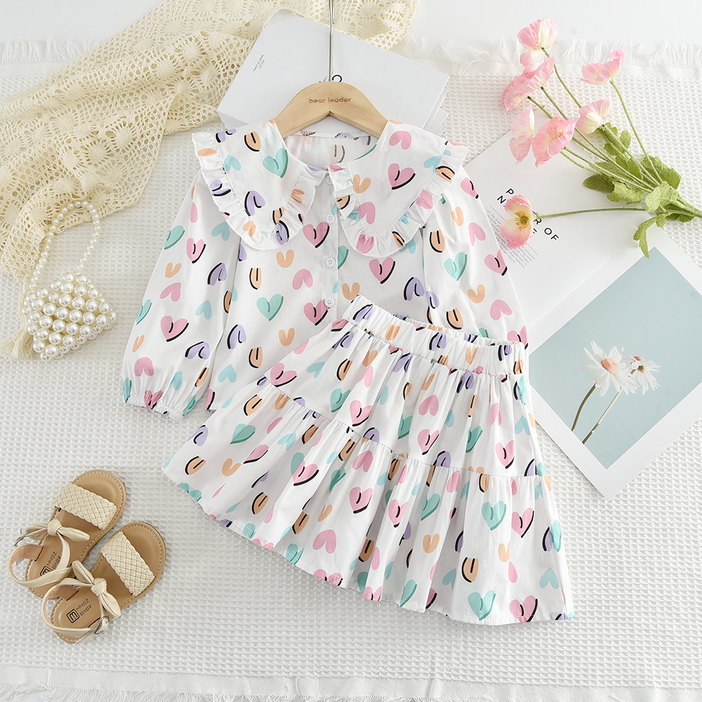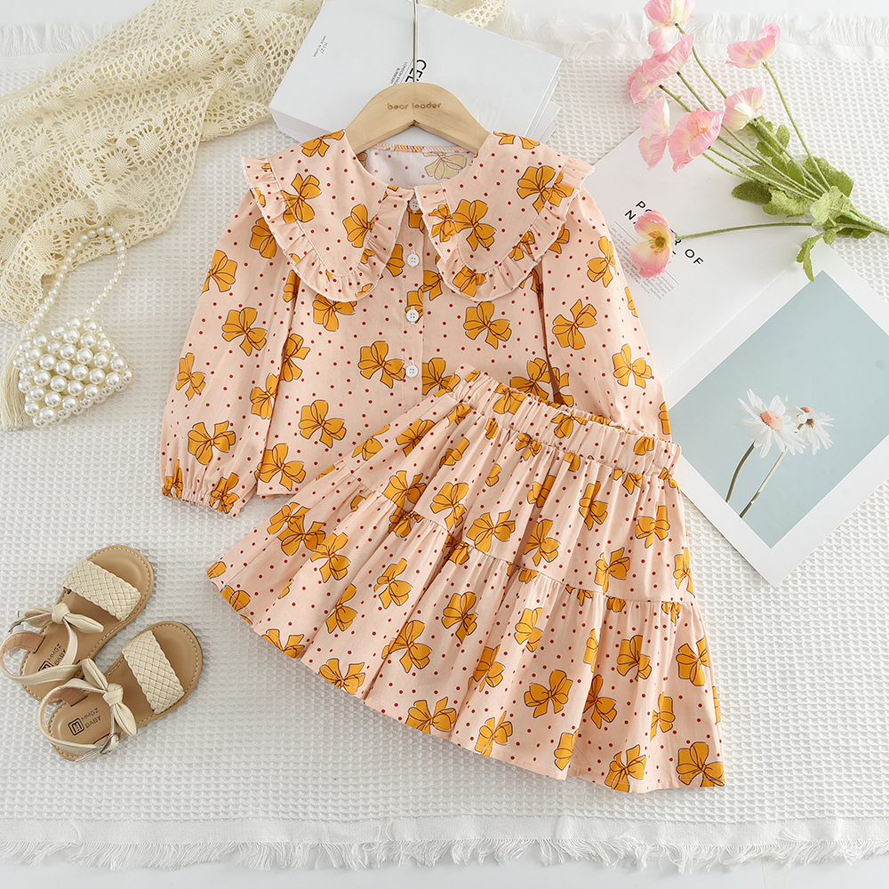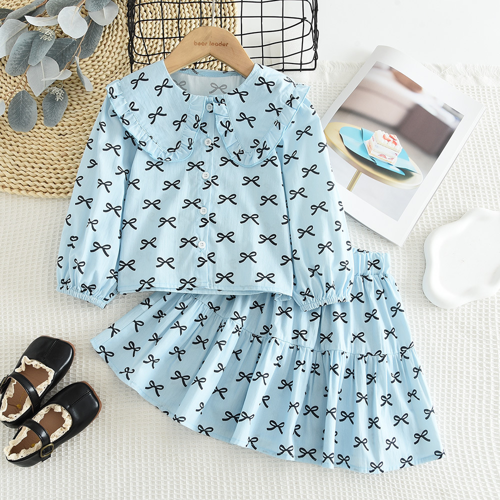 국경을 넘는 인기 판매 한국 스타일 아동복 새로운 나비 프린트 긴팔 베이비돌 셔츠와 짧은 스커트 여아 2025 봄, 가을 스타일 세트