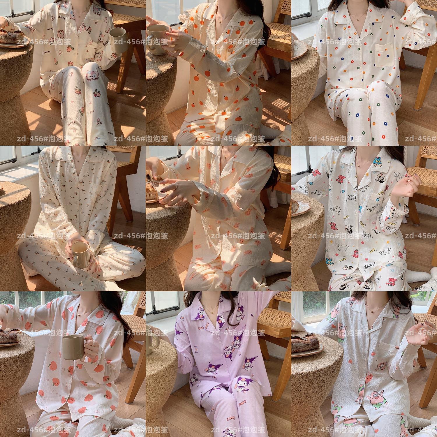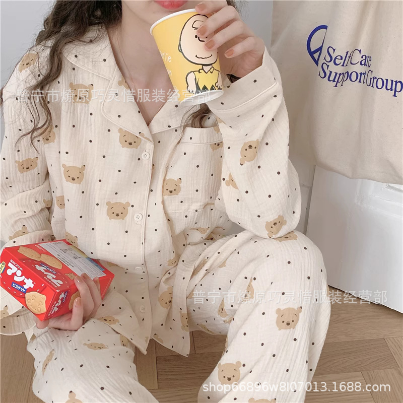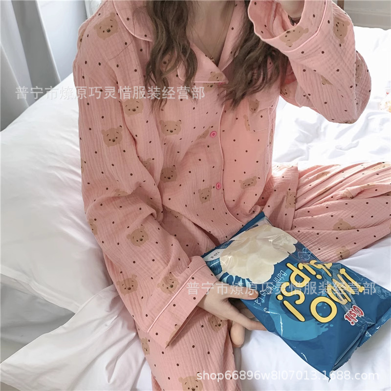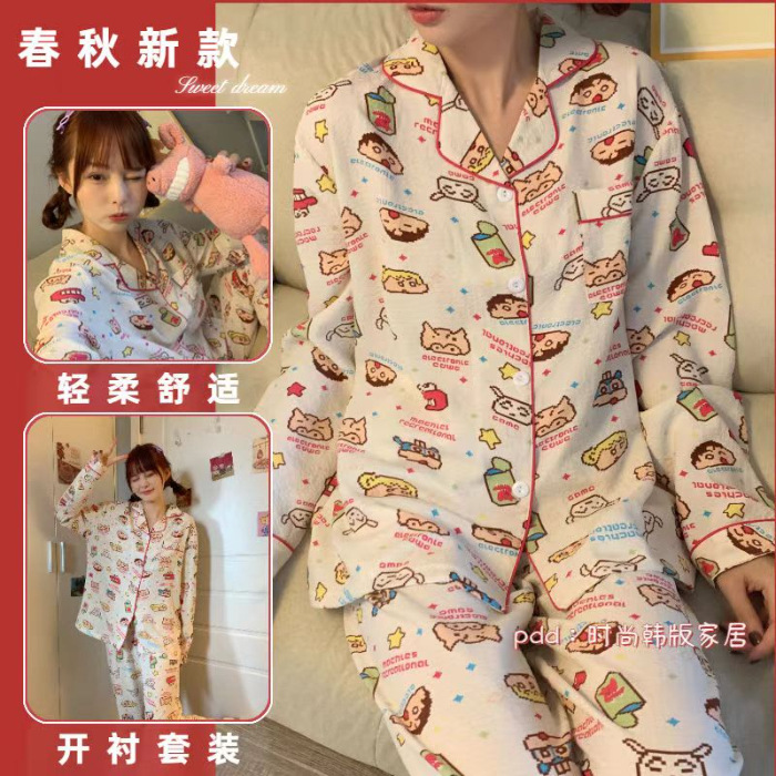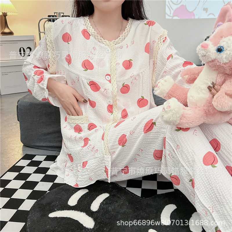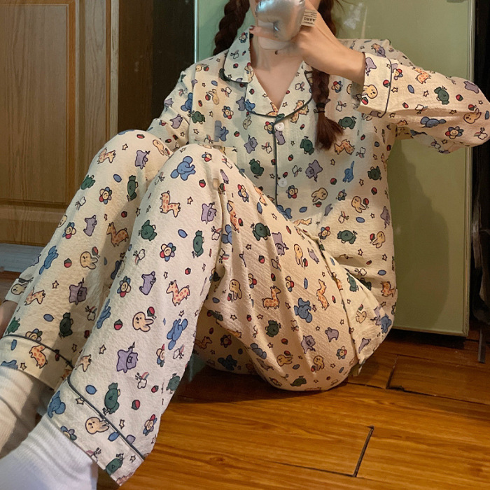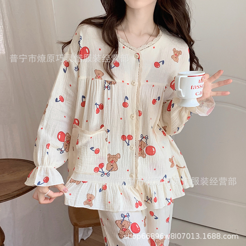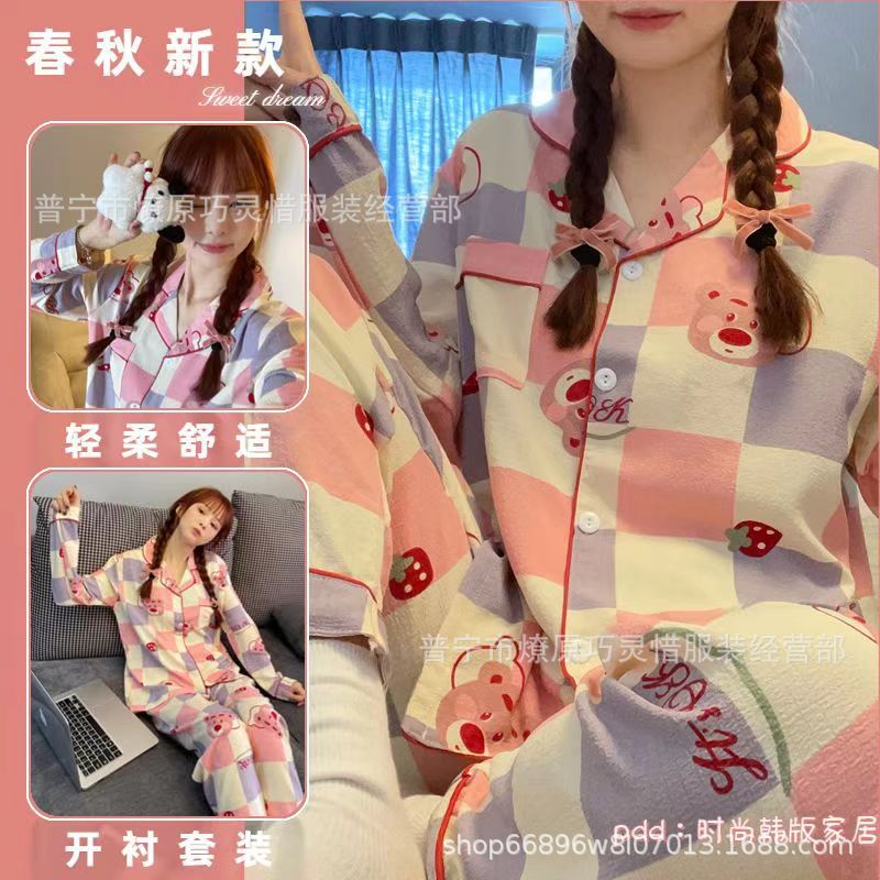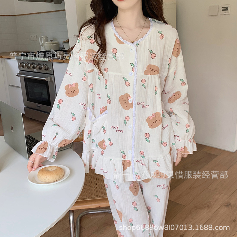 잠옷 여성의 봄과 가을 짠 폼 코튼 주름 긴 소매 만화 공주 스타일 의상 홈 의류 세트스토어 가기