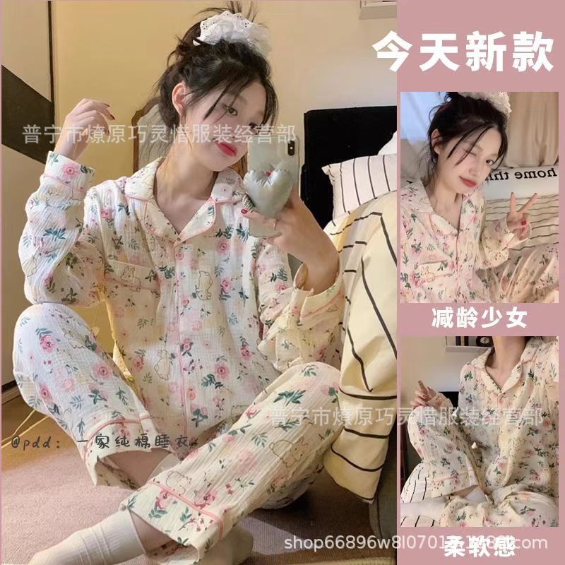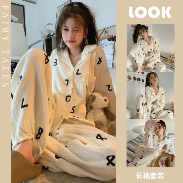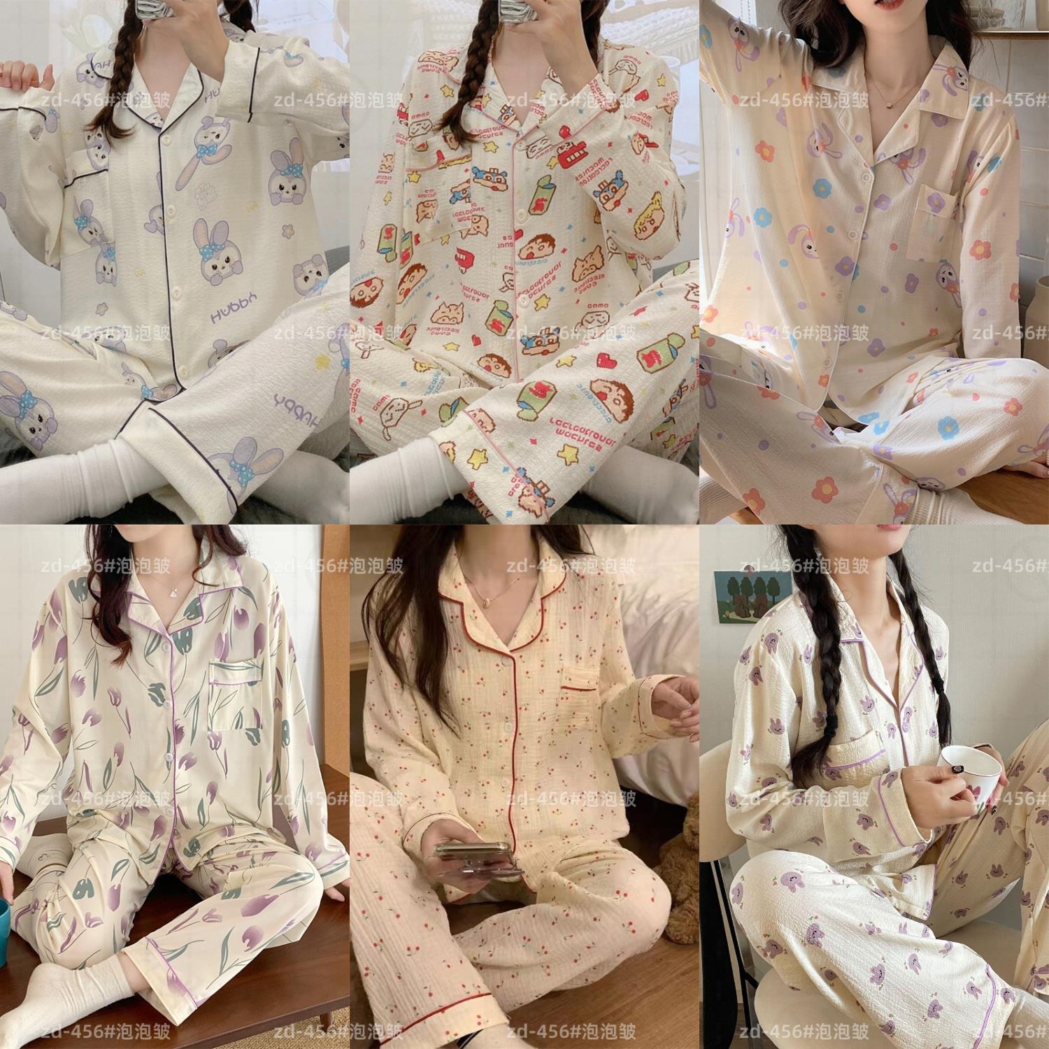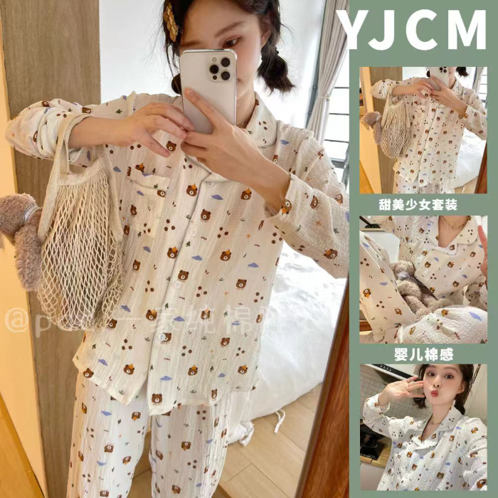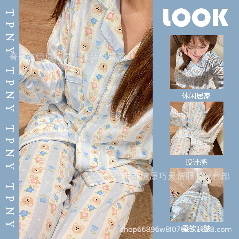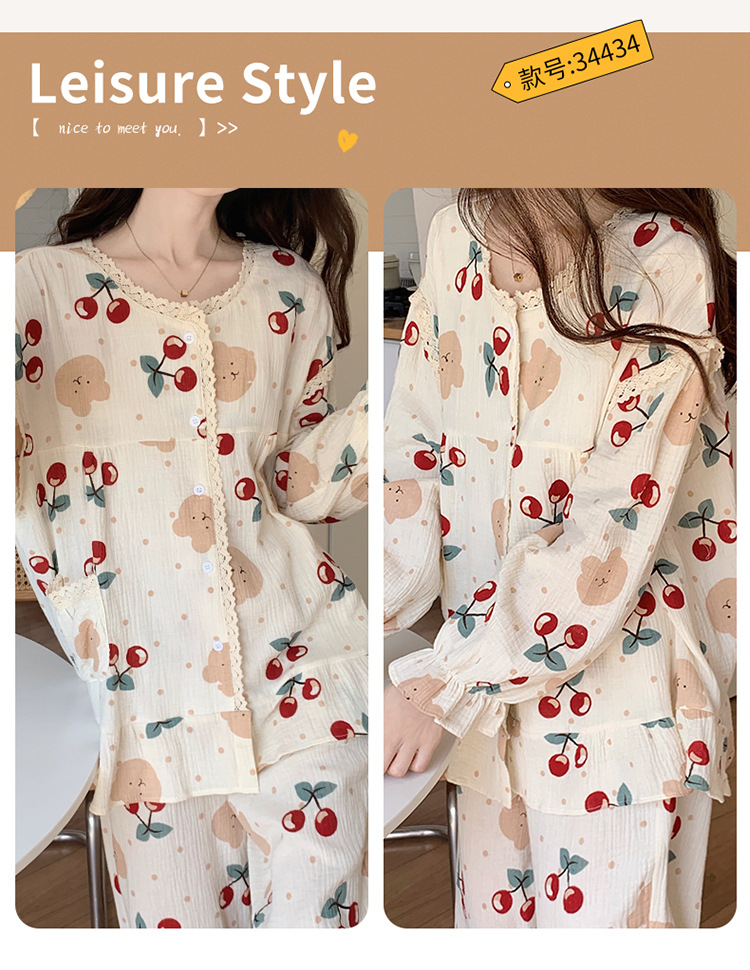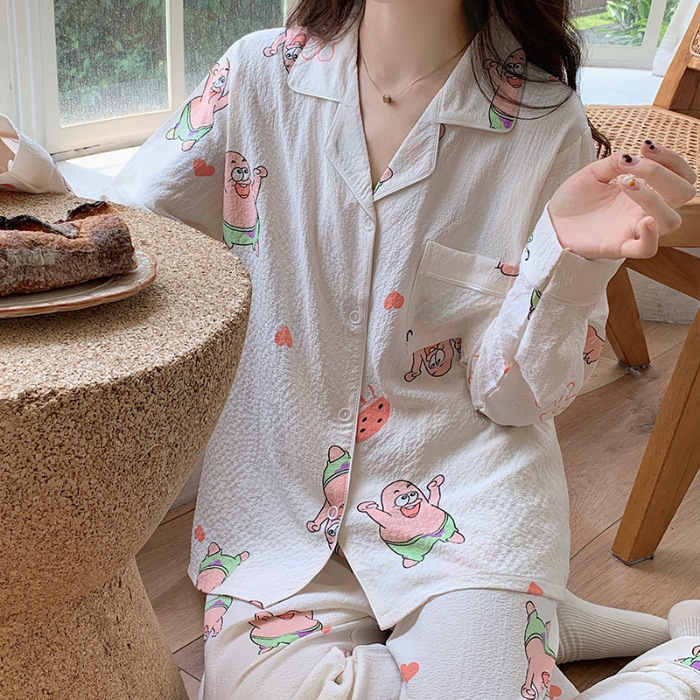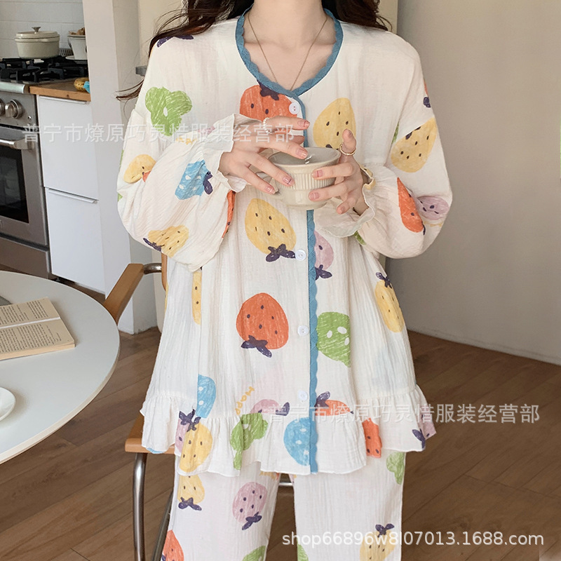 잠옷 여성의 봄과 가을 짠 폼 코튼 주름 긴 소매 만화 공주 스타일 의상 홈 의류 세트스토어 가기