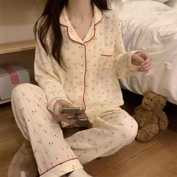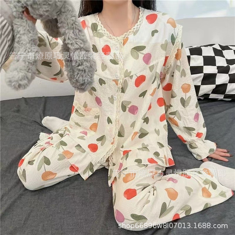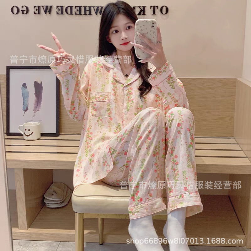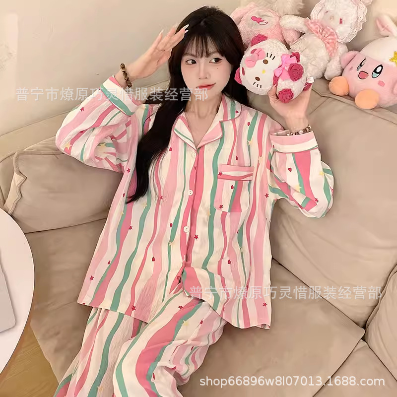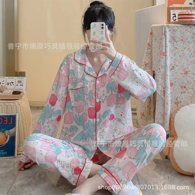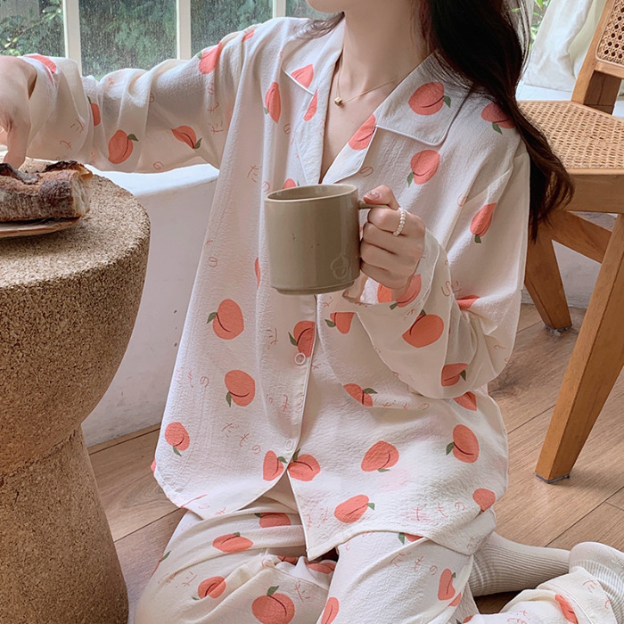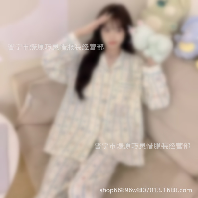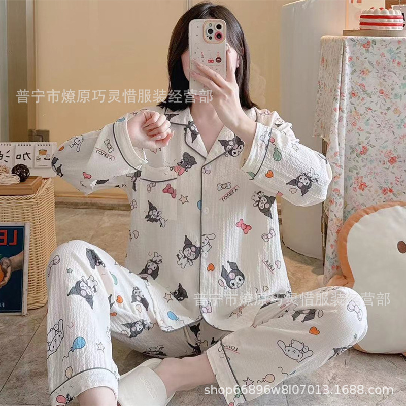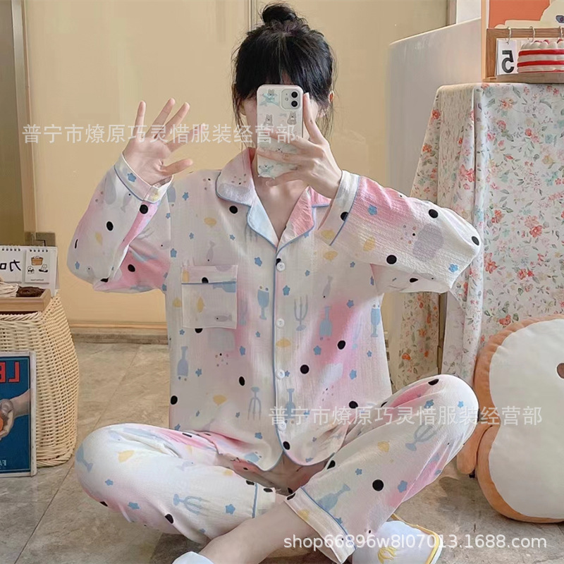 잠옷 여성의 봄과 가을 짠 폼 코튼 주름 긴 소매 만화 공주 스타일 의상 홈 의류 세트스토어 가기