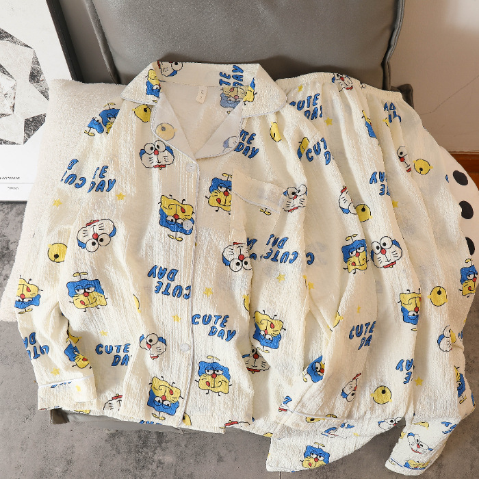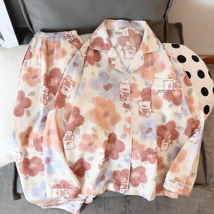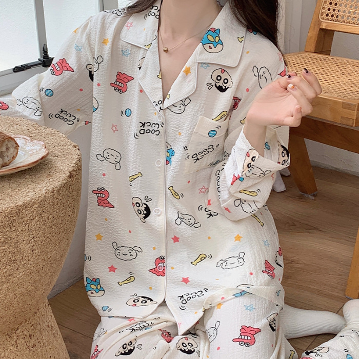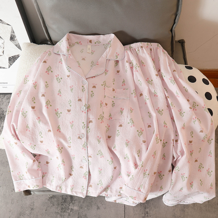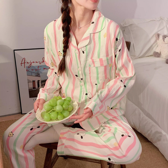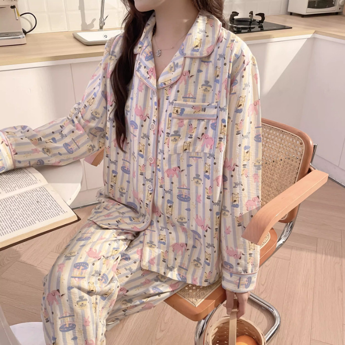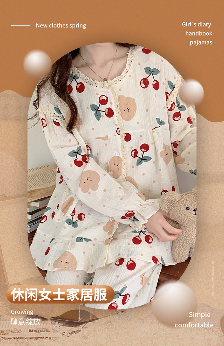 잠옷 여성의 봄과 가을 짠 폼 코튼 주름 긴 소매 만화 공주 스타일 의상 홈 의류 세트