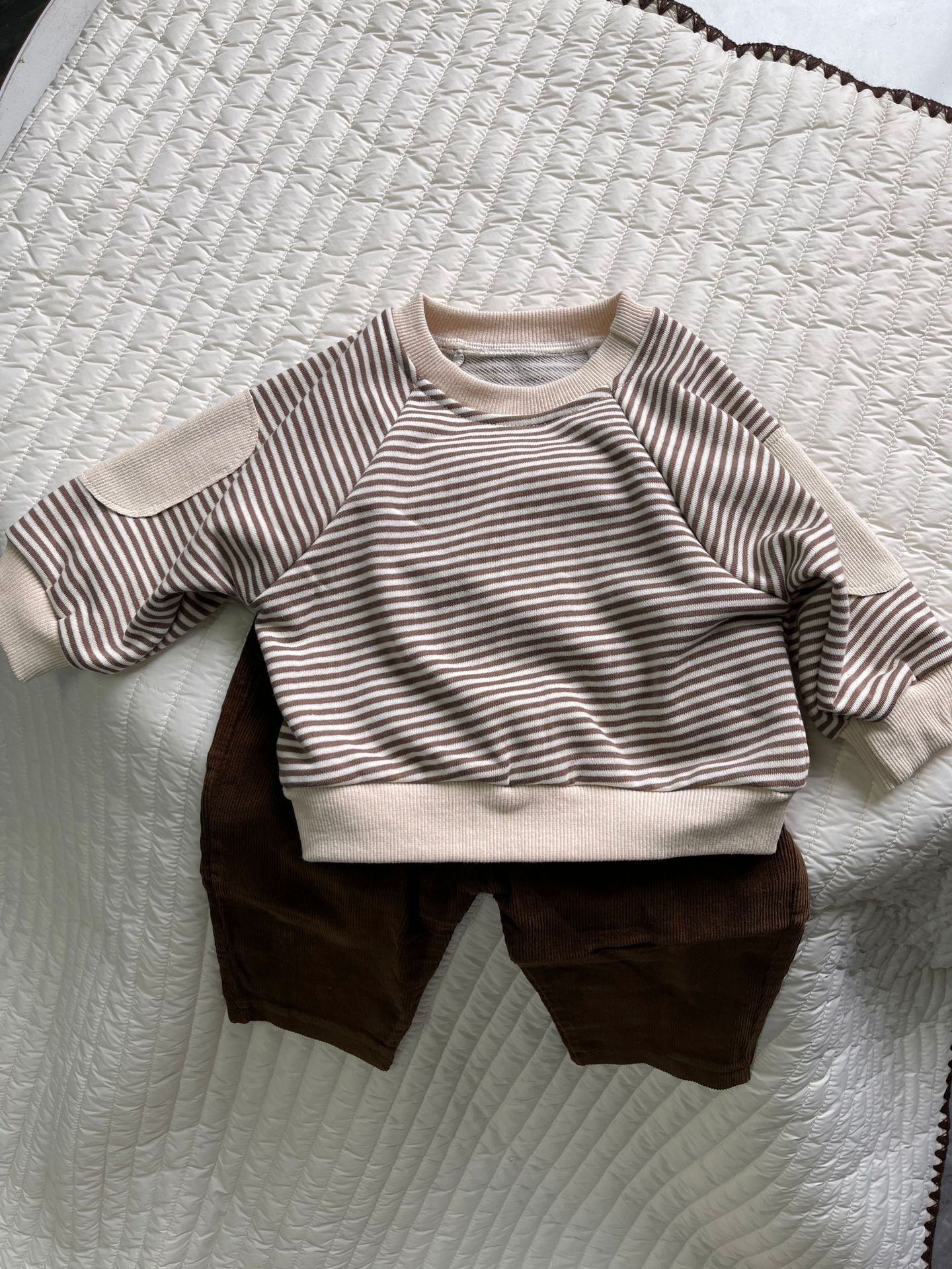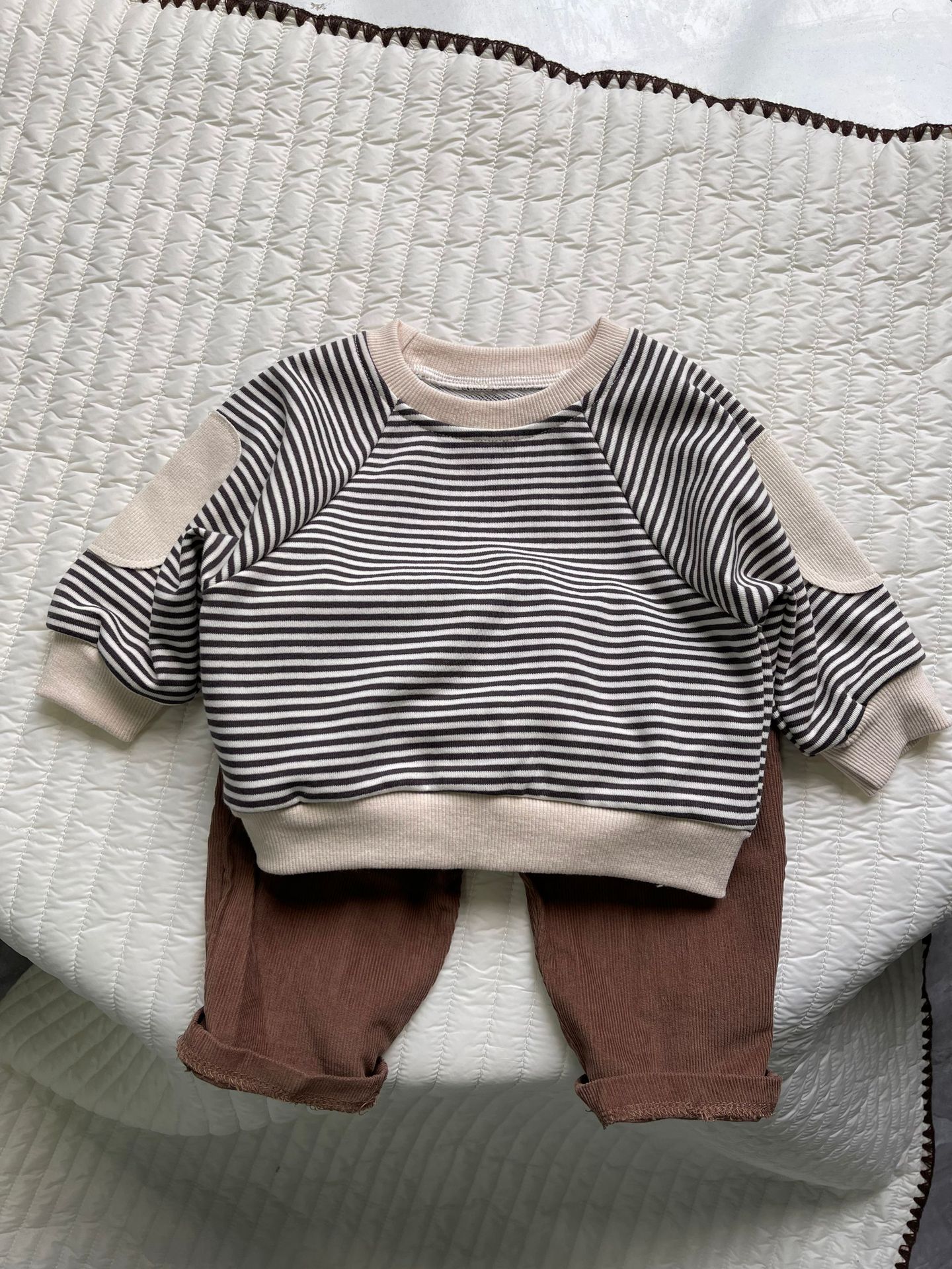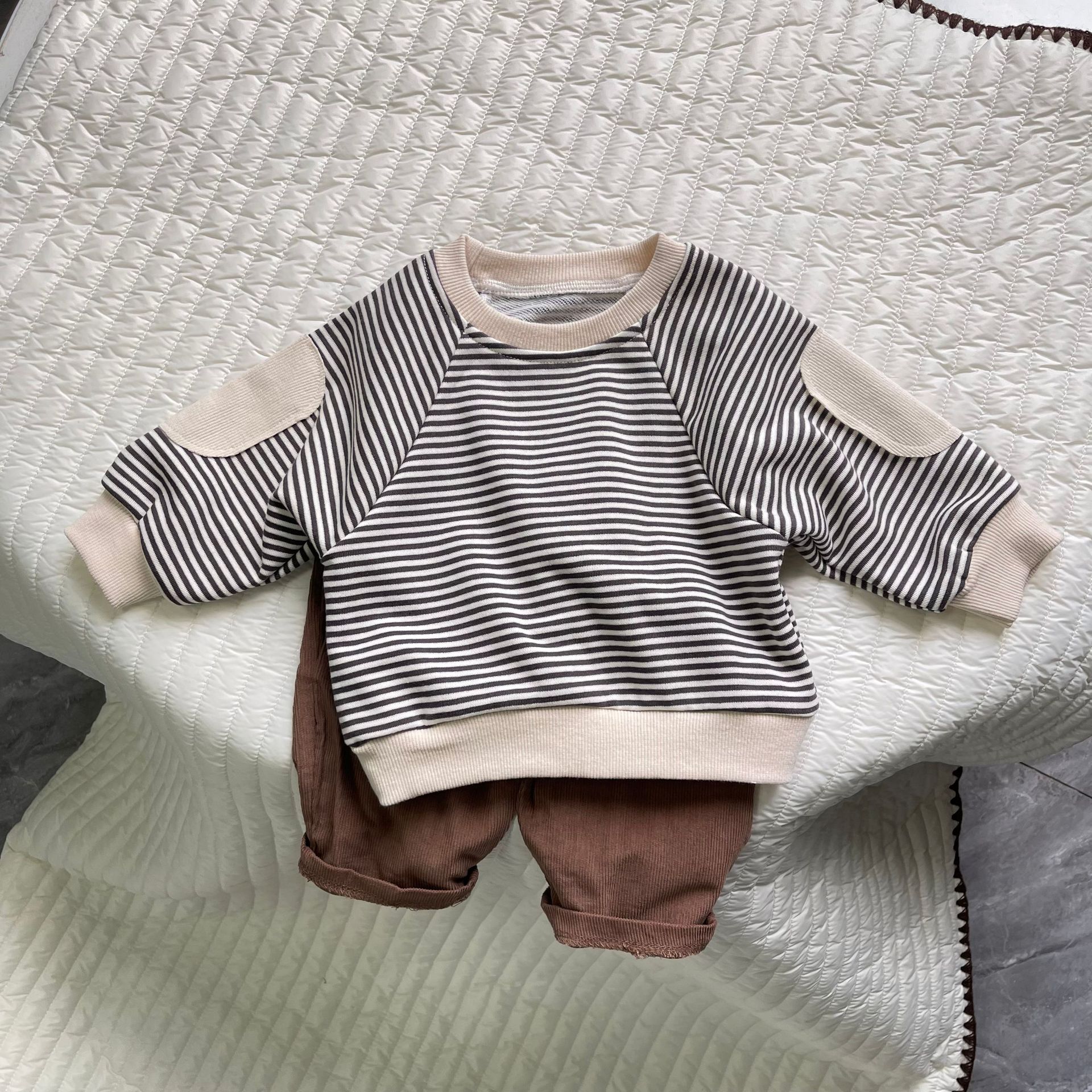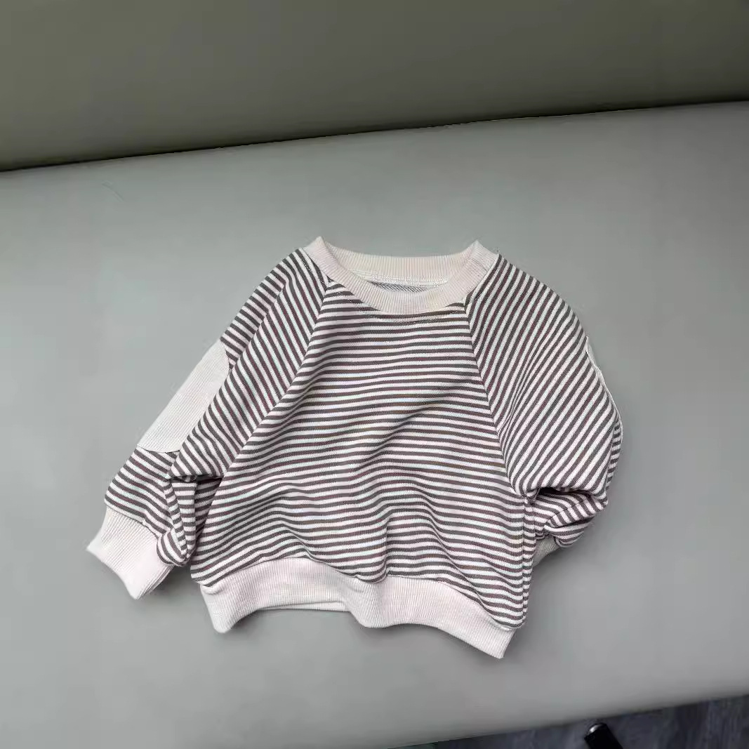 새로운 한국 스타일 어린이 서양식 줄무늬 스웨트 셔츠 남성과 여성의 봄과 가을 어린이 패치 박쥐 슬리브 긴 소매 티셔츠 스웨트 셔츠