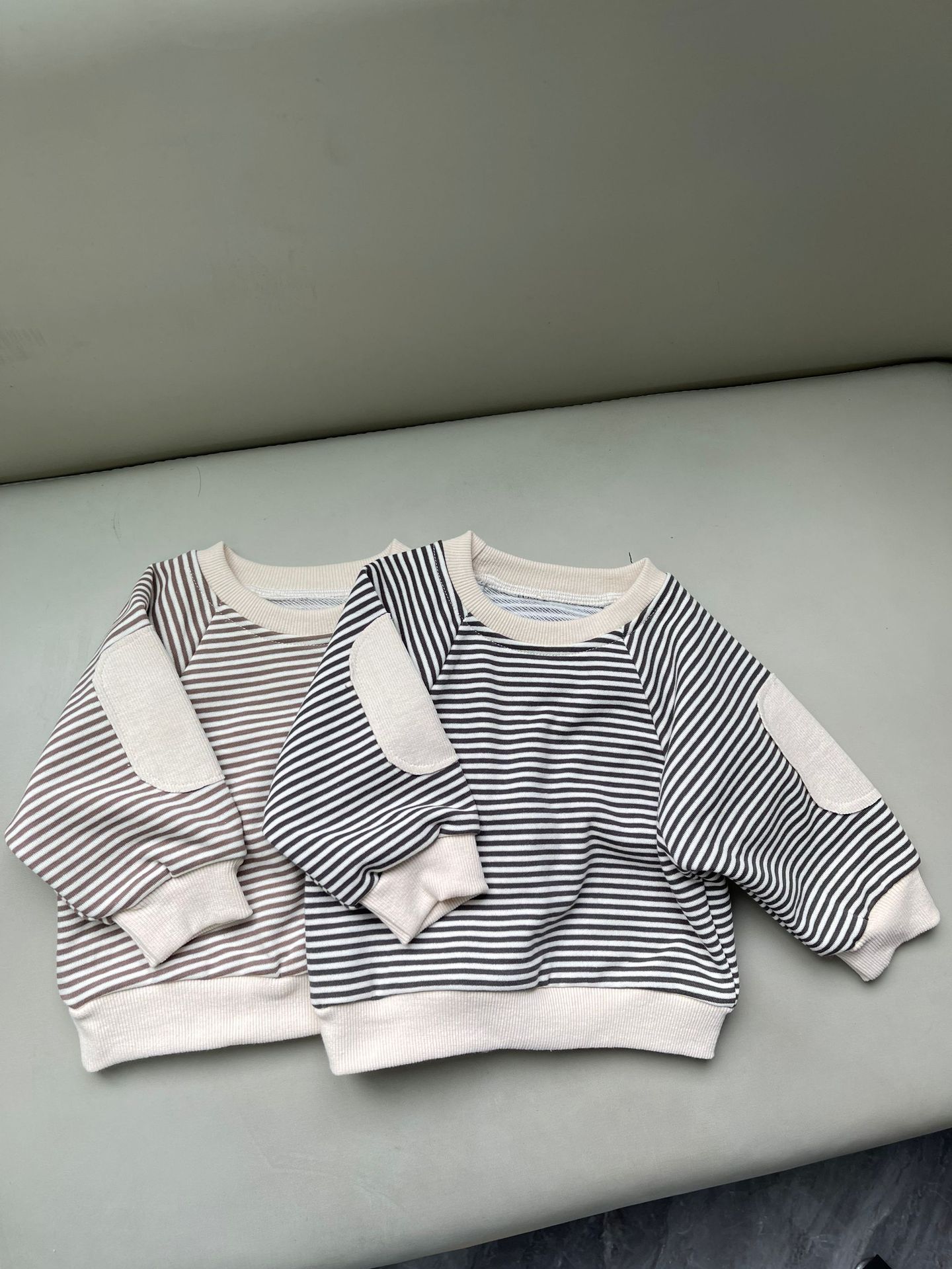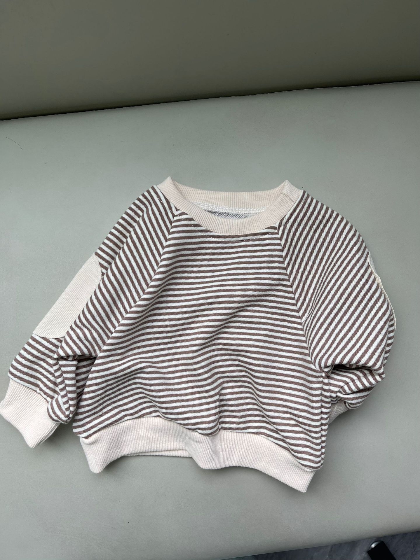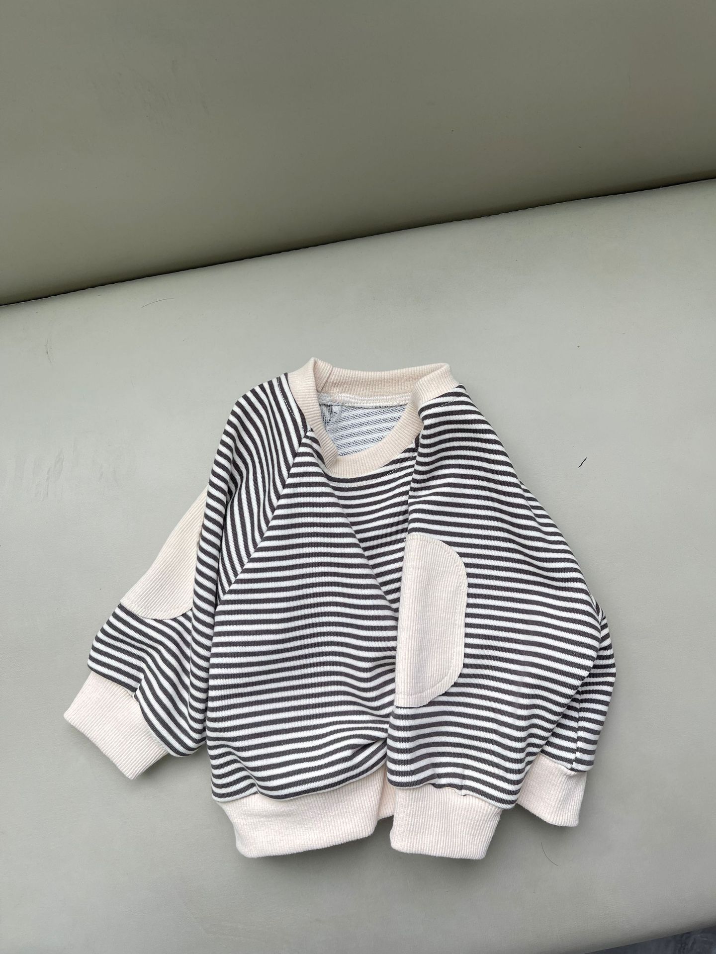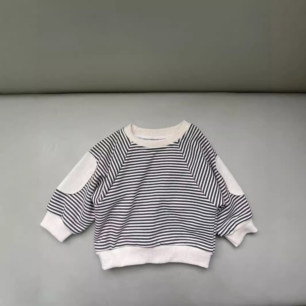 새로운 한국 스타일 어린이 서양식 줄무늬 스웨트 셔츠 남성과 여성의 봄과 가을 어린이 패치 박쥐 슬리브 긴 소매 티셔츠 스웨트 셔츠스토어 가기