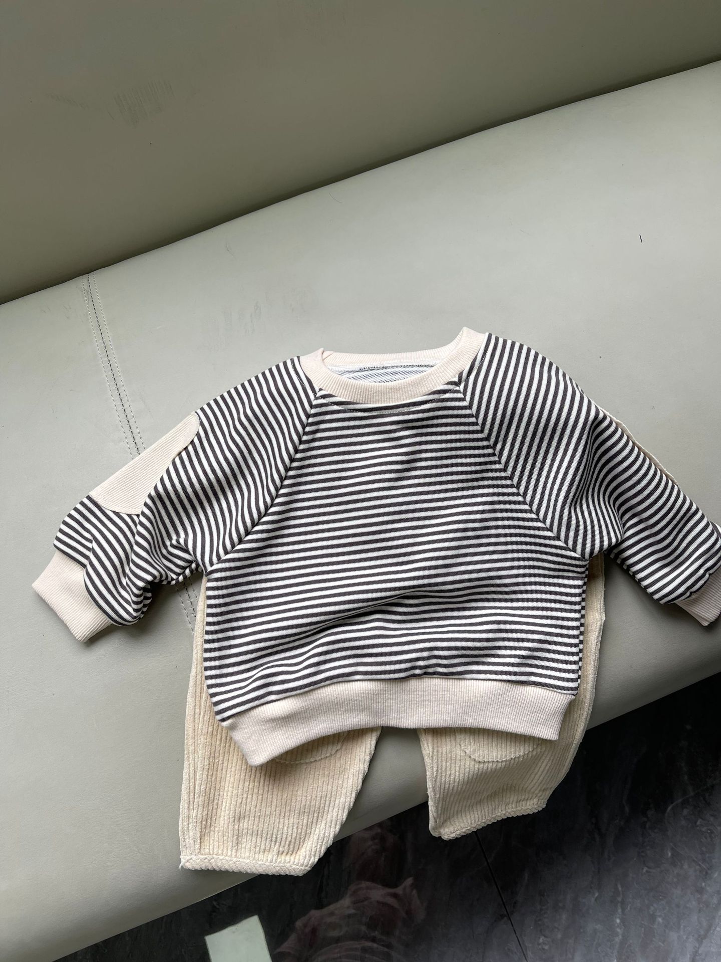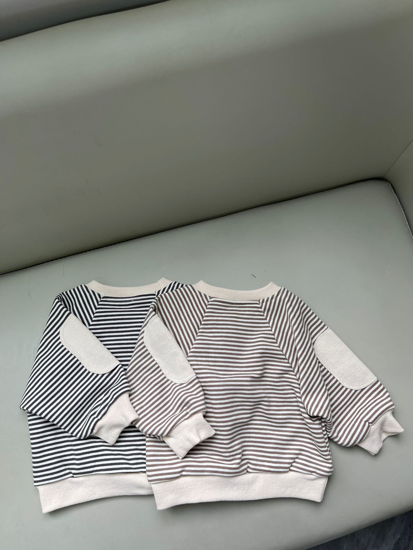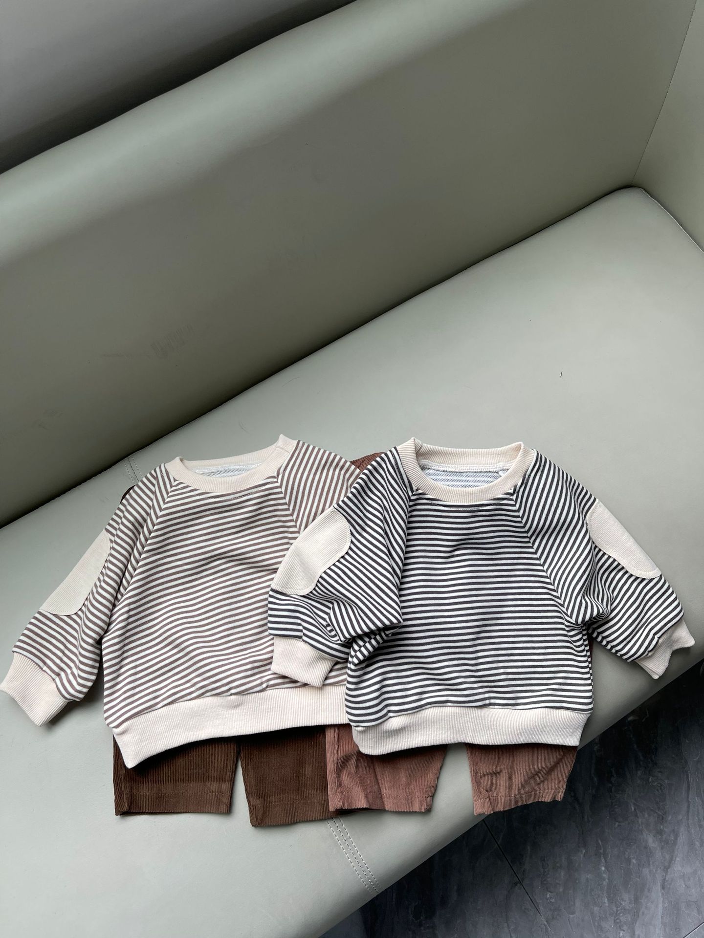 새로운 한국 스타일 어린이 서양식 줄무늬 스웨트 셔츠 남성과 여성의 봄과 가을 어린이 패치 박쥐 슬리브 긴 소매 티셔츠 스웨트 셔츠스토어 가기