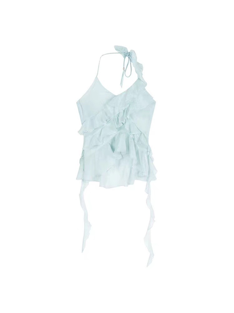 블루 러플 넥 카미 솔 여성용 여름 슬림 불규칙한 아름다운 퓨어 쇼트 탑