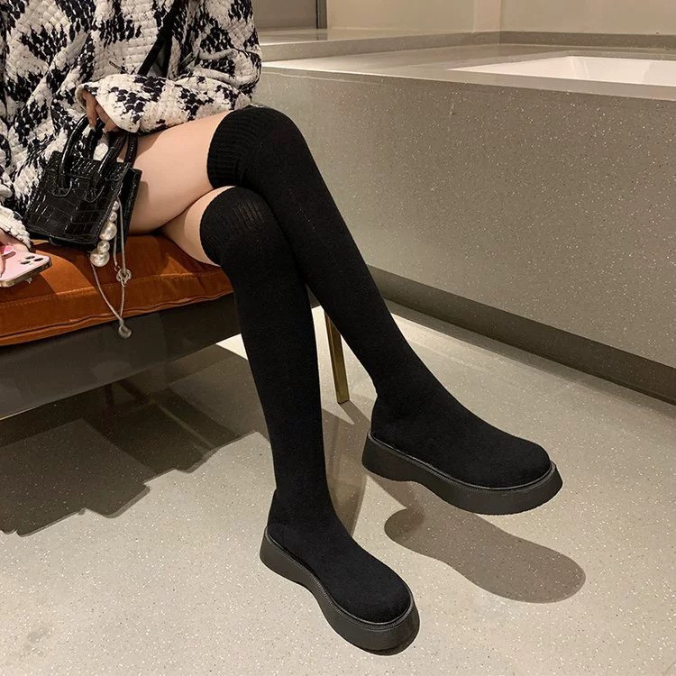 여성용 무릎 위 부츠 2024 여성용 새로운 두꺼운 밑창 검은 색 슬림 부츠 작은 개인 니트 스트레치 양말 부츠스토어 가기